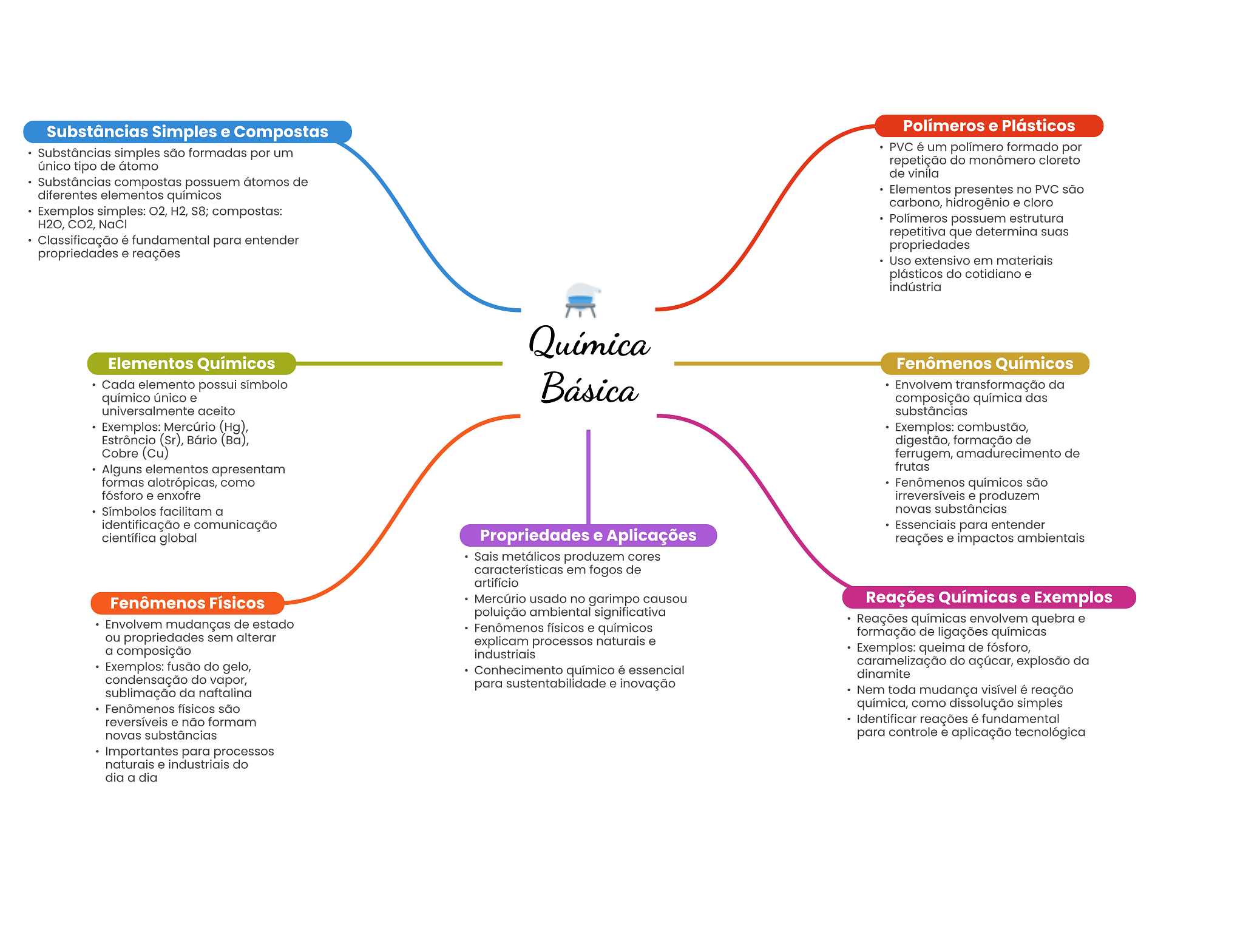 Substâncias Simples e Compostas Polímeros e Plásticos Substâncias simples são formadas por um PVC é um polímero formado por único tipo de átomo repetição do monômero cloreto de vinila Substâncias compostas possuem átomos de diferentes elementos químicos Elementos presentes no PVC são carbono, hidrogênio e cloro Exemplos simples: O2, H2, S8; compostas: CO2, NaCl Polímeros possuem estrutura repetitiva que determina suas Classificação é fundamental para entender propriedades propriedades e reações Uso extensivo em materiais plásticos do cotidiano e indústria Química Elementos Químicos Fenômenos Químicos Cada elemento possui símbolo Básica Envolvem transformação da químico único e composição química das universalmente aceito substâncias Exemplos: Mercúrio (Hg), Exemplos: combustão, Estrôncio (Sr), Bário (Ba), digestão, formação de Cobre ferrugem, amadurecimento de Alguns elementos apresentam frutas formas alotrópicas, como Fenômenos químicos são fósforo e enxofre irreversíveis e produzem Símbolos facilitam a novas substâncias identificação e comunicação Essenciais para entender científica global Propriedades e Aplicações reações e impactos ambientais Sais metálicos produzem cores características em fogos de artifício Fenômenos Físicos Mercúrio usado no garimpo causou Reações Químicas e Exemplos poluição ambiental significativa Envolvem mudanças de estado Reações químicas envolvem quebra e Fenômenos físicos e químicos ou propriedades sem alterar formação de ligações químicas explicam processos naturais e a composição industriais Exemplos: queima de fósforo, Exemplos: fusão do gelo, caramelização do açúcar, explosão da Conhecimento químico é essencial dinamite condensação do vapor, para sustentabilidade e inovação sublimação da naftalina Nem toda mudança visível é reação Fenômenos físicos são química, como dissolução simples reversíveis e não formam Identificar reações é fundamental novas substâncias para controle e aplicação tecnológica Importantes para processos naturais e industriais do dia a dia