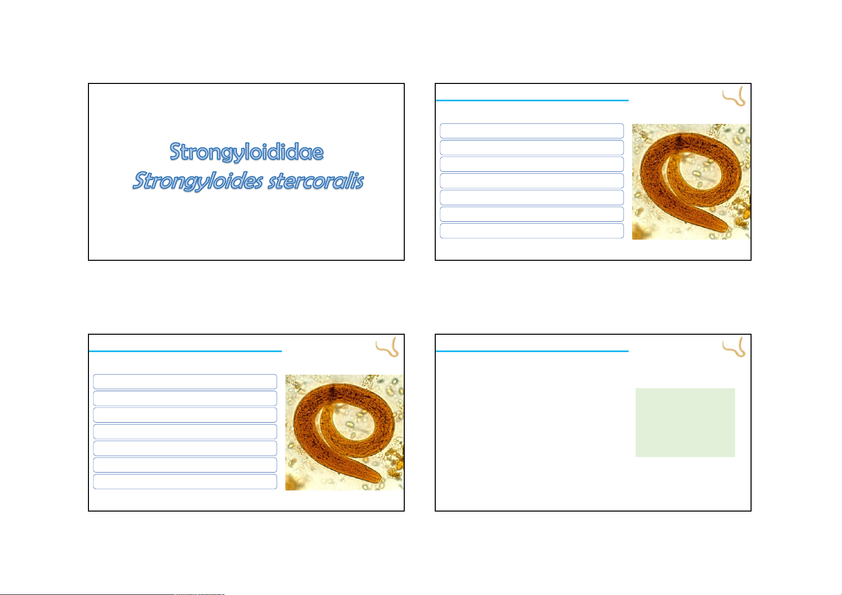01/04/2026 1 44 Nematódeos – Profa. Luanne EugêniaDIVULGAÇÃO NÃO AUTORIZADA PELA DOCENTE. CARACTERISTICAS GERAIS Estrongiloidose, anguilulose Geo-helmintose Distribuição geográfica mundial (Cosmopolita) Comum nas áreas rurais Doença de caráter oportunista (imunodeprimidos) 30 – 100 milhões de pessoas (5,5 milhões no Brasil) Homem à cão, gatos e macacos 45 Nematódeos – Profa. Luanne EugêniaDIVULGAÇÃO NÃO AUTORIZADA PELA DOCENTE. CARACTERISTICAS GERAIS Habitam o intestino delgado Facilidade de transmissão Caráter de cronicidade Autoinfecção Formas graves de hiperinfecção e disseminação Reagudização em imunodeprimidos Doença negligenciada (3,9 milhões Sudeste) 46 Nematódeos – Profa. Luanne EugêniaDIVULGAÇÃO NÃO AUTORIZADA PELA DOCENTE. MORFOLOGIA -VIDA PARASITÁRIA Fêmeas partenogenéticas (2mm) Produção de ovos embrionados (Larvas L1) -VIDA LIVRE L1 – L2 – L3 – L4 – Adultos jovens – Adultos (dióicos) FORMAS EVOLUTIVAS: üFêmea partenogenética üFêmea de vida livre üMacho de vida livre üOvos üLarvas rabiditoides üLarvas filariooides 47 01/04/2026 2 Nematódeos – Profa. Luanne EugêniaDIVULGAÇÃO NÃO AUTORIZADA PELA DOCENTE. MORFOLOGIA L3 48 Nematódeos – Profa. Luanne EugêniaDIVULGAÇÃO NÃO AUTORIZADA PELA DOCENTE. MORFOLOGIA Possui cerca 0,7 mm Cauda encurvada Possui cerca 1,5 mm Cauda afilada 49 Nematódeos – Profa. Luanne EugêniaDIVULGAÇÃO NÃO AUTORIZADA PELA DOCENTE. MORFOLOGIA 50 Nematódeos – Profa. Luanne EugêniaDIVULGAÇÃO NÃO AUTORIZADA PELA DOCENTE. TRANSMISSÃO HABITAT: Intestino delgado (duodeno e jejuno) TRANSMISSÃO: Penetração de larvas filarioides presentes no solo através da pele do homem Autoinfecção interna e externa 51 01/04/2026 3 Nematódeos – Profa. Luanne EugêniaDIVULGAÇÃO NÃO AUTORIZADA PELA DOCENTE. CICLO BIOLÓGICO MONOXENO: Direto ou indireto FORMA PARASITÁRIA: Fêmea adulta partenogenética (ovos embrionados) à eclodem à liberam larva rabditoide (eliminada nas fezes) 52 Nematódeos – Profa. Luanne EugêniaDIVULGAÇÃO NÃO AUTORIZADA PELA DOCENTE. PATOGENIA Manifestações cutâneas: placas ou pontos avermelhados no local da penetração Manifestações pulmonares: Síndrome de Löeffler, lesões avermelhadas, pneumonia (Agravo) Manifestações intestinais: diarreia, constipação, dores abdominais, perda de apetite, náuseas, vômitos, anemia, perda de peso, fraqueza, desidratação, irritabilidade Eosinofilia: 15 – 40% 53 Nematódeos – Profa. Luanne EugêniaDIVULGAÇÃO NÃO AUTORIZADA PELA DOCENTE. PATOGENIA 54 Nematódeos – Profa. Luanne EugêniaDIVULGAÇÃO NÃO AUTORIZADA PELA DOCENTE. DIAGNÓSTICO CLÍNICO: impreciso LABORATORIAL: ü exame de fezes (larvas*), coprocultura, pesquisa de larvas no escarro, testes imunológicos ü Método de Rugai e Baerman-Moraes 55 01/04/2026 4 56 Nematódeos – Profa. Luanne EugêniaDIVULGAÇÃO NÃO AUTORIZADA PELA DOCENTE. ANCILOSTOMOSE: Doença conhecida como amarelão ou Jeca Tatu RESERVATÓRIO: Homem CICLO: Fecal - dérmico CARACTERISTICAS GERAIS 57 Nematódeos – Profa. Luanne EugêniaDIVULGAÇÃO NÃO AUTORIZADA PELA DOCENTE. Vermes pequenos (1 cm) Capsula bucal característica: dentes ou lâminas Não é possível diferenciar os ovos pelo exame parasitológico de fezes CARACTERISTICAS GERAIS Ancylostoma duodenale – Clima temperado Necator americanos - Clima tropical 58 Nematódeos – Profa. Luanne EugêniaDIVULGAÇÃO NÃO AUTORIZADA PELA DOCENTE. Os vermes adultos apresentam a região anterior do corpo ligeiramente encurvada MORFOLOGIA Ancylostoma duodenale Necator americanus Bolsa copuladora - macho 59 01/04/2026 5 Nematódeos – Profa. Luanne EugêniaDIVULGAÇÃO NÃO AUTORIZADA PELA DOCENTE. Ovos elípticos e possuem uma membrana transparente (única) MORFOLOGIA Ancylostoma duodenale Necator americanus 60 Nematódeos – Profa. Luanne EugêniaDIVULGAÇÃO NÃO AUTORIZADA PELA DOCENTE. Habitat: duodeno – preso à mucosa por meio da cápsula bucal TRANSMISSÃO Ancylostoma duodenale Necator americanus TRANSMISSÃO: I - pela penetração da larva L3 na pele, quando em contato com qualquer parte do corpo; II - por ingestão da larva L3 com água ou verduras cruas mal lavadas contaminadas 61 Nematódeos – Profa. Luanne EugêniaDIVULGAÇÃO NÃO AUTORIZADA PELA DOCENTE. CICLO BIOLÓGICO ü As larvas L3 penetram na pele e atingem a corrente sanguínea passando pelo fígado e pulmões, de onde se dirigem para os alvéolos e mudam para L4, sobem até a faringe, podendo ser expectoradas ou deglutidas. ü Nesse caso, passam pelo trato digestório e chegam ao intestino delgado, onde mudam para adultos jovens. ü Em seguida, formam os órgãos sexuais, tornando-se aptos a se reproduzirem. 62 Nematódeos – Profa. Luanne EugêniaDIVULGAÇÃO NÃO AUTORIZADA PELA DOCENTE. üInvasão cutânea: assintomática, exceto quando o número de vermes infectantes é muito alto. üMigracçãa pulmonar: em geral assintomática, Síndrome de Löeffler üParasitismo intestinal: lesões na mucosa intestinal, anorexia, náuseas, vômitos, cólicas, diarreia, febre, cansaço e perda de peso üComplicações: quadro de ulcera duodenal ou apendicite em infecções maciças em indivíduos subnutridos PATOGENIA Ancylostoma duodenale Necator americanus 63 01/04/2026 6 Nematódeos – Profa. Luanne EugêniaDIVULGAÇÃO NÃO AUTORIZADA PELA DOCENTE. PATOGENIA Ancylostoma duodenale Necator americanus Espoliação sanguínea N. americanus: 0,03-0,06 mL de sangue/dia/verme A. duodenale: 0,15-0,30 mL de sangue/dia/verme 100 - 1.000 vermes: até 30mL/dia (15 mg de ferro) Consequências: anemia, hipoproteinemia, dilatação do coração, lesões hepáticas e renais, óbito 64 Nematódeos – Profa. Luanne EugêniaDIVULGAÇÃO NÃO AUTORIZADA PELA DOCENTE. Infecção crônica: anemia, palidez, cansaço, desânimo, fraqueza, tonturas, cefaleia, dores musculares Anemia crônica: palpitações, falta de ar e insuficiência cardíaca, óbito PA