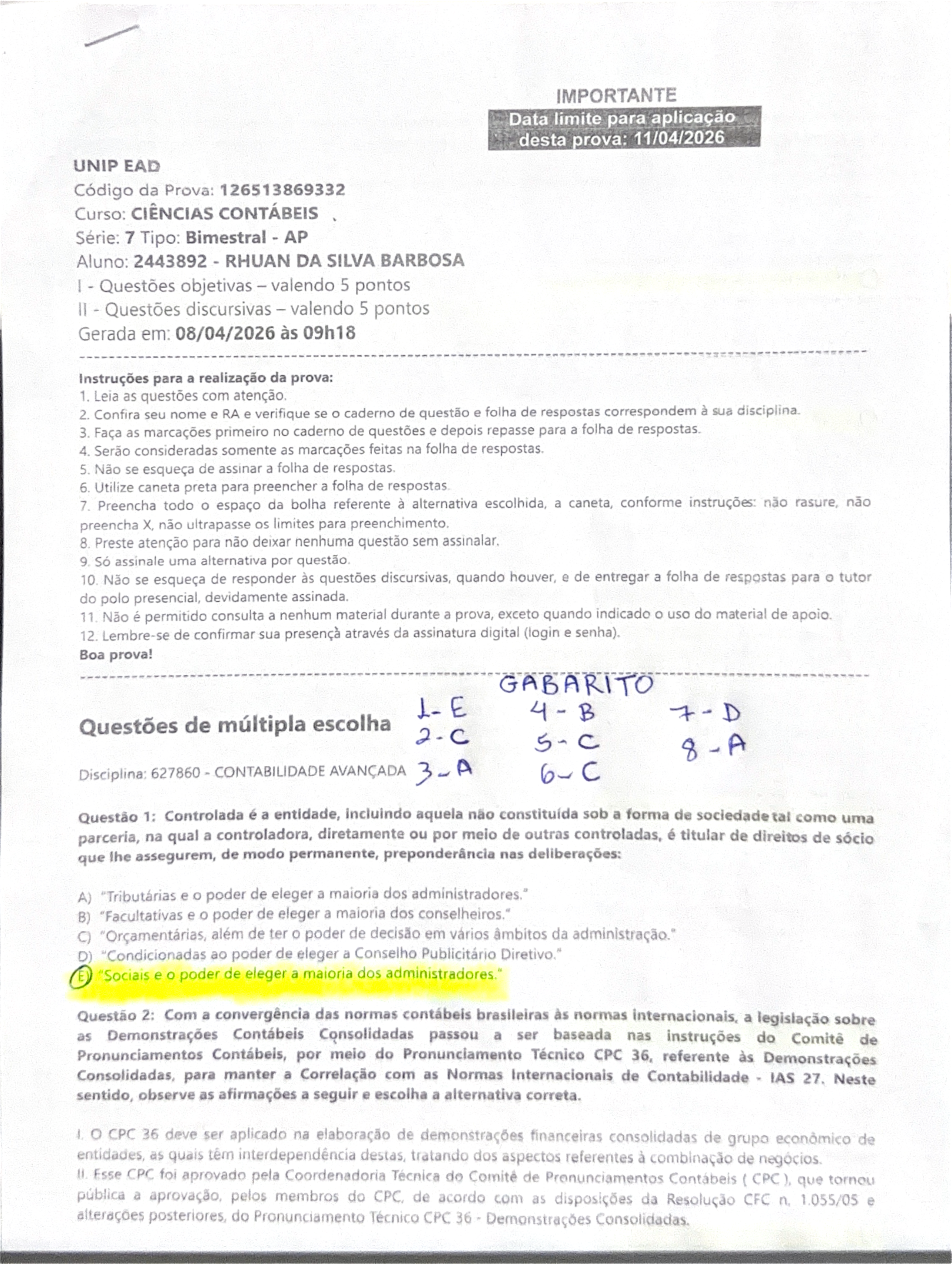 IMPORTANTE Data limite para aplicação desta prova: 11/04/2026 UNIP EAD Código da Prova: 126513869332 Curso: CIÊNCIAS CONTÁBEIS Série: 7 Tipo: Bimestral AP Aluno: 2443892 RHUAN DA SILVA BARBOSA I Questões objetivas valendo 5 pontos Questões discursivas valendo 5 pontos Gerada em: 08/04/2026 às 09h18 Instruções para a realização da prova: 1. Leia as questões com atenção. 2. Confira seu nome e RA e verifique se caderno de questão e folha de respostas correspondem à sua disciplina. 3. Faça as marcações primeiro no caderno de questões e depois repasse para a folha de respostas. 4. Serão consideradas somente as marcações feitas na folha de respostas. 5. Não se esqueça de assinar a folha de respostas. 6. Utilize caneta preta para preencher a folha de respostas. 7. Preencha todo espaço da bolha referente à alternativa escolhida, a caneta, conforme instruções: não rasure, não preencha X, não ultrapasse os limites para preenchimento. 8. Preste atenção para não deixar nenhuma questão sem assinalar. 9. Só assinale uma alternativa por questão. 10. Não se esqueça de responder às questões discursivas, quando houver, e de entregar a folha de respostas para tutor do polo presencial, devidamente assinada. 11. Não é permitido consulta a nenhum material durante a prova, exceto quando indicado uso do material de apoio. 12. Lembre-se de confirmar sua presençà através da assinatura digital (login e senha). Boa prova! GABARITO L-E 7-D Questões de múltipla escolha 8-A Disciplina: 627860 CONTABILIDADE AVANÇADA 3-A 6-C Questão 1: Controlada é a entidade, incluindo aquela não constituída sob a forma de sociedade tal como uma parceria, na qual a controladora, diretamente ou por meio de outras controladas, é titular de direitos de sócio que assegurem, de modo permanente, preponderância nas deliberações: A) "Tributárias e o poder de eleger a maioria dos administradores." B) "Facultativas e poder de eleger a maioria dos conselheiros." C) "Orçamentárias, além de ter poder de decisão em vários âmbitos da administração." D) "Condicionadas ao poder de eleger a Conselho Publicitário Diretivo." Sociais e poder de eleger a maioria dos administradores." Questão 2: Com a convergência das normas contábeis brasileiras às normas internacionais, a legislação sobre as Demonstrações Contábeis Consolidadas passou a ser baseada nas instruções do de Pronunciamentos Contábeis, por meio do Pronunciamento Técnico CPC 36, referente às Demonstrações Consolidadas, para manter a Correlação com as Normas Internacionais de Contabilidade IAS 27. Neste sentido, observe as afirmações a seguir e escolha a alternativa correta. CPC 36 deve ser aplicado na elaboração de demonstrações financeiras consolidadas de grupo econômico de entidades, as quais têm interdependência destas, tratando dos aspectos referentes à combinação de negócios. Esse CPC foi aprovado pela Coordenadoria Técnica de Pronunciamentos Contábeis CPC), que tornou pública a aprovação, pelos membros do CPC, de acordo com as disposições da Resolução CFC n. 1.055/05 e alterações posteriores, do Pronunciamento Técnico CPC 36 Demonstrações Consolidadas.III. Pronunciamento foi elaborado a partir do IAS 27 Consolidated and Separate Financial Statements ), e sua no juigamento do Comitê, produz refiexos contábeis que estão em conformidade com documento editado pelo IV. recomenda que seja referendado pelas entidades reguladoras brasileiras, visando sua regularização. A) Apenas afirmação é B) Apenas as afirmações I e são afirmações e 111 são D) Apenas afirmação IV falsa, E) Apenes afirmações # IV são Questão Se valor de aquisição for superior valor pelos avaliadores como 9 valor de empresa, excedente será contabilizado custo do ativo B) valor recuperável C) valor de mercado D) perda do ativo E) negócio em conjunto Questão 4: Acerca dos aspectos de as proposições apresentadas e escolha a alternative Para que uma empresa seja controlada, é que a contreladora tenha o controle de outras e esse controle é poder de governar as e operacionais da empresa tida como de forma que obtenha benefício das suas atividades, ou seja, controladora toma decisões sobre as politicas da empresa considerada controlada, e essas vão gerer benefícios a empresa controladora. Uma regra é de que capital da não pertence totalmente à empresa controladora. Controlada é a entidade na quali a é titular de direitos de sócio que garantem, de modo decisões de sociedede poder de eleger dos IV. Controladora é uma entidade que tem uma ou mais V. Esses direitos de podem ser exercidos indiretamente por meio de outras controladas. A) as proposições III IV estão B) Apenas a proposição III está correte. Apenas a proposição está D) Apenas a proposição V está E) Apenas a proposição está correta. Questão 5: A Consolidação das Demonstrações Contábeis é uma técnica que permite identificar indices financeiros da empresa demais empresas grupo como se fossem uma única. Para elas devem: A) elaborar plano de sucessão B) ser microempresa elaborar demonstrações consolidadas D) participar de reuniões do setor E) abrir capital Questão 6: Quando ocorrer redução de participação em uma empresa que até então era consolidada e essa redução em exclusão desse empresa na consolidação, efeito decorrente desse fato deverá receber qual pela companhia, segundo CPC 36? A) a realização do registro antecipado B) registro do fato de forma subsequente a divulgação em nota explicativaD) a mensuração clara sobre limite estatutário E) a formalização da estratégia condicionada Questão 7: o luero ou prejuízo do período e cada componente dos outros resultados abrangentes são atribuídos aos proprietários da controladora e à participação dos não controladores. resultado abrangente total é atribuído aos proprietários da controladora e à participação dos não con