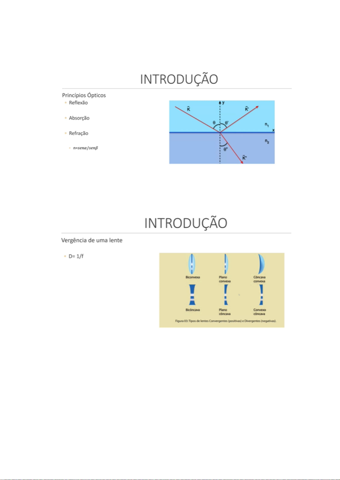 AULAS DE REFRAÇÃO refração - quando passa pra outra superfície tem outra velocidade e outra comprimento de onda – a frequência não se altera lente convergente – raio se aproxima lente divergente – raio se distancia a gente usa lentes para colocar a luz de refração onde a gente quer pessoa com maior grau, o foco da lente (f) está mais centralizado, por isso pessoas com miopia maior o olho fica menor Highlight Highlight lente divergente imagem virtual direta e menor capacidade que o olho tem de definir 2 pontos diferentes no olho córnea, cristalino e lagrima – são os componentes refrativos do olho - córnea tem 42 graus de refração - cristalino 21 graus de - alteração do diâmetro faz a imagem formar antes ou depois = maior causa de miopia e hipermetropia no país - lágrima faz refração da imagem também Highlight Highlight Highlight Highlight Highlight Highlight Highlight miopia – imagem formada anteriormente ao olho, não forma sofre retina - lente divergente hipermetropia – imagem formada posteriormente a retina – pq o cristalino ou córnea tem menor poder convergente – lente convergente astigmatismo – formação da imagem em dois pontos diferentes do olho maior causa de miopia é a axial – aumento do diâmetro ap – ocorre devido a cansaço da visão, olho pra não ficar cansado, “prefere ver de perto” e a visão de longe fica prejudicada catarata tbm pode causar miopia tem maior risco de descolamento de retina - Globo ocular maior, e retinas finas e frágeis - Mas isso é pra quem tem tipo 5 graus ou mais emetropia = capacidade do olho de formar imagem exata / ametropia = erros refrativos (difi. enxergar de longe) (imagem é formada em vários pontos) a retina, com consequente dificuldade visual para longe hipermetropia = imagem formada posteriormente ao olho, devido a redução do comprimento axial ou achatamento da córnea. Tem dificuldade de enxergar pra perto, mas a lente é feito para "perto", pra trazer a imagem pra frente. (LENTE + com maior grau possível) Highlight Highlight Highlight Highlight Highlight Highlight brincadeira outdoor fator protetor usar o menor grau possível pra atingir 20/20 atropina - tratamento off label alta miopia = 50% das causas de descolamento de retina retina cresce de acordo com o grau aumenta e pode estourar e decolar (igual uma borracha) miopia é tratável com prática de ativardes ao ar livre = pois a pessoa vai começar olhar pra longe e vai relaxar a musculatura ciliar míope = quanto mais grau da mais ele gosta, devido ao mecanismo de acomodação antes dos 5 anos até 1h depois dos 5 anos = no max 2h por dia (evitar principalmente a noite pq diminui a produção de melatonina) Highlight Highlight Highlight Highlight Highlight Highlight Highlight Highlight Highlight Highlight , maior grau possível pra maior relaxamento da musculatura ciliar relaxa a musculatura ciliar que foca a visao imagem é formada em mais de 1 ponto diferentes = formando sombras e borrões pessoa com hipermetropia e miopia = astigmatismo Highlight Highlight , 3 dificukdade de visão de perto devido a diminuição da forca da musculatura ciliar geralmente após 40 anos é crescente O óculos é prescrito pra PERTO MECANISMO DE ACOMODAÇÃO = Usado para visualizar a imagem de perto, e só de perto devemos utilizar! o grau de presbiopia é adicionado ao grau de hipermetropia já somado. Ex: pct tem 2, e precisa de 3 e presbiopia, no caso adiciona +1 Highlight Highlight acomodação acontece pq a imagem que estava sendo formada atrás da retina, a musculatura contrai, a zonula aumenta o diâmetro ap do cristalino pra imagem ser formada na retina ciliar - camadas da lagrima - lipídica (responsável por estabilizar/ não deixar a aquosa evaporar - vira inflamatória e aumenta ressecamento) Sd. do olho seco = uso de tela - aquosa - mucinosa (anti-corpos) a cada 1h de luz tirar 10min para olhar pra longe e a musculatura relaxar = evitar ressecamento BUT = Break-up time = exame para diagnosticar Sd do olho seco Highlight Highlight Highlight Highlight Highlight Highlight Highlight