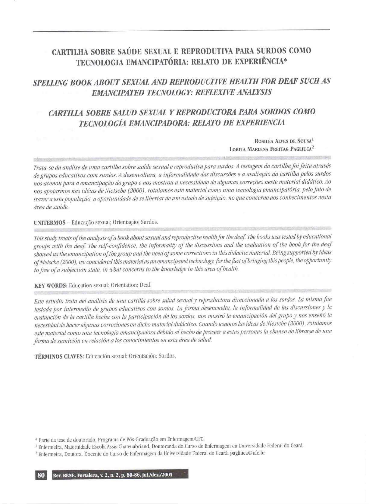 CARTILHA SOBRE SAÚDE SEXUAL E REPRODUTIVA PARA SURDOS COMO TECNOLOGIA EMANCIPATÓRIA: RELATO DE EXPERIÊNCIA* SPELLING BOOK ABOUT SEXUAL AND REPRODUCTIVE HEALTH FOR DEAF SUCH AS EMANCIPATED TECNOLOGY: REFLEXIVE ANALYSIS CARTILLA SOBRE SALUD SEXUAL Y REPRODUCTORA PARA SORDOS COMO TECNOLOGÍA EMANCIPADORA: RELATO DE EXPERIENCIA ROSILÉA ALVES DE LORITA MARLENA FREITAG PAGLIUCA² Trata-se da análise de uma sobre saúde sexual e reprodutiva para surdos. A testagem da cartilba foi feita através de grupos educativos com surdos. A desenvoltura, a informalidade das discussões e a avaliação da cartilba pelos surdos nos acenou para a emancipação do grupo e nos mostrou a necessidade de algumas correções neste material didático, Ao nos apoiarmos nas idéias de Nietsche (2000), rotulamos este material como uma tecnologia emancipatória, pelo fato de trazer a esta população, a oportunidade de se libertar de um estado de sujeição, no que concerne aos nesta área de saúde. UNITERMOS Educação sexual; Orientação; Surdos. This study treats of the analysis of a book about sexual and reproductive health for the deaf. The books was tested by educational groups with the deaf. The self-confidence, the informality of the discussions and the evaluation of the book for the deaf showed us the emancipation of the group and the need of some corrections in this didactic material. Being supported by ideas (2000), we concidered this material as an emancipated technology, for the fact of bringing this people, the opportunity to free of a subjection state, in what concerns to the knowledge in this area of KEY WORDS: Education sexual; Orientation; Deaf. Este estudio trata del análisis de una cartilla sobre salud sexual y reproductora direccionada a los sordos. La misma fue testada por intermedio de grupos educativos con sordos. La forma desenvuelta, la informalidad de las discursiones y la evaluación de la cartilla becha con la participación de los sordos, nos mostró la emancipación del grupo y nos enseñó la necesidad de bacer algunas correciones en dicho material didáctico. Cuando usamos las ideas de Niestche (2000), rotulamos este material como una tecnología emancipadora debido al becho de proveer a estas personas la chance de librarse de una forma de sumición en relación a los conocimientos en esta área de salud. TÉRMINOS CLAVES: Educación sexual; Sordos. * Parte da tese de doutorado, Programa de Pós-Graduação em Enfermagem/UFC. Enfermeira, Maternidade Escola Assis Chateuabriand, Doutoranda do Curso de Enfermagem da Universidade Federal do 2 Enfermeira, Doutora. Docente do Curso de Enfermagem da Universidade Federal do Ceará. pagliuca@ufc.br 80 Rev. RENE. Fortaleza, V. 2, n. 2, 80-86,INTRODUÇÃO Considera-se surda a pessoa que não ouve ou quase não ouve (FERREIRA, 1998). Pode ser classificado como A saúde sexual e reprodutiva é hoje uma preocupa- surdo total quando a sua audição não é funcional na vida ção mundial, pois envolve um dos aspectos mais importan- comum e parcialmente surdo, quando a audição, ainda que tes da vida humana. Em todos os povos e em todas as deficiente, é funcional com ou sem prótese auditiva (BRA- culturas, a sexualidade permeia as interações entre os se- SIL, 1997). res humanos e a partir dos papéis sexuais se percebe uma Apesar da imprecisão da definição, na nossa reali- complexa rede de influências na vida de cada pessoa. dade é significativo percentual de deficientes auditivos. Até há algum tempo, sexo era visto no contexto Segundo estimativa da Organização Mundial de Saúde, cer- da concepção, no entanto, hoje, 0 prazer antes reprimido ca de 15% da população brasileira, aproximadamente 2,2 vem a tona e a sexualidade deixa de ser relegada, passan- milhões, são portadoras de deficiência auditiva nos seus do a ser englobada entre as necessidades humanas, pois vários níveis (BRASIL, 1996), enquanto que informações, é clara a sua influência no bem estar da pessoa (GOZZO disponíveis na internet, são mais contundentes ao afirmar et al., 2000). que essa mesma Organização estima que a deficiência au- Dada a importância dessa temática, essa especiali- ditiva afeta 10% da população mundial e ainda que, no Brasil dade tem tido uma atenção especial, de forma que os servi- existam 15 milhões de pessoas com algum tipo de perda ços de saúde oferecem sistematicamente as chamadas ações auditiva. Desses, 350 mil são totalmente surdos (Correio de atenção em saúde sexual e reprodutiva que englobam: Brasiliense, 1997). prevenção do câncer ginecológico e diagnóstico precoce Convivemos com os surdos em nosso cotidiano, sem do câncer de mama, prevenção e tratamento das doenças no entanto, perceber as dificuldades que enfrentam para sexualmente transmissíveis, contracepção e tratamento da utilizar os recursos disponíveis no nosso ambiente. Não infertilidade conjugal e, ainda, acompanhamento pré-na- percebemos quão dependente estes se encontram do pou- tal. É importante lembrar que a atenção ofertada envolve CO que lhe ofertamos, seja no aspecto social, econômico além do acesso às ações propriamente ditas, um compo- ou de saúde. Provavelmente por este fato, Ahrebeck (1993) nente educativo que permite aos usuários não só recebe- afirma que os surdos sentem necessidade de se agrupar rem produto dessas ações, mas também estarem como forma de proteção por poderem, entre si, se comu- conscientes da sua necessidade e, por conseguinte, busca- nicar sem dificuldade. rem este tipo de atendimento. A condição de surdez tem sido um obstáculo na Concordamos com Sadik (1998), quando ressalta a municação deste grupo, pois 0 comprometimento na aqui- necessidade de mais e melhor educação e informação so- sição e desenvolvimento da linguagem representa, sem bre sexualidade, sobre como evitar a gravidez e as DST e qualquer dúvida, um grande prejuízo, já que dificulta respeitar os direitos dos 