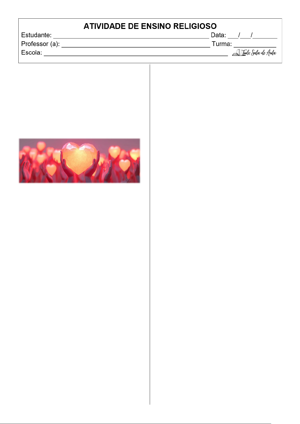 EMPATIA Ter empatia significa se colocar no lugar do outro, sentir o que outra pessoa sentiria caso estivesse na situação vivenciada por ela, e tentar compreender experiências e visões de mundo diferentes das suas. Apesar de engrandecedora, essa tarefa pode não ser das mais fáceis, e exige uma série de habilidades e saberes emocionais. Isso porque o exercício da empatia não se estende somente àqueles que consideramos parecidos ou próximos de nós. Ela está no ato de reconhecer aquilo que nos é estranho e, por vezes, até errado. Não se limita a compreender as escolhas e ações positivas de alguém, mas também seus erros, sejam eles guiados por medo, ignorância, agressividade ou outros sentimentos desafiadores. Ela é a prática de se desvencilhar da própria trajetória de vida e se colocar no lugar do outro. A importância das relações humanas A empatia é essencial justamente por permitir a criação de laços e relações profundas. Para exercitar a empatia com o outro, é preciso lançar um novo olhar sobre ele, sem julgamentos. É necessário abandonar por um momento suas verdades e crenças e se abrir para a realidade em que a outra pessoa está. E isso só se desenvolve na prática. Um primeiro passo possível é apurar a escuta atenta, acreditar e se aprofundar nas histórias sem buscar falhas. O poder da escuta e da observação É importante abrir-se para o que está sendo dito, mas não apenas nas palavras. Aspectos como tom de voz, postura e o gestual da pessoa dizem muito sobre como ela está se sentindo. As emoções podem ser uma boa porta de entrada para o universo que é o outro e para que possamos compreender melhor o mundo que nos cerca e derrubar nossos preconceitos. Se a empatia não é um exercício fácil, ela também não pode ser criada apenas com teoria. É na ação que a compreensão e a abertura acontecem. Na convivência diária, de pouquinho em pouquinho, vamos lançando novos olhares ao mundo e aos outros e reconhecendo as diferenças. Não precisamos concordar com tudo, mas passamos a compreender melhor os outros. Fonte: https://alana.org.br/glossario/empatia/ Atividades___________________________________ 1. Segundo o texto, o que significa ter empatia? Explique com suas palavras. ________________________________________________ ________________________________________________ ________________________________________________ 2. De acordo com o texto, a empatia pode ser considerada uma tarefa difícil, pois a) exige que concordemos com tudo o que os outros dizem. b) precisamos abandonar nossos julgamentos e tentar compreender o outro. c) só sentimos empatia por quem é parecido conosco. d) depende apenas de teoria e estudo. 3. Por que o texto afirma que a empatia é essencial para a convivência humana? ________________________________________________ ________________________________________________ ________________________________________________ 4. Segundo o texto, exercitar a empatia envolve a) julgar as escolhas do outro para corrigi-las. b) apenas ouvir as palavras ditas pela pessoa. c) observar também o tom de voz, postura e gestos. d) aceitar tudo, sem questionar o outro. 5. Qual é o “primeiro passo possível” para desenvolver a empatia, de acordo com o texto? ________________________________________________ ________________________________________________ ________________________________________________ 6. A empatia não se limita a compreender a) apenas as ações positivas das pessoas. b) os erros causados por medo ou ignorância. c) as diferenças entre as pessoas. d) as emoções expressas em gestos. https://www.tudosaladeaula.com/ https://www.tudosaladeaula.com/ 7. Leia o cartaz e responda. Fonte: https://cvv.org.br/empatia-o-melhor-presente-de-final-de-ano/ Qual a mensagem principal apresentada pelo texto? Qual sua opinião sobre essa mensagem? ________________________________________________ ________________________________________________ ________________________________________________ ________________________________________________ ________________________________________________ 8. Marque apenas as palavras que têm relação direta com o sentimento de empatia. Generosidade Liberdade Respeito Indiferença Esperteza Compreensão Arrogância Egoísmo Solidariedade Preconceito Bondade Criatividade Bravura Acatamento Intolerância 9. Você acha possível ter empatia por alguém com quem você não concorda? Justifique com base na ideia do texto. ________________________________________________ ________________________________________________ ________________________________________________ ________________________________________________ ________________________________________________ ________________________________________________ Leia a tirinha para responder às questões. https://sme.goiania.go.gov.br/conexaoescola/ensino_fundamental/solidari edade-nao-tem-idade/ 10. O que o menino está lendo e refletindo nos primeiros quadrinhos? O que isso tem a ver com empatia? ________________________________________________ ________________________________________________ ________________________________________________ ________________________________________________ 11. Por que “abandonar preconceitos e abrir a mente” é importante para desenvolver a empatia? ________________________________________________ ________________________________________________ ________________________________________________ 12. No segundo quadrinho, o menino observa crianças de diferentes culturas. O que essa cena representa em relação à empatia? ________________________________________________ ________________________________________________ ________________________________________________ 13. Você acha que pratica a empatia no dia a dia? Por quê? ________________________________________________ ________________________________________________ ________________________________________________ ____________________________________