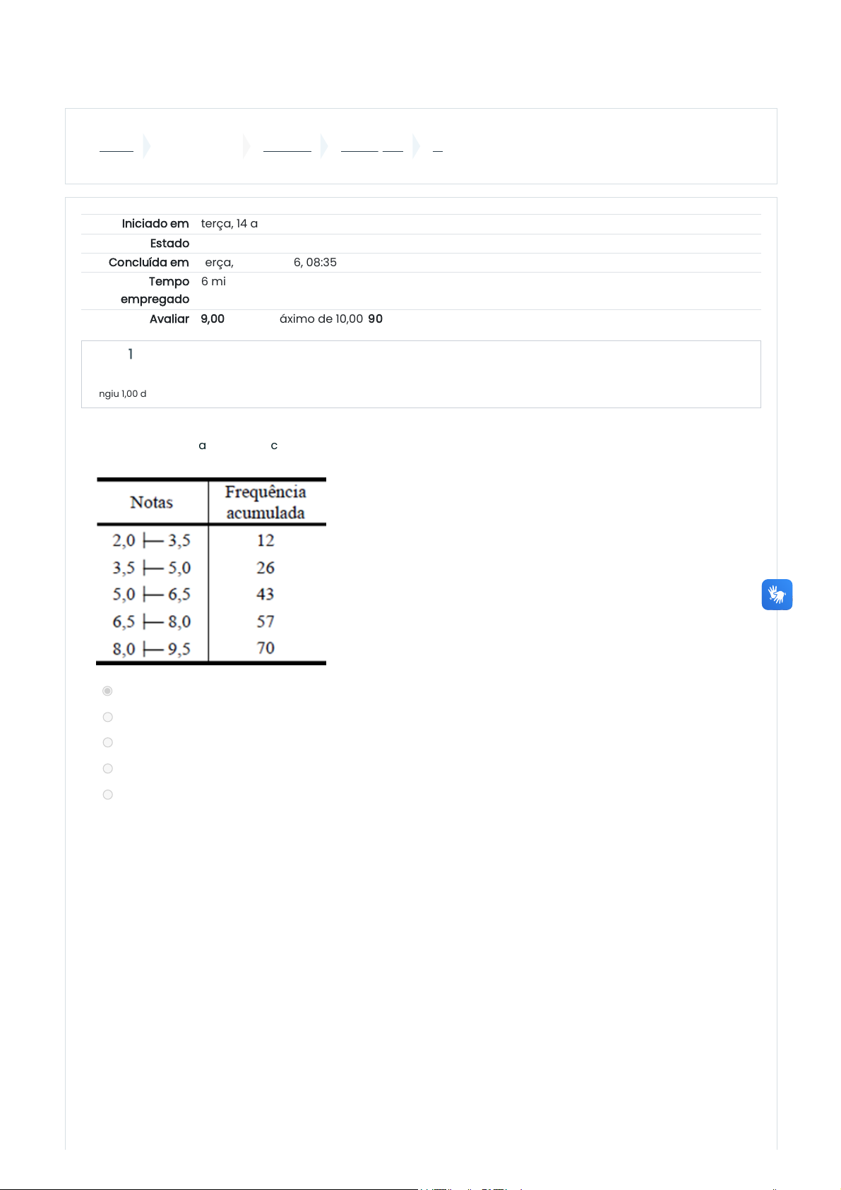 A tabela apresenta as frequências acumuladas das notas de 70 alunos, obtidas em uma avaliação. A frequência