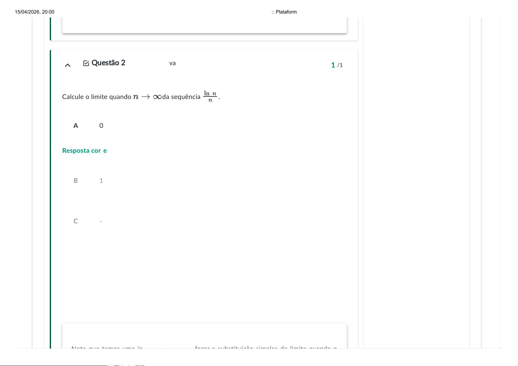 Atividade 3 (A3) Atividade 3 (A3) Prazo: 30/04/2026 - 23:59 Atividade 3 (A3) Disciplina: CÁLCULO AVANÇADO COM NÚMEROS COMPLEXOS (261GGR0553A) Calcule o limite quando da sequência . A 0 Resposta correta Questão 2 Questão objetiva 1 /1 n → ∞ ln n n B 1 C -1 D ∞ E 2 Feedback geral Note que temos uma indeterminação ao fazer a substituição simples do limite quando n 15/04/2026, 20:00 :: Plataforma A https://levelup.grupoa.education/plataforma/course/4485308/content/67770542 1/2 Prazo de envio 30/04/2026 - 23:59 Tentativas 1/2 Tentativa válida Maior nota Vale 10 pontos Anterior Explore Próximo Explore De: 09/02/26 - 00:00 a 30/04/26 - 23:59 Vale: 10 pts 1 de 2 tentativas Iniciar tentativa 2 Atividade 3 (A3) Prazo: 30/04/2026 - 23:59 Atividade 3 (A3) Disciplina: CÁLCULO AVANÇADO COM NÚMEROS COMPLEXOS (261GGR0553A) 15/04/2026, 20:00 :: Plataforma A https://levelup.grupoa.education/plataforma/course/4485308/content/67770542 2/2 https://levelup.grupoa.education/plataforma/course/4485308/content/67770541 https://levelup.grupoa.education/plataforma/course/4485308/content/67770536