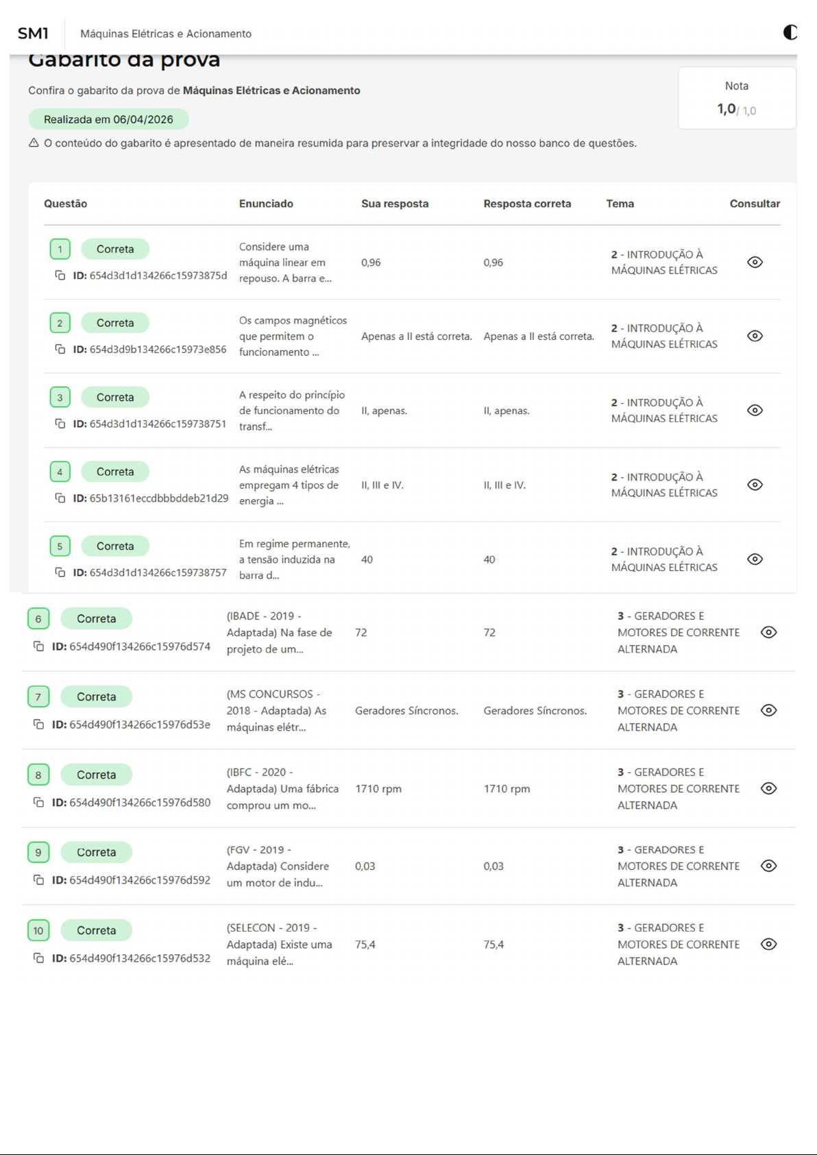 SM1 Máquinas Elétricas e Acionamento Gabarito da prova Confira o gabarito da prova de Máquinas Elétricas e Acionamento Nota 1,0/ 1,0 Realizada em 06/04/2026 conteúdo do gabarito é apresentado de maneira resumida para preservar a integridade do nosso banco de questões. Questão Enunciado Sua resposta Resposta correta Tema Consultar 1 Correta Considere uma 2 - INTRODUÇÃO À máquina linear em 0,96 0,96 MÁQUINAS ELÉTRICAS ID: 654d3d1d134266c15973875d repouso. A barra e... 2 Correta Os campos magnéticos 2 - INTRODUÇÃO À que permitem o Apenas a está correta. Apenas a está correta. ID: 654d3d9b134266c15973e856 MÁQUINAS ELÉTRICAS funcionamento 3 Correta A respeito do princípio 2 - INTRODUÇÃO À de funcionamento do II, apenas. II, apenas. MÁQUINAS ELÉTRICAS ID: 654d3d1d134266c159738751 transf... 4 Correta As máquinas elétricas 2 - INTRODUÇÃO À empregam 4 tipos de II, III e IV. II, III e IV. MÁQUINAS ELÉTRICAS ID: 65b13161eccdbbbddeb21d29 energia 5 Correta Em regime permanente, 2 INTRODUÇÃO À a tensão induzida na 40 40 MÁQUINAS ELÉTRICAS ID: 654d3d1d134266c159738757 barra d... 6 Correta (IBADE 2019 3 GERADORES E Adaptada) Na fase de 72 72 MOTORES DE CORRENTE ID: 654d490f134266c15976d574 projeto de um... ALTERNADA 7 Correta (MS CONCURSOS 3 GERADORES E 2018 Adaptada) As Geradores Síncronos. Geradores Síncronos. MOTORES DE CORRENTE ID: 654d490f134266c15976d53e máquinas elétr... ALTERNADA 8 Correta (IBFC 2020 3 GERADORES E Adaptada) Uma fábrica 1710 rpm 1710 rpm MOTORES DE CORRENTE ID: 654d490f134266c15976d580 comprou um mo... ALTERNADA 9 Correta (FGV 2019 3 - GERADORES E Adaptada) Considere 0,03 0,03 MOTORES DE CORRENTE ID: 654d490f134266c15976d592 um motor de indu... ALTERNADA 10 Correta (SELECON 2019 3 GERADORES E Adaptada) Existe uma 75,4 75,4 MOTORES DE CORRENTE ID: 654d490f134266c15976d532 máquina elé... ALTERNADASM2 Máquinas Elétricas e Acionamento Confira gabarito da prova de Máquinas Elétricas e Acionamento Nota 1,0/ 1,0 Realizada em 07/04/2026 conteúdo do gabarito é apresentado de maneira resumida para preservar a integridade do nosso banco de questões. Questão Enunciado Sua resposta Resposta correta Tema Consultar 1 Correta Conhecer os princípios 4 GERADORES E de funcionamento e as I III. III. MOTORES DE CORRENTE ID: 65b117edeccdbbbddead37e3 carac... CONTÍNUA Um gerador CC shunt, cuja curva de magnetização é 2 Correta 4 GERADORES E 120 120 MOTORES DE CORRENTE ID: 654d3d31134266c1597390e1 CONTÍNUA 3 Correta Conhecer os princípios 4 GERADORES E de funcionamento e as V V F F V. V-V-F-F-V. MOTORES DE CORRENTE ID: 65b11484eccdbbbddeac54c5 carac... CONTÍNUA 4 Correta Um transformador 17,2 17,2 5 TRANSFORMADORES ID: 65f1ba8b62358c753217bb36 trifásico Y \(\Delt... Um transformador trifásico com ligação Y 5 Correta possu... 5 TRANSFORMADORES ID: % 6 Correta Um autotransformador abaixador 15 kVA, 2000 22,5 22,5 5 TRANSFORMADORES ID: 654d3d24134266c159738c03 7 Correta Em um fusível, quanto 6 COMANDOS maior for Resistência elétrica Resistência elétrica ELÉTRICOS ID: 65b1320beccdbbbddeb23bc2 comprimento do f... 8 Correta Se um fator de serviço 6 COMANDOS possuir a indicação de 10% 10% ELÉTRICOS ID: 65b12e63eccdbbbddeb19420 Fs9 Correta Conhecer os princípios 4 - GERADORES E Utilizar faces polares Utilizar faces polares de funcionamento e as MOTORES DE CORRENTE côncavas. côncavas. ID: 65b116a8eccdbbbddeacdd17 carac... CONTÍNUA No circuito da figura, o contato representado pela... 10 Correta Contato normalmente Contato normalmente 6 COMANDOS C1 fechado fechado ELÉTRICOS ID: 67b3db70fd9afa7185695ec9 D RT C1