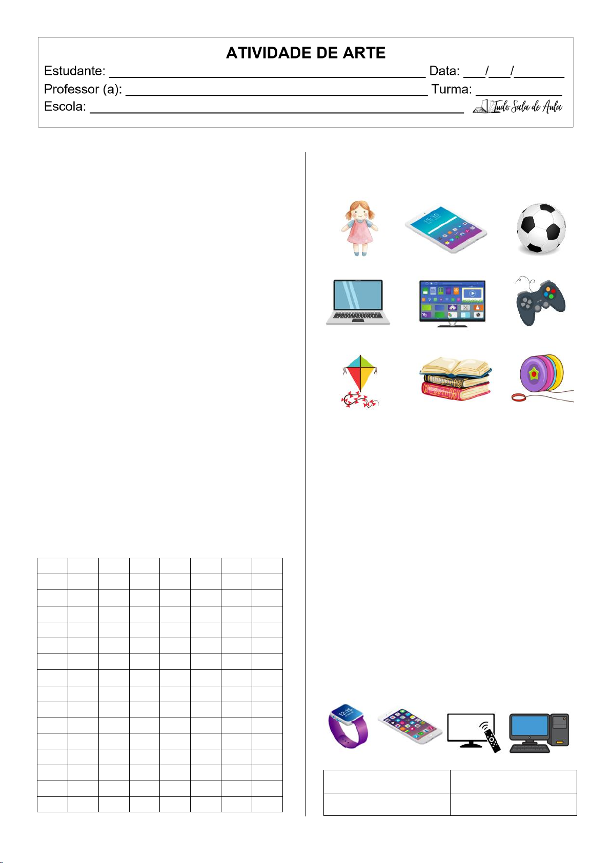 A CULTURA DIGITAL Cultura digital é o conjunto de ações, valores e comportamentos voltados para a tecnologias, como a internet e as redes sociais. A Internet e a Conexão entre as Pessoas A internet é como uma grande rede que conecta pessoas e informações. Usamos aparelhos como o celular, o computador e o tablet para estudar, brincar e conversar com quem está longe. Tecnologia e Cidadania Digital A tecnologia está em quase tudo: nos jogos que amamos, nos vídeos que assistimos e até nas pesquisas que fazemos na escola. Ser um "cidadão digital" significa usar essas ferramentas com inteligência e respeito! Tudo Sala de Aula. Atividade________________________________ 1. Procure no diagrama as seguintes palavras: COMPUTADOR - CELULAR - DIGITAL - JOGOS - VÍDEOS D I G I T A L C Q W E R T Y U O A S D F G A G M A Z X V C V E P R C V A E E Q U I A U I L Ç E T E N O E U O S A R O T S L K D D B P P E A L I O V Q Ç R R F J R Í W J I W N R U D V W O S E E D E X R W R R S T O E R T F E I O S G H J K L Ç W S C V J O G O S 2. Circule abaixo apenas os objetos que precisam de eletricidade ou bateria para funcionar. 3. Escreva abaixo duas coisas que você gosta de fazer usando a tecnologia: 1. __________________________________________ 2. __________________________________________ 4. Escreva abaixo duas coisas que você NÃO faz sem usar a tecnologia: 1. __________________________________________ 2. __________________________________________ 5. Nomeie cada objeto abaixo que precisa de eletricidade ou bateria para funcionar. CELULAR - TELEVISÃO - RELÓGIO DIGITAL - VIDEOGAME https://www.tudosaladeaula.com/ https://www.tudosaladeaula.com/ https://www.tudosaladeaula.com/ 6. Responda as perguntas abaixo com SIM ou NÃO. a) Podemos ficar o dia todo na internet? ____________________________________________ b) A internet serve para aprender coisas novas? ____________________________________________ c) Devemos ser educados ao falar com as pessoas na internet? ____________________________________________ d) Podemos falar com pessoas estranhas na internet? ____________________________________________ e) Só devemos usar o telefone se nosso responsável permitir. ____________________________________________ 7. Ligue os objetos atuais às suas formas antigas. 8. Circule os aparelhos que fazem parte da nova geração. 9. Os emojis são desenhos usados para mostrar o que sentimos nas mensagens. Substitua os emojis pela palavra correta para completar a frase: ____________________________________________ ____________________________________________ ____________________________________________ ____________________________________________ ____________________________________________ ____________________________________________ 10. Complete as frases com o banco de palavras abaixo. TELEFONE - MICROFONE - RÁDIO - CÂMERA a) Ouvimos músicas e anúncios locais através da: ____________________________________________ ____________________________________________ b) Usamos para tirar fotos e registrar momentos: ____________________________________________ ____________________________________________ c) Os cantores usam para deixar a voz mais alta: ____________________________________________ ____________________________________________ d) Usamos para fazer ligações aos nossos amigos: ____________________________________________ ____________________________________________ Tudo Sala de Aula https://www.tudosaladeaula.com/ https://www.tudosaladeaula.com/ https://www.tudosaladeaula.com/ https://www.tudosaladeaula.com/