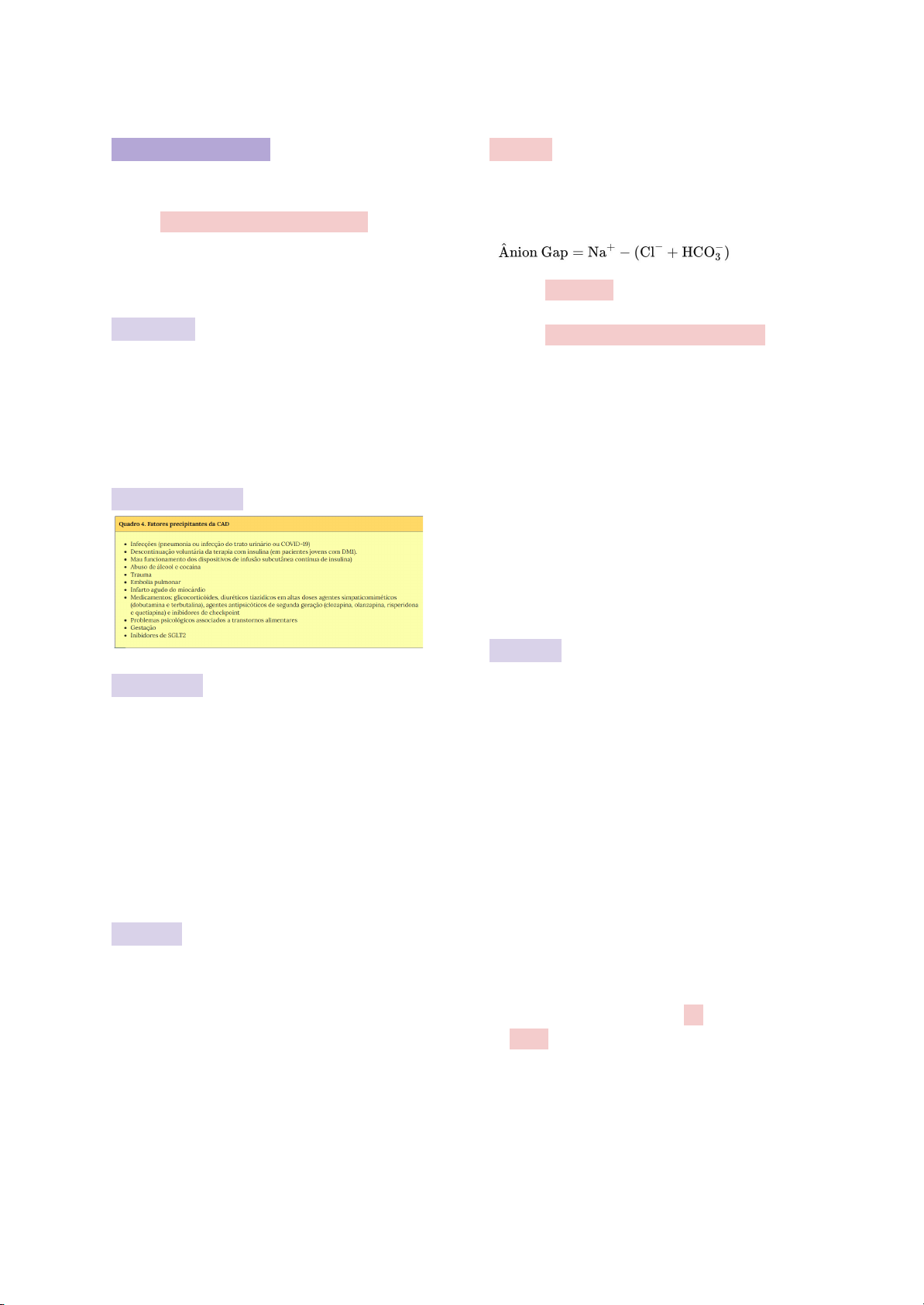 CETOACIDOSE DIABÉTICA A CAD é a manifestação inicial em 30% dos casos de DM1 É uma complicação metabólica aguda de DM1 - mais comum em crianças (pacientes jovens) - início rápido e abrupto Fisiopatologia ausência de insulina → estado catabólico exagerado → a lipólise lança na circulação uma quantidade exagerada de ácidos graxos que serão transformados em corpo cetônicos → ↑glicemia e produção exacerbada de corpos cetônicos = cetoacidose diabética Fatores Precipitantes Quadro Clínico - Náuseas e vômitos - Dor abdominal difusa - Poliúria e polidipsia - Perda de peso - Desidratação - Fraqueza - Fadiga - Taquicardia - Taquipneia, Respiração de Kussmaul - Letargia e Coma Diagnóstico - glicemia > 200 mg/dL - acidose metabólica (pH venoso 10-12 (positivo) Ânion-gap - diferença entre cátions e ânions no sangue. Fórmula: - Sódio (Na⁺): principal cátion do plasma e regulador importante da osmolaridade - Cloreto (Cl⁻) e bicarbonato (HCO₃⁻): principais ânions medidos. - Ânion-gap aumenta quando há acúmulo de ácidos (ex.: cetoácidos), que consomem bicarbonato (HCO₃⁻), pois ele atua como um tampão. - Com a queda do bicarbonato, o corpo pode tentar compensar aumentando o cloreto (Cl⁻) = (acidose hiperclorêmica) - Glicemia muito alta pode causar pseudo-hiponatremia (sódio falsamente baixo por diluição). Tratamento 1. Reposição Volêmica - infusão de solução salina isotônica de cloreto de sódio (NaCl) 0,9%, em média 15 a 20 mL/kg na primeira hora 2. Reposição de Potássio - K entre 3,3 - 5,2 → repor potássio + insulinização → infusão de cloreto de potássio (KCl) 10 a 30 mEq/L por hora, para manter o potássio sérico entre 4 e 5 mEq/L - K 7,30 e bicarbonato >18 - ânion-gap 50a) - instalação insidiosa em dias a semanas Fatores Precipitantes Quadro Clínico - poliúria - polidipsia - perda de peso - deterioração neurológica - sinais neurológicos focais (hemiparesia ou hemianopsia) e/ou convulsões - estupor ou coma - dor abdominal (incomum) - desidratação (diminuição do turgor cutâneo, mucosas secas, olhos fundos, pressão venosa jugular baixa, taquicardia) - hipotensão arterial Suspeita de EHH - glicose sérica. - eletrólitos séricos (Na+, K+ e Cl-, com cálculo do “anion gap”) - uréia e creatinina - cálcio e fósforo - hemograma completo - análise de urina - cetonas na urina por fitas reagentes - osmolaridade plasmática - cetonas séricas (se houver cetonas na urina) - gasometria arterial, com dosagem de bicarbonato - hemoglobina glicada Diagnóstico - hiperglicemia marcante (> 600mg/dL) - osmolaridade plasmática efetiva > 320 mOsmol/L - ausência de hipercetonemia significativa ( 7,30, bicarbonato > 15 mmol/L) Tratamento IGUAL AO DE CAD - definir e resolver a causa subjacente - fornecer volume circulatório adequado para perfusão tecidual - reduzir a glicemia - reduzir a osmolaridade de forma gradual - corrigir os distúrbios hidroeletrolíticos Critérios de Resolução - paciente alerta, se alimentando e com normalização do estado mental - osmolaridade plasmática 75 anos - 0,75mg/kg 2x ao dia) SCACSST Manejo 1ª escolha → Angioplastia Tempo porta-balão → intervalo entre a chegada do paciente ao hospital e a realização da angioplastia. Se tiver hemodinâmica disponível no serviço: - tempo porta-balão 120 minutos), a melhor opção é a Trombólise. Contraindicações: Conduta - AAS 300mg (ataque) + 100mg/dia - Clopidogrel 600mg (ataque) + 75mg/dia Obs.: Todo paciente deverá receber HNF por 48h ou enoxaparina por 8 dias ou até alta hospitalar. Enoxaparina (HBPM) é indicada como adjuvante a terapia trombolítica: - idade