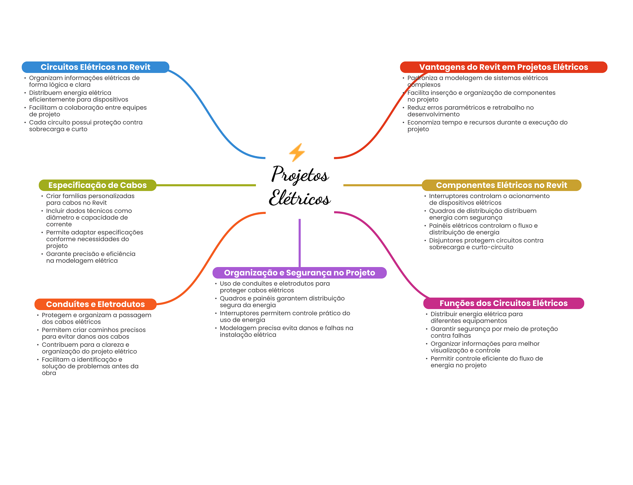 Circuitos Elétricos no Revit Vantagens do Revit em Projetos Elétricos Organizam informações elétricas de Padroniza a modelagem de sistemas elétricos forma lógica e clara complexos Distribuem energia elétrica Facilita inserção e de componentes eficientemente para dispositivos no projeto Facilitam a colaboração entre equipes Reduz erros paramétricos e retrabalho no de projeto Cada circuito possui proteção contra Economiza tempo e recursos durante a execução do sobrecarga e curto projeto Projetos Especificação de Cabos Componentes Elétricos no Revit Criar famílias personalizadas para cabos no Revit Elétricos Interruptores controlam acionamento de dispositivos elétricos Incluir dados técnicos como Quadros de distribuição distribuem diâmetro e capacidade de energia com segurança corrente Painéis elétricos controlam fluxo e Permite adaptar especificações distribuição de energia conforme necessidades do Disjuntores protegem circuitos contra projeto sobrecarga e curto-circuito Garante precisão e eficiência na modelagem elétrica Organização e Segurança no Projeto Uso de conduítes e eletrodutos para proteger cabos elétricos Quadros e painéis garantem distribuição Conduítes e Eletrodutos segura da energia Funções dos Circuitos Elétricos Protegem e organizam a passagem Interruptores permitem controle prático do Distribuir energia elétrica para dos cabos elétricos uso de energia diferentes equipamentos Permitem criar caminhos precisos Modelagem precisa evita danos e falhas na Garantir segurança por meio de proteção para evitar danos aos cabos instalação elétrica contra falhas Contribuem para a clareza e Organizar informações para melhor organização do projeto elétrico visualização e controle Facilitam a identificação e Permitir controle eficiente do fluxo de solução de problemas antes da energia no projeto obra