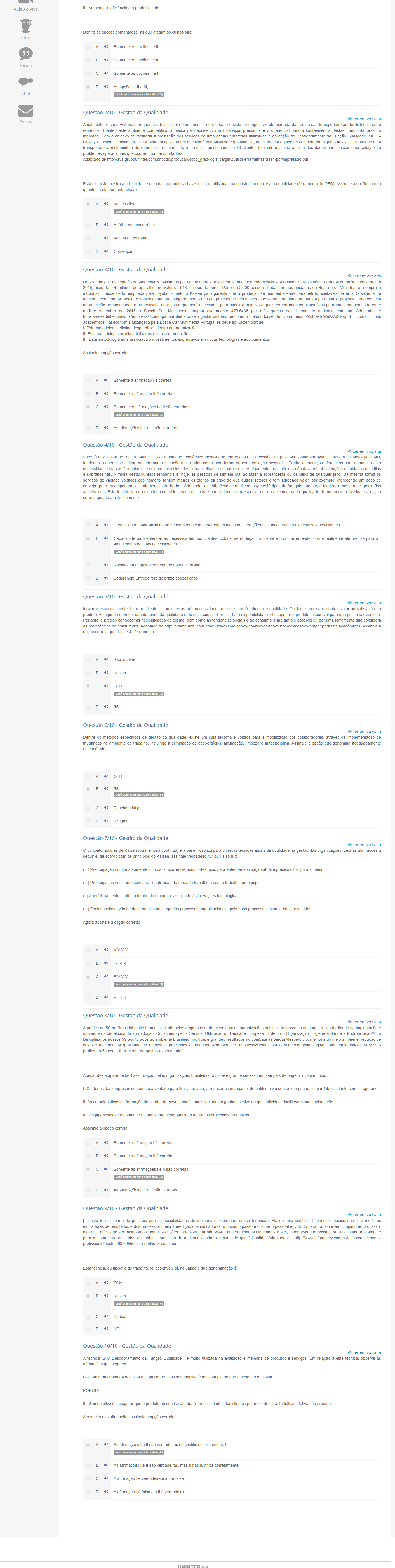 III Aumenta produtividade são A " Questão 2/10 Gestão Qualidade cada vez de Diante ambiente busca nos prestados para destas no uma - Quality Deployment) aplicado qualitativo definido equipe junto uma do de uma dos dados para uma solução prot transportadora Adaptado Est situação uma das pm da do Assina Correlação Questão 3/10 Qualidade De Car 2015, mais de 9 de valor 516 de 2.200 pessoas nas nidades de Braga de Vila Real empresa desde cedo para que longo projetos que de ponto partida para outros Tudo começa abril de 2015 Bosch Car exatamente por graças sistema de melhoria continua Adaptado para parque produção Esta esta entos gias Assinale correta A correta B correta Questão 4/10 Gestão Qualidade alta Você falar Esse mostra que em de ecessão as essoas gastar mais em cuidados pessoais, cuidar mesmo numa uma forma pessoal Dentre serviço para atender esta sidade estão das tanta as pessoas sentem de qualquer mesma forma serviços vaidade voltados homens menos outros agregado copo de cerveja acompanhar tratamento da barba Adaptado cuidados com barba cm um dos da qualidade de um opção correta quanto elemento: dos entes Capacidade para lientes coloca lugar 8 que ele para atendimento Rapidez entrega errado D Segurança Entrega especificado Questão 5/10 Gestão Qualidade alta cliente que cliente valor produto preço depende qualidade que possa vendido preciso cliente bem socials consumo tanto considera as preferências consu Adaptado http: com exam para fins Icos. Assinale opção correta quant Time QFD estão 6/10 Gestão Qualidade Dentre métodos gestão da qualidade existe para através da implementação de mudanças trabalho opção que este método QFD B Questão 7/10 Gestão Qualidade Kalzen (ou base para diversas técnicas de gestão das organizações seguir com do Kaizen assinale ( ( com da com cont inuo dentro associado ( dos orga bons Ag assinate opção F-F-F-F estão 8/10 Gestão da Qualidade Ap 58 empresas pelas Ses como implantação adoção Sensos Descarte Saúde Disciplina nossos grandes combate custo qualidade processos Adaptado de pra dosta grando Japão pois - donos das resa n-se para do povo mais 30 ganho dividual sua implantação japor acreditam que um ambiente Somente Somente afirmações D corretas uestão 9/10 Gestão Qualidade alta esta part do principio que as possibilidades de são nunca terminam muito principio criar que pode ser methorado tomar as ações corretivas não visa grandes mudanças que possam ser aplicadas apidamente para resultados processo que Adaptado mento- pro continua TQM Kaizer Kanban Questão 10/10 Gestão da Qualidade QFD mento da unção Qualidade utilizada na de produtos Em relação esta observe as Casa mas que PORQUE opção ras B D 49 verdadeira