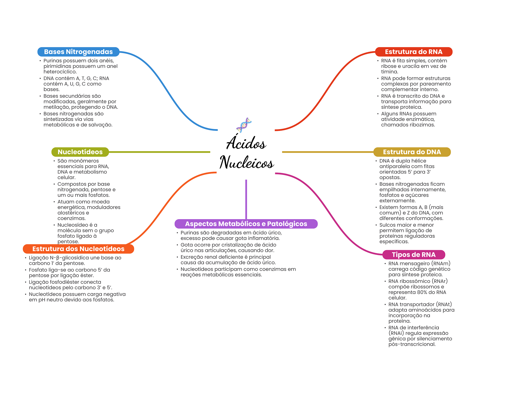 Bases Nitrogenadas Estrutura do RNA Purinas possuem dois anéis, RNA é fita simples, contém pirimidinas possuem um anel ribose e uracila em vez de heterocíclico. timina. DNA contém T, G, C; RNA RNA pode formar estruturas contém U, G, como complexas por pareamento bases. complementar interno. Bases secundárias são RNA é transcrito do DNA e modificadas, geralmente por transporta informação para metilação, protegendo DNA. síntese proteica. Bases nitrogenadas são Alguns RNAs possuem sintetizadas via vias atividade enzimática, metabólicas e de salvação. chamados ribozimas. Acidos Nucleotídeos Estrutura do DNA São monômeros Nucleicos DNA é dupla hélice essenciais para RNA, antiparalela com fitas DNA e metabolismo orientadas 5' para 3' celular. opostas. Compostos por base Bases nitrogenadas ficam nitrogenada, pentose e empilhadas internamente, um ou mais fosfatos. fosfatos e açúcares Atuam como moeda externamente. energética, moduladores Existem formas B (mais alostéricos e comum) e Z do DNA, com coenzimas. diferentes conformações. Nucleosídeo é a Aspectos Metabólicos e Patológicos Sulcos maior e menor molécula sem O grupo Purinas são degradadas em ácido úrico, permitem ligação de fosfato ligado à excesso pode causar gota inflamatória. proteínas reguladoras pentose. específicas. Gota ocorre por cristalização de ácido Estrutura dos Nucleotídeos úrico nas articulações, causando dor. Ligação une base ao Excreção renal deficiente é principal Tipos de RNA carbono l' da pentose. causa da acumulação de ácido úrico. RNA mensageiro (RNAm) Fosfato liga-se ao carbono 5' da Nucleotídeos participam como coenzimas em carrega código genético pentose por ligação éster. reações metabólicas essenciais. para síntese proteica. Ligação fosfodiéster conecta RNA ribossômico (RNAr) nucleotídeos pelo carbono 3' e 5'. compõe ribossomos e Nucleotídeos possuem carga negativa representa 80% do RNA em pH neutro devido aos fosfatos. celular. RNA transportador (RNAt) adapta aminoácidos para incorporação na proteína. RNA de interferência (RNAi) regula expressão gênica por silenciamento pós-transcricional.