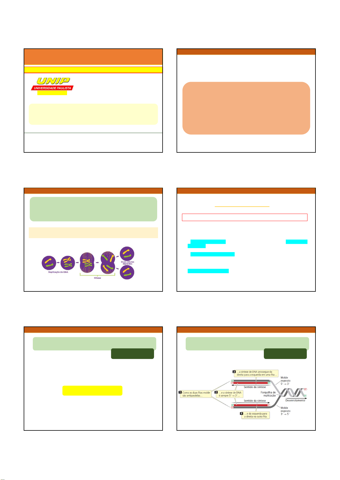 12/09/2025 Profa. Dra. Tatiana Mozer Dogma Central da Biologia / Replicação; Transcrição e Tradução Disciplina: Biologia Unidade Sorocaba A Replicação do DNA “A replicação do DNA é um processo complexo que requer vários componentes, e suas ações têm de estar intrinsecamente coordenadas a fim de garantir que o DNA seja copiado com fidelidade.” Toda vez que a célula se divide, seu DNA é replicado e distribuído igualmente entre as duas células filhas. Toda replicação do DNA ocorre de forma SEMICONSERVATIVA Propriedades da estrutura da molécula de DNA A natureza complementar das fitas sugere que, durante a replicação, cada fita serve como molde para a síntese de uma nova fita A especificidade do pareamento de bases indica que apenas uma sequência pode ser especificada para cada molde e então as duas moléculas de DNA construídas a partir do par de moldes serão idênticas à molécula original Replicação do DNA A replicação – Conceitos importantes O sentido da replicação é SEMPRE 5´ - 3´ Novos nucleotídeos são incorporados a extremidade 3´OH da fita recém sintetizada pelas DNA POLIMERASES Como as fitas são antiparalelas A síntese de um molde segue da esquerda para direita e a síntese do outro da direita para esquerda Sentido da replicação A replicação – Conceitos importantes Sentido da replicação 12/09/2025 A replicação – Conceitos importantes Sentido da replicação A replicação – Conceitos importantes Replicação contínua e descontínua À medida que o DNA se desenrola, a fita molde exposta no sen do 3′ → 5, possibilita a síntese contínua da nova fita (no sen do 5′ → 3′) Replicação contínua Fita Líder A replicação – Conceitos importantes Replicação contínua e descontínua A outra fita molde é exposta no sen do 5′ → 3′. À medida que a extensão curta do DNA for desenrolada, a síntese deve seguir 5′ → 3′; ou seja, no sentido oposto da fita não desenrolada Replicação Descontínua Fita Tardia (lagging) 5´3´5´3´5´3´ A replicação – Conceitos importantes Replicação contínua e descontínua Fragmentos de Okazaki A outra fita molde é exposta no sen do 5′ → 3′. À medida que a extensão curta do DNA for desenrolada, a síntese deve seguir 5′ → 3′; ou seja, no sentido oposto da fita não desenrolada ENZIMAS DA REPLICAÇÃO Helicase (rompe as PH) abrindo as fitas SSB estabilizam a fita simples Topoisomerase Reduz a tensão do torque DNA polimerase Faz a inclusão de novos nucleotídeos DNA Ligase Promove a união dos frag. de Okazaki Enzimas da Replicação Helicase SSBs Topoisome rase Primer DNA Polimerase DNA Ligase A replicação é um processo complexo que necessita de várias enzimas 12/09/2025 Termino da replicação Em algumas moléculas de DNA, a replicação é terminada sempre que duas forquilhas de replicação se encontram. Em outras, as sequências de término específicas (chamadas sítios Ter) bloqueiam a replicação. O Dogma Central da Biologia Dogma Central DNA RNA Proteína Transcrição Tradução Via de transferência da informação genética A Transcrição do DNA A Transcrição é a primeira etapa no dogma central, a via de transferência de informação do DNA (genótipo) para a proteína (fenótipo) A transcrição é um processo complexo que requer precursores aos nucleotídeos de RNA, um molde de DNA e vários componentes proteicos. DNA RNA Proteína Dogma Central Transcrição 12/09/2025 Transcrição A Transcrição é a síntese de uma molécula de RNA complementar a fita de DNA A estrutura do RNA O RNA, como o DNA, é um polímero composto por nucleotídeos unidos por ligações fosfodiéster Enquanto os nucleotídeos do DNA têm açúcares desoxirribose, os nucleotídeos do RNA têm ribose o RNA é rapidamente degradado em condições alcalinas (menos estável que o DNA). Outra diferença importante é que a timina, uma das duas pirimidinas encontradas no DNA, é substituída pela uracila no RNA. o RNA é composto por uma única fita de polinucleotídeos A estrutura do RNA Embora o RNA tenha fita simples, regiões complementares curtas em uma fita de nucleotídeos podem parear e formar estruturas secundárias Essas estruturas secundárias de RNA são chamadas de estruturas grampo-alça ou haste- alça. A formação de estruturas secundárias é importante na função do RNA. Como sua estrutura determina sua função, as moléculas de RNA têm o potencial para muitas funções diferentes. Classes de RNA Por se tratar de uma molécula que desempenha várias funções, existem várias classes de RNA RNA mensageiro (mRNA) carreia as instruções de codificação para as cadeias de polipeptídios. Após se prender ao ribossomo, uma molécula de mRNA especifica a sequência de aminoácidos RNA ribossômico (rRNA) e as subunidades ribossômicas de proteína compõem o ribossomo, o sítio de montagem das proteínas O RNA transportador (tRNA) serve como a ligação entre a sequência codificada de nucleotídeos no mRNA e a sequência de aminoácidos de uma cadeia de polipeptídios. C l a s s e s d e R N A A transcrição de um gene ocorre em apenas uma das duas fitas de nucleotídeos do DNA A fita de nucleotídeos usada para a transcrição é chamada de fita molde. A outra, chamada de fita não molde Durante a transcrição, uma molécula de RNA complementar e antiparalela à fita molde de DNA é sintetizada A transcrição 12/09/2025 A transcrição Nesse processo o RNA é sintetizado a partir de um molde de DNA Existem várias semelhanças entre a Replicação e a Transcrição A principal diferença Na replicação TODOS os nucleotídeos do molde de DNA são copiados Na transcrição apenas pequenas partes, ou genes específicos, são transcritos em RNA Além disso, boa parte do DNA não codifica um produto funcional e a transcrição de tais sequências não faria sentido. A transcrição Como nem todos os produtos dos genes são necessári