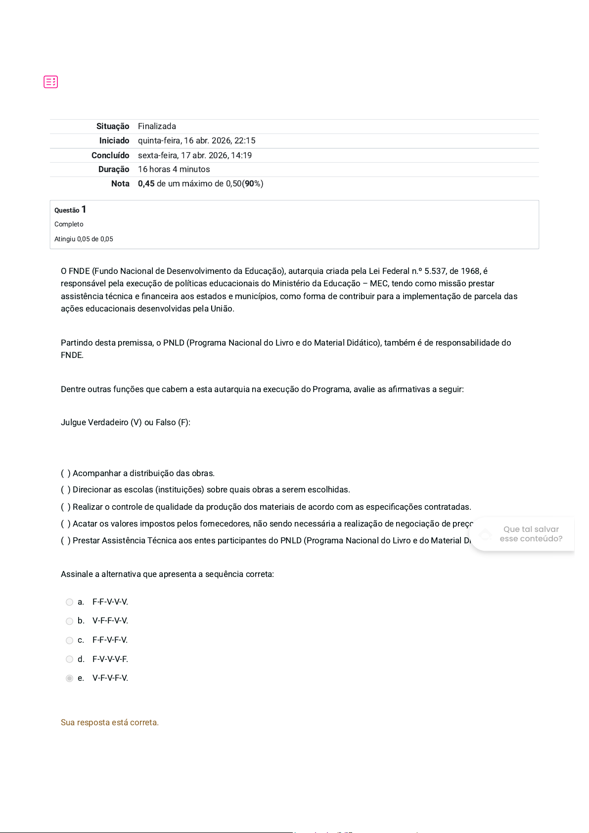 Situação Finalizada Iniciado quinta-feira, 16 abr. 2026, 22:15 Concluído sexta-feira, 17 abr. 2026, 14:19 Duração 16 horas 4 minutos Nota 0,45 de um máximo de 0,50(90%) Questão 1 Completo Atingiu 0,05 de 0,05 O FNDE (Fundo Nacional de Desenvolvimento da Educação), autarquia criada pela Lei Federal n.º 5.537, de 1968, é responsável pela execução de políticas educacionais do Ministério da Educação – MEC, tendo como missão prestar assistência técnica e financeira aos estados e municípios, como forma de contribuir para a implementação de parcela das ações educacionais desenvolvidas pela União. Partindo desta premissa, o PNLD (Programa Nacional do Livro e do Material Didático), também é de responsabilidade do FNDE. Dentre outras funções que cabem a esta autarquia na execução do Programa, avalie as afirmativas a seguir: Julgue Verdadeiro (V) ou Falso (F): ( ) Acompanhar a distribuição das obras. ( ) Direcionar as escolas (instituições) sobre quais obras a serem escolhidas. ( ) Realizar o controle de qualidade da produção dos materiais de acordo com as especificações contratadas. ( ) Acatar os valores impostos pelos fornecedores, não sendo necessária a realização de negociação de preços. ( ) Prestar Assistência Técnica aos entes participantes do PNLD (Programa Nacional do Livro e do Material Didático). Assinale a alternativa que apresenta a sequência correta: a. F-F-V-V-V. b. V-F-F-V-V. c. F-F-V-F-V. d. F-V-V-V-F. e. V-F-V-F-V. Sua resposta está correta. Que tal salvar esse conteúdo? Questão 2 Completo Atingiu 0,05 de 0,05 Leia a frase abaixo e complete as lacunas: Os princípios, as normas e as diretrizes que orientam as políticas _____________ aplicadas à educação no ___________ podem ser encontrados nas Constituições do país, nas LDBs de 1961, de 1971 e de 1996, nas legislações específicas, nos planos e nos programas __________________ do governo federal, entre outros. Assinale a alternativa que completa as lacunas na ordem correta. a. Públicas, Brasil, educacionais. b. Institucionais, Brasil, sociais. c. Privadas, Distrito Federal, educacionais. d. Privadas, Itália, sociais. e. Públicas, Estado, políticas públicas. Sua resposta está correta. Que tal salvar esse conteúdo? Questão 3 Completo Atingiu 0,00 de 0,05 O currículo do ensino médio será composto pela Base Nacional Comum Curricular e por itinerários formativos. Os itinerários formativos podem ser estruturados com foco em uma área do conhecimento, na formação técnica e profissional ou, também, na mobilização de competências e habilidades de diferentes áreas, compondo itinerários integrados. Assim, para propiciar aos estudantes possibilidades efetivas para construir e desenvolver seus projetos de vida e se integrar de forma consciente e autônoma na vida cidadã e no mundo do trabalho, a oferta dos itinerários formativos precisam atender alguns aspectos. Mediante esse contexto avalie quais aspectos, a escola deve levar em consideração ao ofertar os itinerários formativos: Julgue Verdadeiro (V) ou Falso (F): ( ) A realidade local. ( ) A oferta e a demanda. ( ) As escolhas dos professores. ( ) Os anseios da comunidade escolar. ( ) Os recursos físicos, materiais e humanos das redes e instituições escolares. Assinale a alternativa que apresenta a sequência correta: a. F-V-V-V-F. b. V-F-F-V-V. c. F-F-V-V-V. d. F-V-V-F-V. e. V-F-V-F-V. Sua resposta está incorreta. Que tal salvar esse conteúdo? Questão 4 Completo Atingiu 0,05 de 0,05 Auxiliando alunos e professores, o livro didático é de certa forma um mediador do diálogo entre o aluno, o professor e os conteúdos. Considerando o exposto relacione as funções apresentadas a seguir, considerando (1) para: Aluno e (2) para: Professor. (1) Aluno (2) Professor ( ) Aquisição de saberes relevantes. ( ) Auxiliando como texto de referência. ( ) Desenvolvimento de competências e habilidades. ( ) Auxiliar o trabalho pedagógico na gestão das aulas. Assinale a alternativa que apresenta a ordem correta: a. 2 – 1 – 1 – 2. b. 1 – 1 – 2 – 2. c. 2 – 2 – 1 – 1. d. 1 – 2 – 1 – 2. e. 2 – 1 – 2 – 1. Sua resposta está correta. Que tal salvar esse conteúdo? Questão 5 Completo Atingiu 0,05 de 0,05 Com base nos recentes documentos curriculares brasileiros, a (Base Nacional Comum Curricular (BNCC) leva em conta que os diferentes campos que compõem a Matemática reúnem um conjunto de ideias fundamentais importantes para o desenvolvimento do pensamento matemático dos alunos e devem se converter, na escola, em objetos de conhecimento. Mediante esse contexto avalie as afirmativas a seguir que correspondem a algumas dessas ideias fundamentais citadas no enunciado acima: Julgue Verdadeiro (V) ou Falso (F): ( ) Fixo ( ) Ordem. ( ) Variação. ( ) Totalidade. ( ) Aproximação. Assinale a alternativa que apresenta a sequência correta: a. V-F-F-V-V. b. F-F-V-V-V. c. F-F-V-F-V. d. F-V-V-V-F. e. F-V-V-F-V. Sua resposta está correta. Que tal salvar esse conteúdo? Questão 6 Completo Atingiu 0,05 de 0,05 Para participar do PNLD, os dirigentes das redes de ensino municipal, estadual, distrital e das escolas federais devem encaminhar Termo de Adesão manifestando seu interesse em receber os materiais do programa e comprometendo-se a executar as ações do programa conforme a legislação. No entanto, a quem se destinam as ações do PNLD (Programa Nacional do Livro e do Material Didático)? Sobre tal reflexão, avalie as afirmativas abaixo: Julgue Verdadeiro (V) ou Falso (F): ( ) Instituições comunitárias. ( ) Instituições do setor privado. ( ) Instituições de ensino superior. ( ) Instituições filantrópicas sem fins lucrativos. ( ) Alunos e professores das escolas públicas de educação básica. Assinale a alternativa que apresenta a sequência correta: a. F-V-V-V-F. b. V-F-F-V-V. c. F-F-F-F-F. d. V-V-V-V-F. e. V-V-V-V-V. Sua resposta está correta. Que tal salvar esse conte