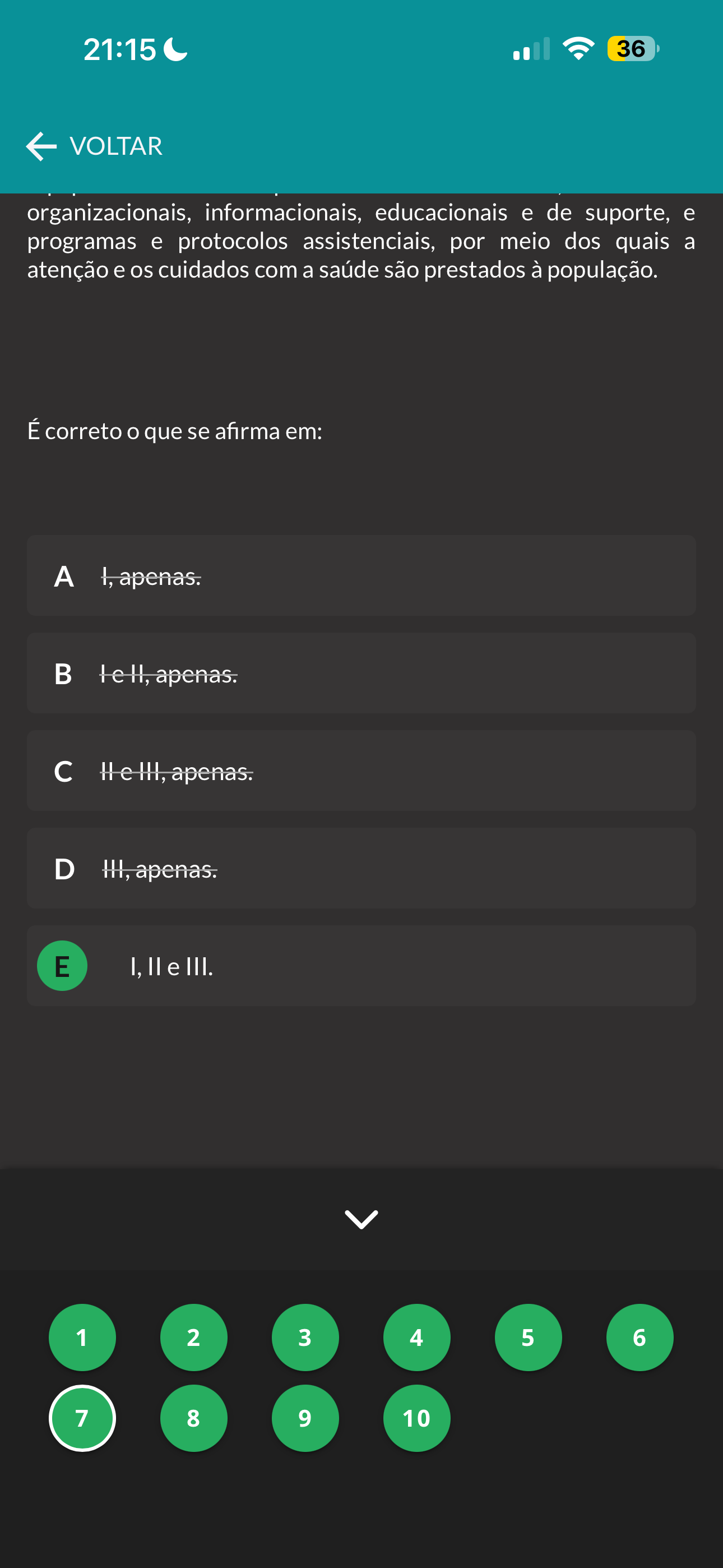 21:15 36 VOLTAR organizacionais, informacionais, educacionais e de suporte, e programas e protocolos assistenciais, por meio dos quais a atenção e os cuidados com a saúde são prestados à população. É correto que se afirma em: A c D E I, e III. 1 2 3 4 5 6 7 8 9 10