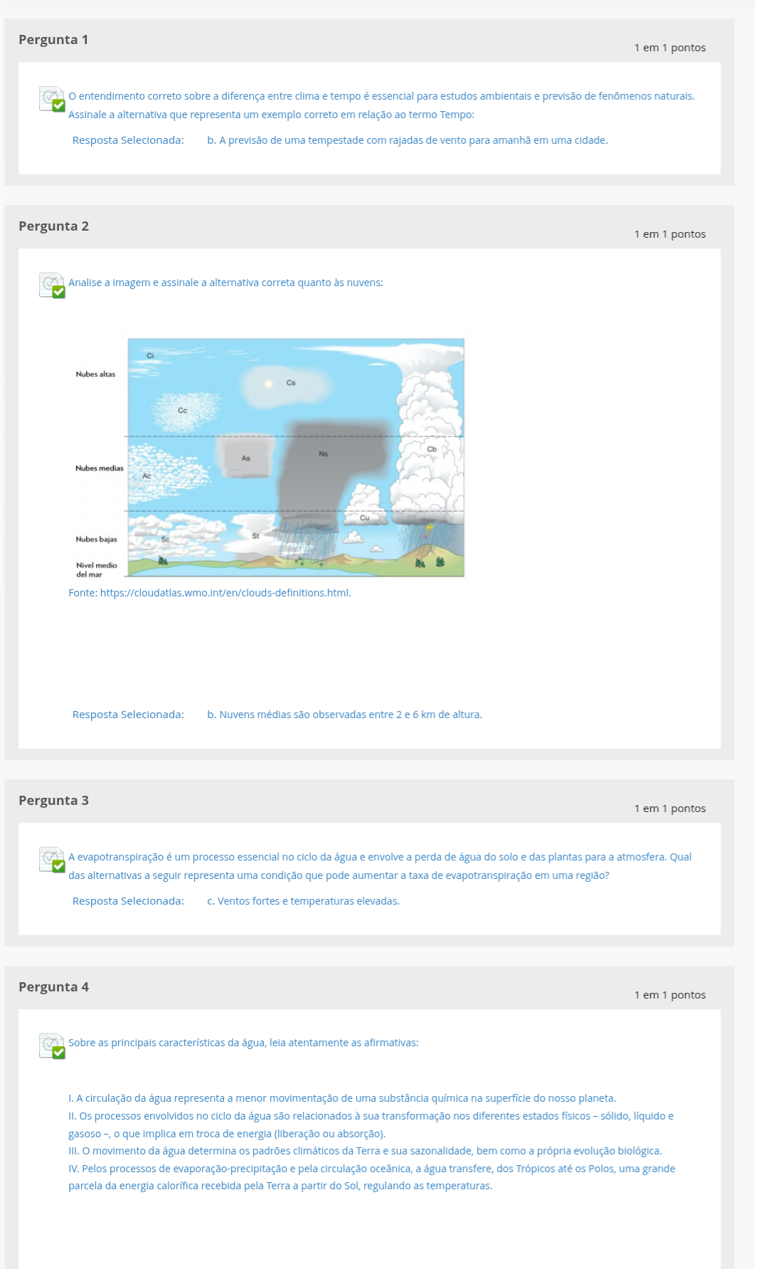Pergunta 1 1 em 1 pontos entendimento correto sobre a diferença entre clima e tempo é essencial para estudos ambientais e previsão de fenômenos naturais. Assinale a alternativa que representa um exemplo correto em relação ao termo Tempo: Resposta Selecionada: b. A previsão de uma tempestade com rajadas de vento para amanhã em uma cidade. Pergunta 2 1 em 1 pontos Analise a imagem e assinale a alternativa correta quanto às nuvens: Nubes altas Cs Cc Ns As Nubes medias Nubes bajas St Nivel medio del mar Fonte: Resposta Selecionada: b. Nuvens médias são observadas entre 2 e 6 km de altura. Pergunta 3 1 em 1 pontos A evapotranspiração é um processo essencial no ciclo da água e envolve a perda de água do solo e das plantas para a atmosfera. Qual das alternativas a seguir representa uma condição que pode aumentar a taxa de evapotranspiração em uma região? Resposta Selecionada: C. Ventos fortes e temperaturas elevadas. Pergunta 4 1 em 1 pontos Sobre as principais características da água, leia atentamente as afirmativas: I. A circulação da água representa a menor movimentação de uma substância química na do nosso planeta. II. Os processos envolvidos no ciclo da água são relacionados à sua transformação nos diferentes estados físicos sólido, líquido e gasoso -, que implica em troca de energia (liberação ou absorção). III. movimento da água determina os padrões climáticos da Terra e sua sazonalidade, bem como a própria evolução biológica. IV. Pelos processos de evaporação-precipitação e pela circulação oceânica, a água transfere, dos Trópicos até os Polos, uma grande parcela da energia calorífica recebida pela Terra a partir do Sol, regulando as temperaturas.