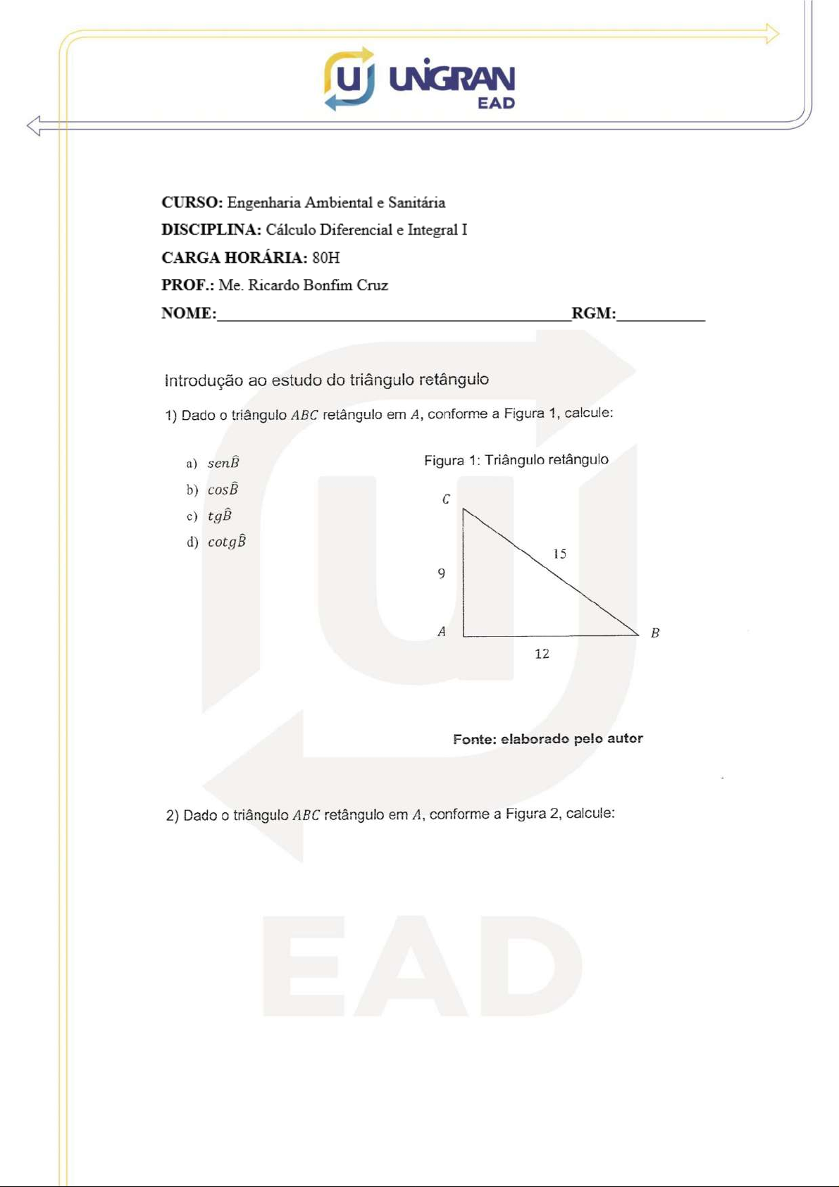 EAD CURSO: Engenharia Ambiental e Sanitária DISCIPLINA: Cálculo Diferencial e Integral I CARGA HORÁRIA: 80H PROF.: Me. Ricardo Bonfim Cruz NOME: RGM: Introdução ao estudo do triângulo retângulo 1) Dado triângulo ABC retângulo em A, conforme a Figura 1, calcule: a) senß Figura 1: Triângulo retângulo b) cosB C c) tgB d) 15 9 A B 12 Fonte: elaborado pelo autor 2) Dado triângulo ABC retângulo em A, conforme a Figura 2, calcule: EADu EAD a) Figura2: Triângulo retângulo b) C c) d) 15 9 A B 12 Fonte: elaborado pelo autor 3) Num triângulo ABC reto em A, determine as medidas dos catetos, sabendo que a hipotenusa vale 50 e 4) Na Figura 3, a hipotenusa mede e 17 determine os catetos: Figura 3: Triângulo retângulo B A C Fonte: elaborado pelo autor EADUNGRAN EAD 5) Sabendo que B e C são complementares, calcule e quando: a) = 0,57 b) 6) Num triângulo retângulo um cateto mede 12cm e o ângulo oposto é de 60°. Calcule a hipotenusa e 0 outro cateto. 7) Uma escada de 6m de comprimento está encostada a uma parede formando com ela um ângulo de 30°. Calcule a distância do pé da escada à parede. EADEAD Resolução de triângulos quaisquer 8. Calcule comprimento: (a) De uma circunferência de raio 12 cm. (b) De um arco de 120° contido numa circunferência de raio 12 cm. 9. Uma circunferência tem diâmetro igual a 60 mm: (a) Calcule comprimento da (b) Calcule comprimento de um arco de 264° dessa circunferência. 10. Uma pista de atletismo tem a forma de um círculo e 0 raio é 72 m. Um atleta treina diariamente por dia. 40 voltas na pista. Quantos quilômetros, aproximadamente, ele percorre cada vez que treina? 11. Uma pessoa caminhando em volta de uma praça circular, ao percorrer 126 m descreve um arco de 160°. Qual é O diâmetro da praça? 12. Converta em radianos: (a) 60° (b) 210° (c) 300° (d) 225° 13. Expresse em graus: (a) rad (b) rad (c) rad (d) rad 14. Escreva a expressão geral dos arcos congruos a: (a) 60° (b) 300° (c) rad EADu UNGRAN EAD (d) 120° (e) rad (f) rad (g) 240° (h) 2π 3 rad 15. Descubra a determinação, ou seja, O menor valor não-negativo con- gruente ao arco de: (a) 685° (b) 780° (c) 1140° (d) 850° (e) -400° (f) 1310° (g) 15m 2 rad (h) rad (i) rad (j) rad (k) 9π 2 rad (1) rad EAD