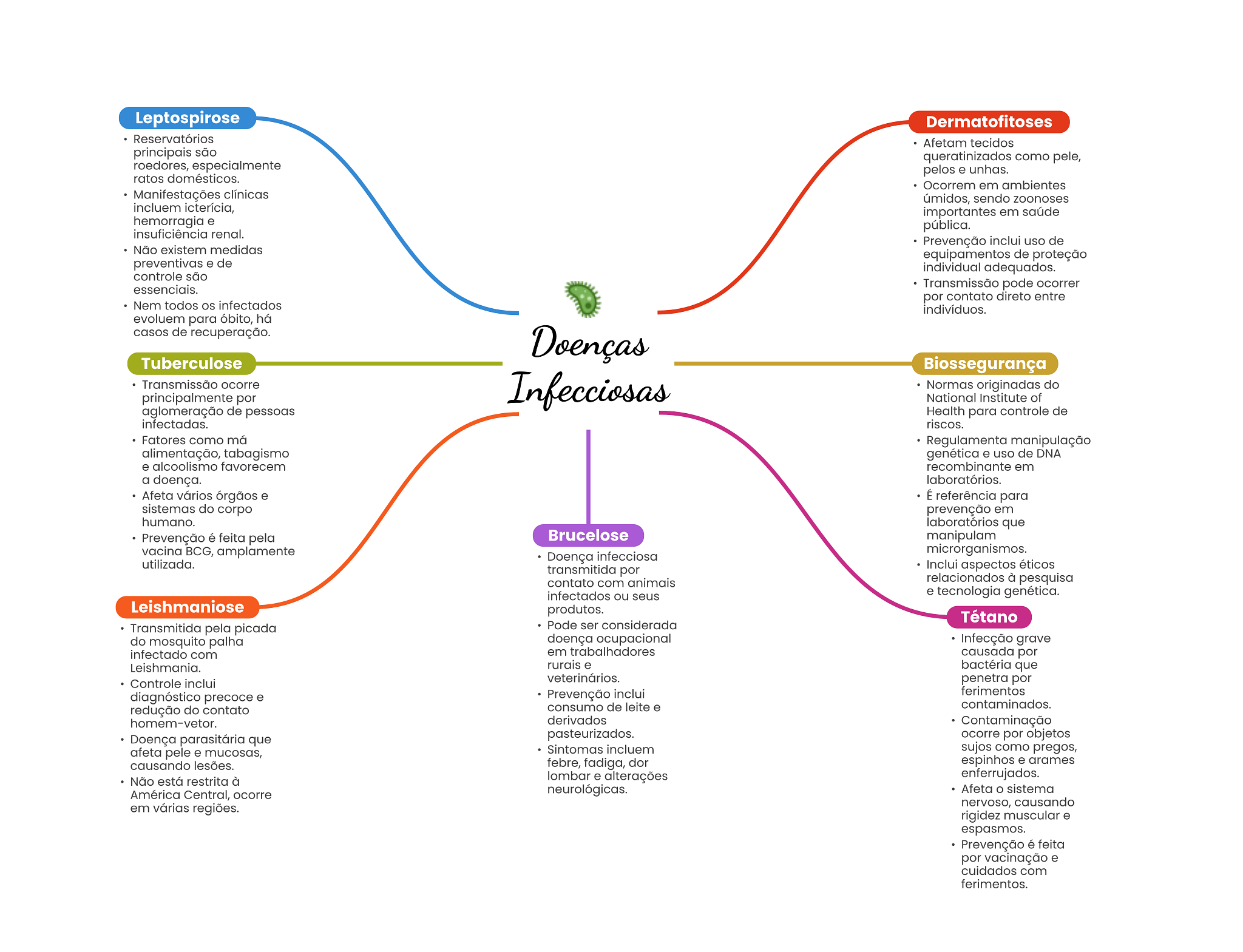 Leptospirose Dermatofitoses Reservatórios Afetam tecidos principais são queratinizados como pele, roedores, especialmente pelos e unhas. ratos domésticos. Ocorrem em ambientes Manifestações clínicas úmidos, sendo zoonoses incluem icterícia, importantes em saúde hemorragia e pública. insuficiência renal. Prevenção inclui uso de Não existem medidas equipamentos de proteção preventivas e de individual adequados. controle são essenciais. Transmissão pode ocorrer por contato direto entre Nem todos infectados indivíduos. evoluem para óbito, há casos de recuperação. Doenças Tuberculose Biossegurança Transmissão ocorre Infecciosas Normas originadas do principalmente por National Institute of aglomeração de pessoas Health para controle de infectadas. riscos. Fatores como má Regulamenta manipulação alimentação, tabagismo genética e uso de DNA e alcoolismo favorecem recombinante em a doença. laboratórios. Afeta vários órgãos e É referência para sistemas do corpo prevenção em humano. laboratórios que Prevenção é feita pela Brucelose manipulam vacina BCG, amplamente microrganismos. Doença infecciosa utilizada. transmitida por Inclui aspectos éticos contato com animais relacionados à pesquisa infectados ou seus e tecnologia genética. Leishmaniose produtos. Tétano Transmitida pela picada Pode ser considerada do mosquito palha doença ocupacional Infecção grave infectado com em trabalhadores causada por Leishmania. rurais e bactéria que Controle inclui veterinários. penetra por Prevenção inclui ferimentos diagnóstico precoce e redução do contato consumo de leite e contaminados. homem-vetor. derivados Contaminação Doença parasitária que pasteurizados. ocorre por objetos afeta pele e mucosas, Sintomas incluem sujos como pregos, causando lesões. febre, fadiga, dor espinhos e arames lombar e alterações enferrujados. Não está restrita à neurológicas. Afeta O sistema América Central, ocorre em várias regiões. nervoso, causando rigidez muscular e espasmos. Prevenção é feita por vacinação e cuidados com ferimentos.