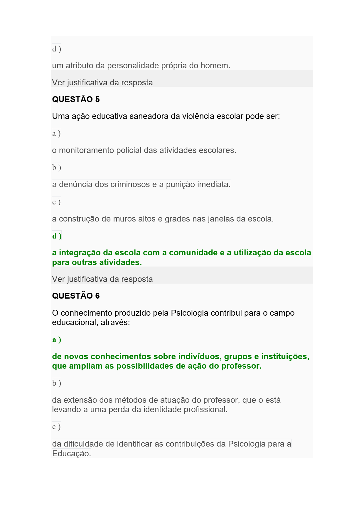 d) um atributo da personalidade própria do homem. Ver justificativa da resposta QUESTÃO 5 Uma ação educativa saneadora da violência escolar pode ser: a) o monitoramento policial das atividades escolares. b) a denúncia dos criminosos e a punição imediata. c) a construção de muros altos e grades nas janelas da escola. d) a integração da escola com a comunidade e a utilização da escola para outras atividades. Ver justificativa da resposta QUESTÃO 6 O conhecimento produzido pela Psicologia contribui para o campo educacional, através: a) de novos conhecimentos sobre indivíduos, grupos e instituições, que ampliam as possibilidades de ação do professor. b) da extensão dos métodos de atuação do professor, que o está levando a uma perda da identidade profissional. c) da dificuldade de identificar as contribuições da Psicologia para a Educação.