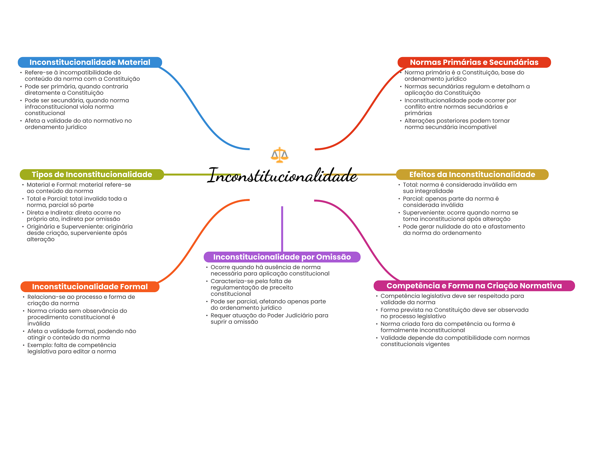 Inconstitucionalidade Material Normas Primárias e Secundárias Refere-se à incompatibilidade do Norma primária é a Constituição, base do conteúdo da norma com a Constituição ordenamento jurídico Pode ser primária, quando contraria Normas secundárias regulam e detalham a diretamente a Constituição aplicação da Constituição Pode ser secundária, quando norma Inconstitucionalidade pode ocorrer por infraconstitucional viola norma conflito entre normas secundárias e constitucional primárias Afeta a validade do ato normativo no Alterações posteriores podem tornar ordenamento jurídico norma secundária incompatível Tipos de Inconstitucionalidade Inconstitucionalidade Efeitos da Material e Formal: material refere-se Total: norma é considerada inválida em ao conteúdo da norma sua integralidade Total e Parcial: total invalida toda a Parcial: apenas parte da norma é norma, parcial só parte considerada inválida Direta e Indireta: direta ocorre no Superveniente: ocorre quando norma se próprio ato, indireta por omissão torna inconstitucional após alteração Originária e Superveniente: originária Pode gerar nulidade do ato e afastamento desde criação, superveniente após da norma do ordenamento alteração Inconstitucionalidade por Omissão Ocorre quando há ausência de norma necessária para aplicação constitucional Caracteriza-se pela falta de Inconstitucionalidade Formal regulamentação de preceito Competência e Forma na Criação Normativa constitucional Relaciona-se ao processo e forma de Competência legislativa deve ser respeitada para criação da norma Pode ser parcial, afetando apenas parte validade da norma Norma criada sem observância do do ordenamento jurídico Forma prevista na Constituição deve ser observada procedimento constitucional é Requer atuação do Poder Judiciário para no processo legislativo inválida suprir a omissão Norma criada fora da competência ou forma é Afeta a validade formal, podendo não formalmente inconstitucional atingir conteúdo da norma Validade depende da compatibilidade com normas Exemplo: falta de competência constitucionais vigentes legislativa para editar a norma