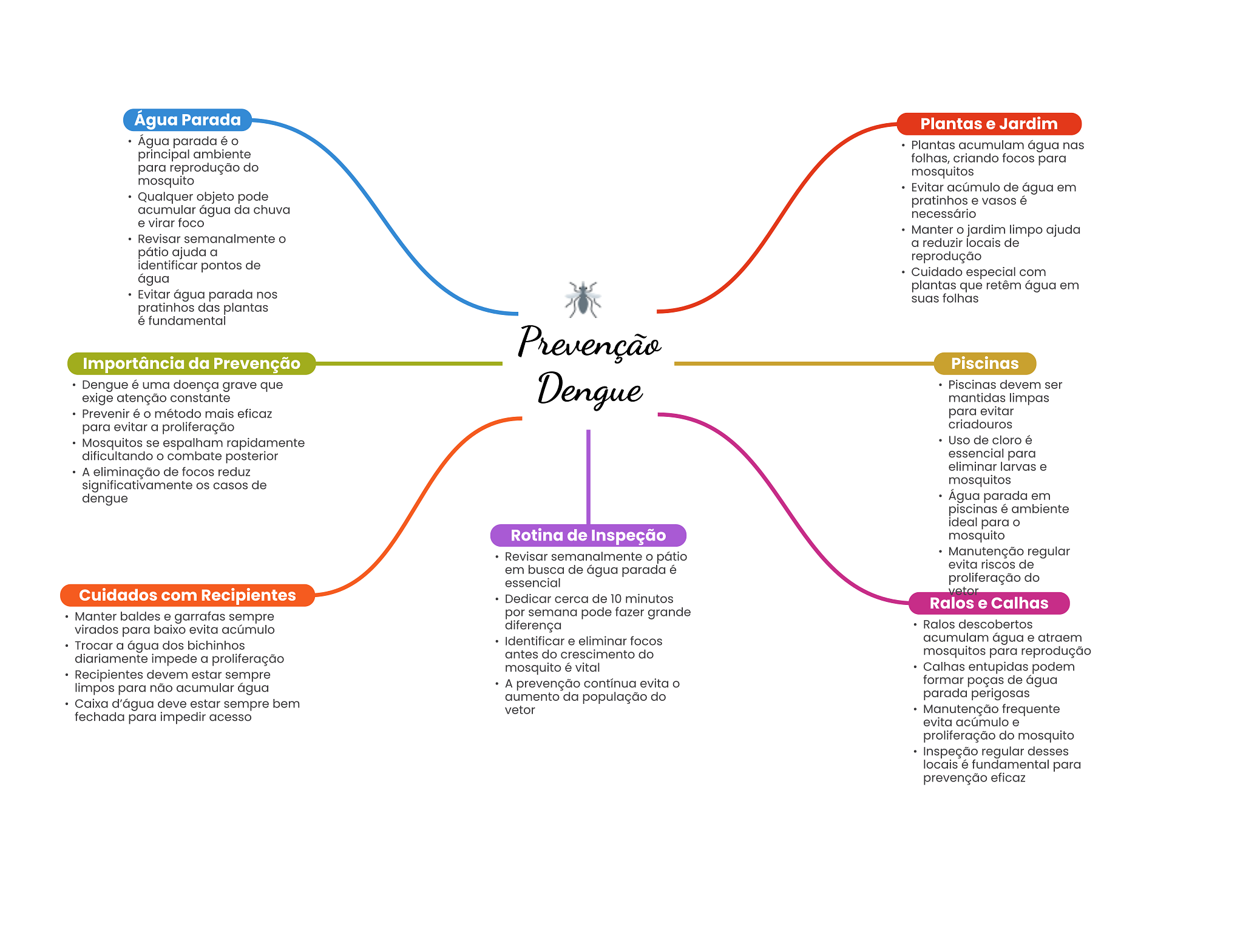 Água Parada Plantas e Jardim Água parada é Plantas acumulam água nas principal ambiente folhas, criando focos para para reprodução do mosquitos mosquito Evitar acúmulo de água em Qualquer objeto pode pratinhos e vasos é acumular água da chuva necessário e virar foco Manter jardim limpo ajuda Revisar semanalmente a reduzir locais de pátio ajuda a reprodução identificar pontos de água Cuidado especial com plantas que retêm água em Evitar água parada nos suas folhas pratinhos das plantas é fundamental Prevenção Importância da Prevenção Piscinas Dengue é uma doença grave que Dengue Piscinas devem ser exige atenção constante mantidas limpas Prevenir é método mais eficaz para evitar para evitar a proliferação criadouros Mosquitos se espalham rapidamente Uso de cloro é dificultando combate posterior essencial para A eliminação de focos reduz eliminar larvas e significativamente OS casos de mosquitos dengue Água parada em piscinas é ambiente ideal para O Rotina de Inspeção mosquito Revisar semanalmente O pátio Manutenção regular evita riscos de em busca de água parada é essencial proliferação do Cuidados com Recipientes vetor Dedicar cerca de 10 minutos Ralos e Calhas Manter baldes e garrafas sempre por semana pode fazer grande virados para baixo evita acúmulo diferença Ralos descobertos Identificar e eliminar focos acumulam água e atraem Trocar a água dos bichinhos antes do crescimento do mosquitos para reprodução diariamente impede a proliferação mosquito é vital Calhas entupidas podem Recipientes devem estar sempre limpos para não acumular água A prevenção contínua evita formar poças de água Caixa d'água deve estar sempre bem aumento da população do parada perigosas vetor Manutenção frequente fechada para impedir acesso evita acúmulo e proliferação do mosquito Inspeção regular desses locais é fundamental para prevenção eficaz
