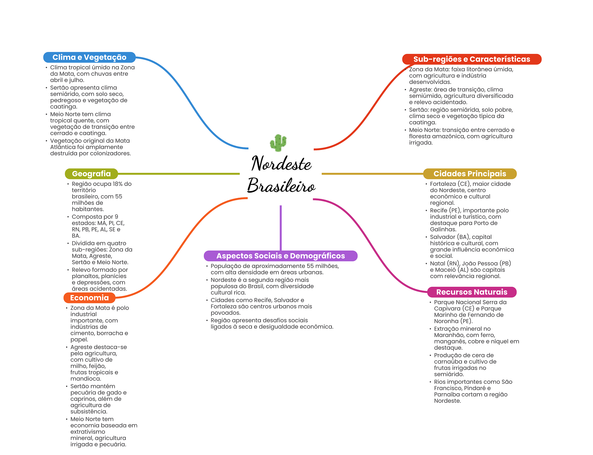 Clima e Vegetação Sub-regiões e Características Clima tropical úmido na Zona Zona da Mata: faixa litorânea úmida, da Mata, com chuvas entre com agricultura e indústria abril e julho. desenvolvidas. Sertão apresenta clima Agreste: área de transição, clima semiárido, com solo seco, semiúmido, agricultura diversificada pedregoso e vegetação de e relevo acidentado. caatinga. Sertão: região semiárida, solo pobre, Meio Norte tem clima clima seco e vegetação típica da tropical quente, com caatinga. vegetação de transição entre cerrado e caatinga. Meio Norte: transição entre cerrado e floresta amazônica, com agricultura Vegetação original da Mata irrigada. Atlântica foi amplamente destruída por colonizadores. Nordeste Geografia Cidades Principais Região ocupa 18% do território Brasileiro Fortaleza (CE), maior cidade do Nordeste, centro brasileiro, com 55 econômico e cultural milhões de regional. habitantes. Recife (PE), importante polo Composta por 9 industrial e turístico, com estados: MA, PI, CE, destaque para Porto de RN, PB, PE, AL, SE e Galinhas. BA. Salvador capital Dividida em quatro histórica e cultural, com sub-regiões: Zona da grande influência econômica Mata, Agreste, Aspectos Sociais e Demográficos e social. Sertão e Meio Norte. População de aproximadamente 55 milhões, Natal (RN), João Pessoa (PB) Relevo formado por com alta densidade em áreas urbanas. e Maceió (AL) são capitais planaltos, planícies com relevância regional. e depressões, com Nordeste é a segunda região mais áreas acidentadas. populosa do Brasil, com diversidade cultural rica. Recursos Naturais Economia Cidades como Recife, Salvador e Parque Nacional Serra da Zona da Mata é polo Fortaleza são centros urbanos mais Capivara (CE) e Parque industrial povoados. Marinho de Fernando de importante, com Região apresenta desafios sociais Noronha (PE). indústrias de ligados à seca e desigualdade econômica. Extração mineral no cimento, borracha e Maranhão, com ferro, papel. manganês, cobre e níquel em Agreste destaca-se destaque. pela agricultura, Produção de cera de com cultivo de carnaúba e cultivo de milho, feijão, frutas irrigadas no frutas tropicais e semiárido. mandioca. Rios importantes como São Sertão mantém Francisco, Pindaré e pecuária de gado e Parnaíba cortam a região caprinos, além de Nordeste. agricultura de subsistência. Meio Norte tem economia baseada em extrativismo mineral, agricultura irrigada e pecuária.