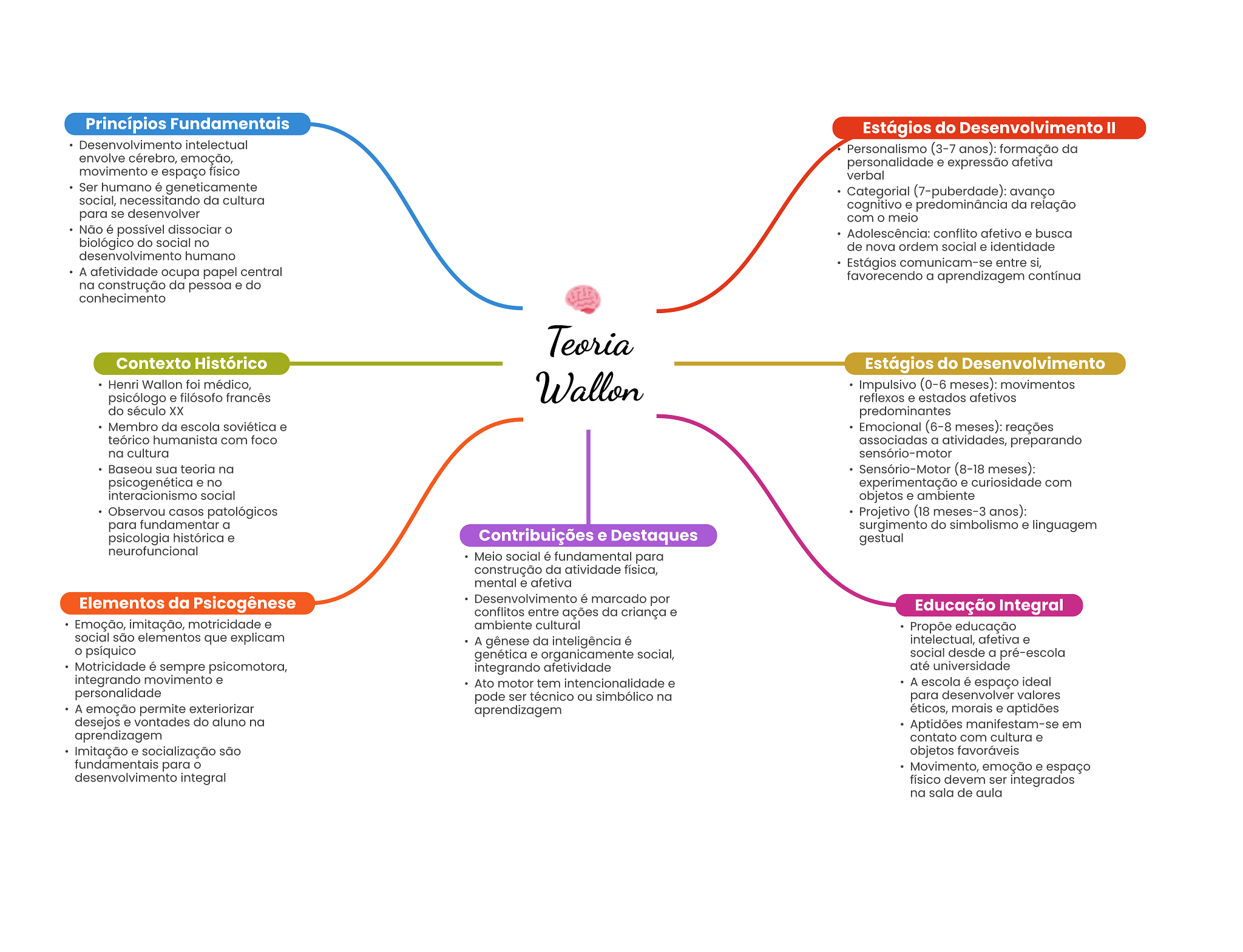 Princípios Fundamentais Estágios do Desenvolvimento II Desenvolvimento intelectual Personalismo (3-7 anos): formação da envolve cérebro, emoção, personalidade e expressão afetiva movimento e espaço físico verbal Ser humano é geneticamente Categorial (7-puberdade): avanço social, necessitando da cultura cognitivo e predominância da relação para se desenvolver com meio Não é possível dissociar Adolescência: conflito afetivo e busca biológico do social no de nova ordem social e identidade desenvolvimento humano Estágios comunicam-se entre si, A afetividade ocupa papel central favorecendo a aprendizagem contínua na construção da pessoa e do conhecimento Teoria Contexto Histórico Estágios do Henri Wallon foi médico, Wallon Impulsivo (0-6 meses): movimentos psicólogo e filósofo francês reflexos e estados afetivos do século XX predominantes Membro da escola soviética e Emocional (6-8 meses): reações teórico humanista com foco associadas a atividades, preparando na cultura sensório-motor Baseou sua teoria na Sensório-Motor (8-18 meses): psicogenética e no experimentação e curiosidade com interacionismo social objetos e ambiente Observou casos patológicos Projetivo (18 meses-3 anos): para fundamentar a surgimento do simbolismo e linguagem psicologia histórica e Contribuições e Destaques gestual neurofuncional Meio social é fundamental para construção da atividade física, mental e afetiva Elementos da Psicogênese Desenvolvimento é marcado por conflitos entre ações da criança e Educação Integral Emoção, imitação, motricidade e ambiente cultural Propõe educação social são elementos que explicam A gênese da inteligência é intelectual, afetiva e psíquico genética e organicamente social, social desde a pré-escola Motricidade é sempre psicomotora, integrando afetividade até universidade integrando movimento e Ato motor tem intencionalidade e A escola é espaço ideal personalidade pode ser técnico ou simbólico na para desenvolver valores A emoção permite exteriorizar aprendizagem éticos, morais e aptidões desejos e vontades do aluno na Aptidões manifestam-se em aprendizagem contato com cultura e Imitação e socialização são objetos favoráveis fundamentais para Movimento, emoção e espaço desenvolvimento integral físico devem ser integrados na sala de aula