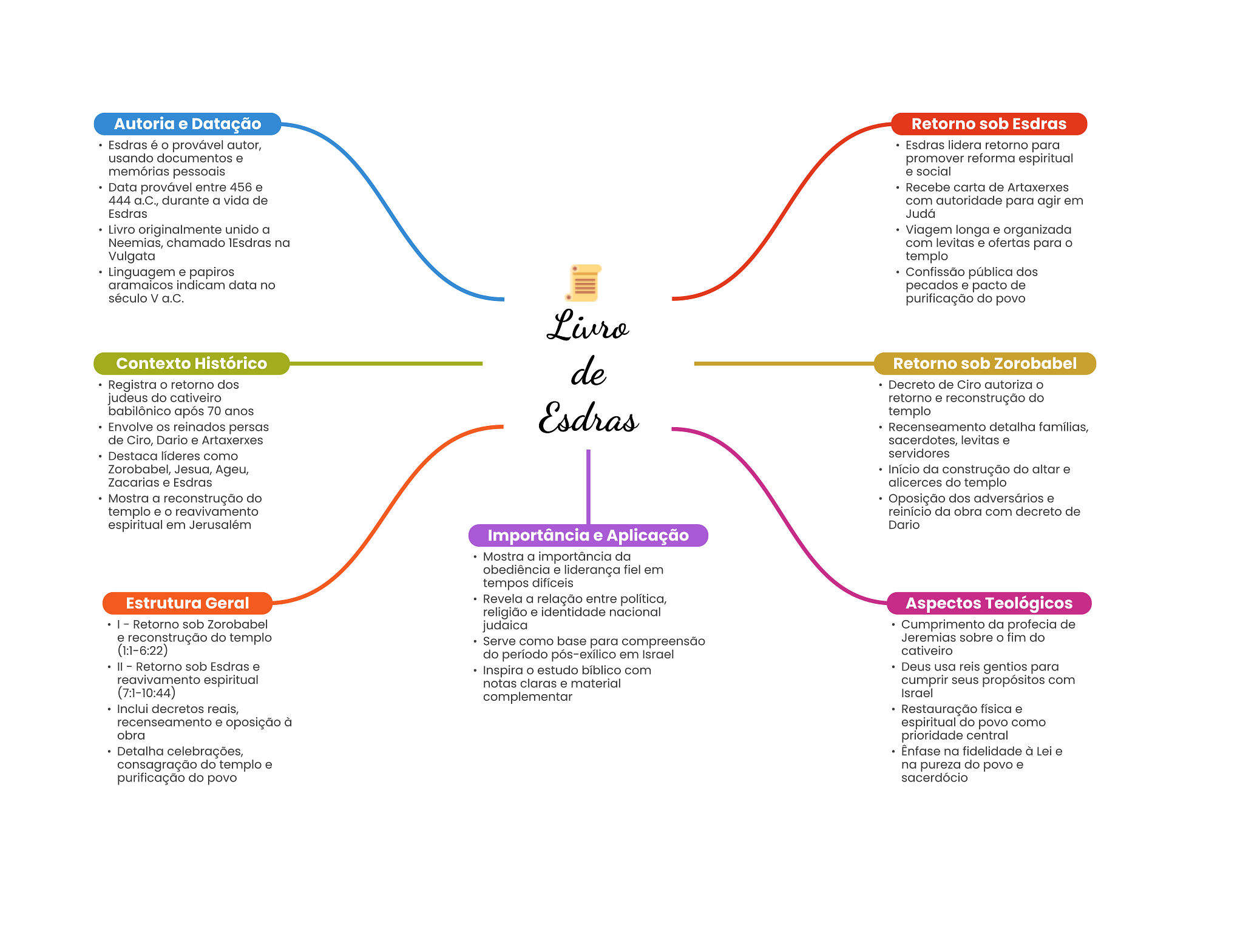 Autoria e Datação Retorno sob Esdras Esdras é provável autor, Esdras lidera retorno para usando documentos e promover reforma espiritual memórias pessoais e social Data provável entre 456 e Recebe carta de Artaxerxes 444 a.C., durante a vida de com autoridade para agir em Esdras Judá Livro originalmente unido a Viagem longa e organizada Neemias, chamado na com levitas e ofertas para Vulgata templo Linguagem e papiros Confissão pública dos aramaicos indicam data no pecados e pacto de século V a.C. purificação do povo Livro Contexto Histórico de Retorno sob Zorobabel Registra retorno dos Decreto de Ciro autoriza judeus do cativeiro retorno e reconstrução do babilônico após 70 anos Esdras templo Envolve reinados persas Recenseamento detalha famílias, de Ciro, Dario e Artaxerxes sacerdotes, levitas e Destaca líderes como servidores Zorobabel, Jesua, Ageu, Início da construção do altar e Zacarias e Esdras alicerces do templo Mostra a reconstrução do Oposição dos adversários e templo e reavivamento reinício da obra com decreto de espiritual em Jerusalém Dario Importância e Aplicação Mostra a importância da obediência e liderança fiel em tempos difíceis Estrutura Geral Revela a relação entre política, Aspectos Teológicos religião e identidade nacional I Retorno sob Zorobabel judaica Cumprimento da profecia de e reconstrução do templo Serve como base para compreensão Jeremias sobre fim do (1:1-6:22) do período pós-exílico em Israel cativeiro Retorno sob Esdras e Inspira estudo bíblico com Deus usa reis gentios para reavivamento espiritual notas claras e material cumprir seus propósitos com (7:1-10:44) complementar Israel Inclui decretos reais, Restauração física e recenseamento e oposição à espiritual do povo como obra prioridade central Detalha celebrações, Ênfase na fidelidade à Lei e consagração do templo e na pureza do povo e purificação do povo sacerdócio