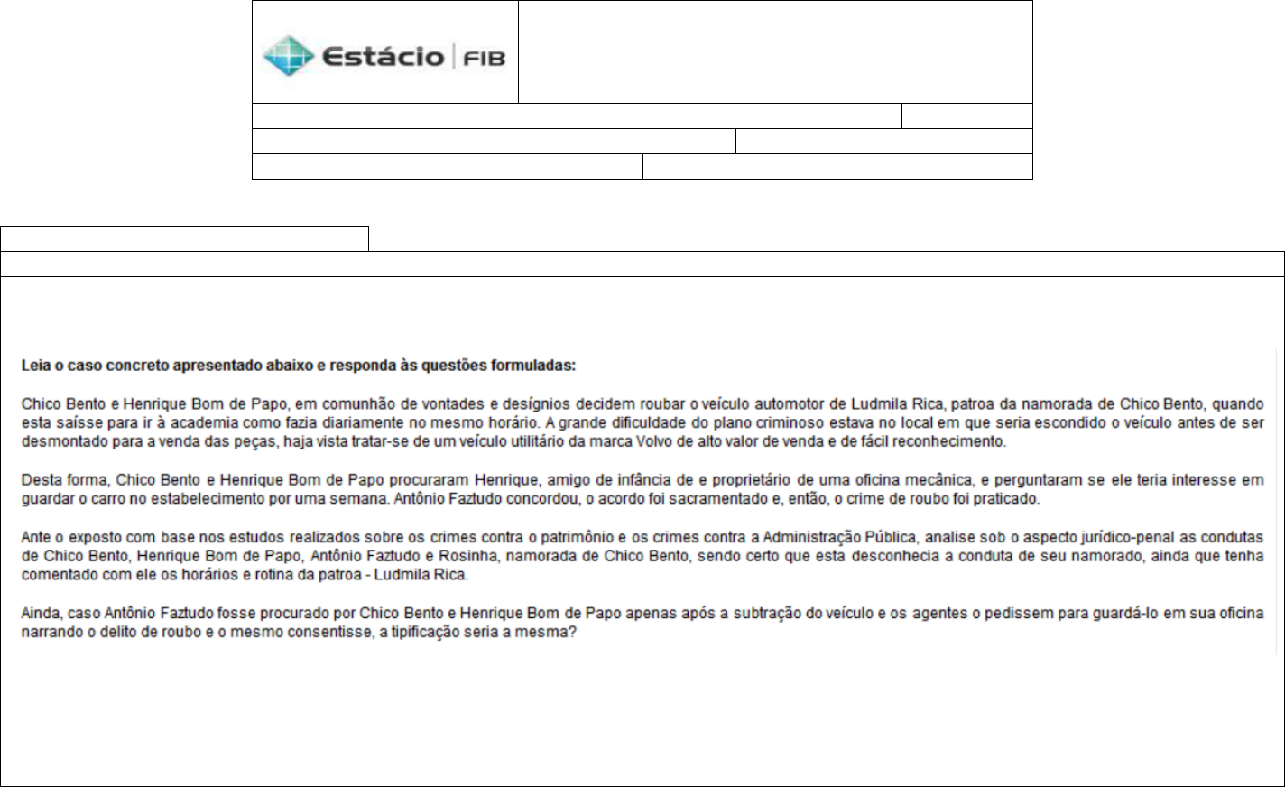 Aula: V 5 - Crimes Contra a Administração da Justiça V. Instituição: Faculdade de Direito Estácio FIB Ano: 2016.1 Aluno: ROBSON FERREIRA. Matricula: 201402019939 Professor: MARISTELA BARBOSA. Disciplina: DIREITO PENAL IV Caso conreto I Questão CASO CONCRETO Resposta: questão um pouco confusa, creio eu que na primeira situação ele não sabia do fato nesse caso irei interpretar a figura de Henrique como se fosse a de Antonio faztudo. Faz mister a observância da distinção das figuras do favorecimento real (art. 349 do CP.) e a da receptação (art. 180 CP.). Destarte as definições de ambas são: Favorecimento real Art. 349. Prestar a criminoso, fora dos casos de coautoria ou de receptação, auxílio destinado a tornar seguro o proveito do crime: Pena - detenção, de 1 (um) a 6 (seis) meses, e multa. Receptação Art. 180. Adquirir, receber, transportar, conduzir ou ocultar, em proveito próprio ou alheio, coisa que sabe ser produto de crime, ou influir para que terceiro, de boa-fé, a adquira, receba ou oculte: Pena - reclusão, de 1 (um) a 4 (quatro) anos, e multa. Para Fernando Capez as figuras da receptação e favorecimento real são distintas da seguinte maneira: (...) Favorecimento real e receptação. É mais uma vez exigência expressa do tipo penal que o auxílio ao criminoso seja prestado fora dos casos de receptação. Assinalemos as distinções entre ambos os delitos: a) na receptação o agente atua com o intuito de satisfazer interesse econômico próprio ou alheio e não do autor do crime antecedente; no favorecimento real o agente atua com a finalidade de satisfazer interesse do autor do delito antecedente; b) na receptação o receptador visa proveito de natureza econômica, ao passo que no favorecimento o proveito pode ser de ordem econômica ou moral; c) conforme Hungria, “a receptação visa à coisa (produto do crime), enquanto o favorecimento visa, principalmente, à pessoa do autor do crime”. CAPEZ, Fernando, Direito Penal 3, 12º edição, 2014. Distingui-se a intenção do autor se for para proveito próprio (econômico, pessoal), estaremos diante de um crime de receptação conforme art. 180 CP. se for para “ajudar alguém” (nos crimes que não se enquadrem na coautoria, participe ou receptação), com a intenção de ocultar o objeto do crime estaremos diante de um crime de favorecimento real conforme art. 349 CP. Faz mister que se defina as condutas incriminadoras do tipo penal receptação art. 180 do CP. Caput. Conforme Pedro Lenza: Adquirir: obter a propriedade, a título oneroso (compra e venda ou permuta) ou gratuito (doação). Receber: obter a posse, ainda que transitoriamente. Ex.: receber um carro para guardar na garagem de sua casa, sabendo que ele é furtado. Resumo e resposta concreta: ante ao que foi estudado e o que se pede no caso concreto em tela trata-se de favorecimento real conforme art. 349 do CP. Pois o individuo Antonio Faztudo não visa angariar vantagem financeira e tão somente ajudar ou da guarita ao produto do furto do amigo sem exigir vantagem financeira ou qualquer outro favorecimento pessoal. Caso ele pedisse ou obtivesse vantagem financeira estaríamos diante de um crime de receptação conforme art. 180 do CP. O importante na definição do crime de favorecimento real é subjetividade da conduta. Resposta: correta letra “B”. Errado: letra “A” por se tratar de favorecimento real (coisa) art. 349 do CP. e não pessoal, o favorecimento pessoal art. 348 do CP. é ajudar a autor de crime na fuga escondendo-o. Correto: letra “B” trata-se de escusa absolutória conforme art. 348 §2º do CP.(...) ESCUSA ABSOLUTÓRIA - A escusa absolutória está prevista no § 2º, constituindo causa extintiva de punibilidade incidente sobre determinados parentes. Assim, de acordo com o § 2º, “se quem presta auxílio é ascendente, descendente, cônjuge ou irmão do criminoso, fica isento de pena”. A enumeração legal, a despeito de ser taxativa, alcança a união estável, por força de equiparação constitucional (CF, art. 226, § 5º), bem como todas as formas de filiação, inclusive o parentesco por adoção, dado ser vedado tratamento discriminatório aos descendentes, pouco importando a natureza do vínculo (CF, art. 227, § 6º). Fernando Capez. Errado: letra “C” trata-se do modo da subjetividade do agente conforme Fernando Capez (...)Se o agente, antes da prática do crime principal, se comprometer a tornar seguro o proveito do delito, responderá como partícipe do crime original. Por exemplo: “A” compromete-se a esconder os objetos que “B” venha a furtar. Se “B” efetivamente realizar a subtração, “A” responderá como partícipe do crime de furto. Se não responderá apenas pelo crime praticado. Errado: letra “D”por se tratar de crime de favorecimento pessoal e não real. Errado: letra “E” pelo crime de receptação encontra-se nos crimes de DA RECEPTAÇÃO – CAPITULO VII – Do CP. ROBSON FERREIRA 201402019939