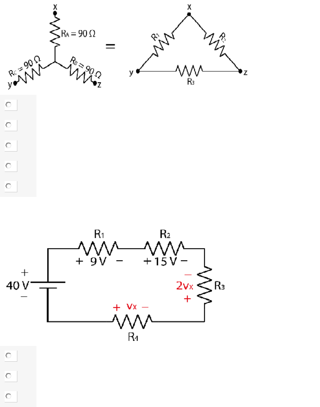 Calcule os valores de R1, R2 e R3 nos circuitos equivalentes abaixo utilizando a transformação DELTA-ESTRELA e assinale a alternativa correta. A R1=270 ohms; R2=90 ohms; R3=180 ohms. B R1=270 ohms; R2=270 ohms; R3=270 ohms. C R1=270 ohms; R2=180 ohms; R3=90 ohms. D R1=270 ohms; R2=180 ohms; R3=180 ohms. E R1=270 ohms; R2=90 ohms; R3=90 ohms. Considerando o circuito a seguir, calcule o valor da tensão vx e assinale a alternativa correta. A vx=12 V. B vx=0 V. C vx=5,33 V. D vx=-5,33 V. E vx=-5 V. Questão 3/5 - Eletricidade No circuito abaixo, sabe-se que a resistência equivalente do circuito é de 40 ohms. Calcule o valor do resistor R4 e assinale a alternativa correta. A R4=9 ohms. B R4=18 ohms. C R4=3 ohms. D R4=25 ohms. E R4=40 ohms. Questão 4/5 - Eletricidade Considerando o nó representado pela imagem a seguir, determine a intensidade da corrente ix. Considere i1=10 A, i2=20 A e i3=12 A e i4=8 A. A ix=52 A. B ix=-52 A. C ix=12 A. D ix=-12 A. E ix=-60 A. Questão 5/5 - Eletricidade Considere as seguintes correntes elétricas: ix; i1=2 A; i2=8 A; i3=12 A; i4=25 A. Sabendo que as correntes ix; i1 e i3 entram no nó P e que as correntes i2 e i4 saem do nó P, calcule o valor da corrente ix e assinale a alternativa correta. A ix=28 A. B ix=-19 A. C ix=-27 A. D ix=10 A. E ix=19 A. APOL 2 Questão 1/5 - Eletricidade Calcular as tensões dos nós do circuito a seguir utilizando a análise nodal. A V1 = -2,63 V e V2 = 1,69 V B V1 = 1,65 V e V2 = 4,31 V C V1 = -6,72 V e V2 = -7,41 V D V1 = 6,72 V e V2 = 7,41 V E V1 = -0,65 V e V2 = -2,9 V Calcular as tensões dos nós do circuito a seguir utilizando a análise nodal. A V1 = 11,05 V e V2= 8,42 V B V1 = 11,05 V e V2= -8,42 V C V1 = 25,1 V e V2= 12,7 V D V1 = 25,1 V e V2= -12,7 V E V1 = 12,7 V e V2= 25,1 V Utilizar o teorema de Norton no circuito abaixo para calcular os valores de iN e RN. Assinale a alternativa correta. A iN = 5 A; RN = 2,5 ohms B iN = 1,6 A; RN = 7,5 ohms C iN = 2,4 A; RN = 7,5 ohms D iN = 2,4 A; RN = 30 ohms E iN = 1,6 A; RN = 30 ohms Questão 4/5 - Eletricidade Calcular o valor da corrente ix utilizando o teorema de Thévenin entre os terminais a e b no circuito da figura a seguir. Assinale a alternativa correta. A ix = 313 mA B ix = 160 mA C ix = 0 A D ix = -160 mA E ix = -313 mA Questão 5/5 - Eletricidade Utilizar o teorema de Norton no circuito abaixo para calcular os valores de iN e RN. Assinale a alternativa correta. A iN = -3,5 A; RN = 5 ohms B iN = 2 A; RN = 5 ohms C iN = 2 A; RN = 20 ohms D iN = 3,5 A; RN = 20 ohms E iN = 3,5 A; RN = 5 ohms APOL 3 Questão 1/5 - Eletricidade Calcular a constante de tempo (T) do circuito abaixo e assinale a alternativa correta. A T = 1 us. B T = 10 us. C T = 100 us. D T = 1 ms. E T = 10 ms. Questão 2/5 - Eletricidade Calcular a tensão vx no circuito abaixo utilizando o método das correntes de malha. Assinale a alternativa correta. A vx = -1 V. B vx = 1 V. C vx = -1,538 V. D vx = 1,538 V. E vx = 0 V. Questão 3/5 - Eletricidade No circuito abaixo, considerando que o capacitor estava descarregado antes do fechamento da chave, após quanto tempo a tensão do capacitor será aproximadamente igual à tensão da fonte? Assinale a alternativa correta. A 1 s. B 2 s. C 3 s. D 4 s. E 5 s. 0:00:57 Questão 4/5 - Eletricidade Calcular a função da tensão do circuito considerando que v(0) = 0 V e i(0) = 3 A. Assinale a alternativa correta. A v(t) = 12t e-10t V. B v(t) = 120t e-120t V. C v(t) = -120t e-10t V. D v(t) = -120t e-120t V. E v(t) = 120t e-10t V. Questão 5/5 - Eletricidade No circuito da figura abaixo, considerando que a corrente no indutor antes do fechamento da chave era nula, calcular a constante de tempo (T) do circuito e o valor final da corrente no indutor (iL) após um longo período de tempo do fechamento da chave. Assinale a alternativa correta. A T = 1 s; iL = 7,5 mA. B T = 1 us; iL = 7,5 mA. C T = 1 us; iL = 15 mA. D T = 1 ms; iL = 7,5 mA. E T = 1 ms; iL =15 mA APOL 4 Questão 1/5 - Eletricidade Encontrar os fasores das funções v1 = 10 cos(200t + 15°), v2 = 15 cos(200t) e v3 = 5 sen(200t), considerando V2 como sendo o fasor de referência. Assinale a alternativa correta. A B C D E Questão 2/5 - Eletricidade Um indutor de 4 H possui um núcleo com área (A) de 1 m2, permeabilidade magnética (u) de 1 H/m e comprimento (l) de 1 m. Qual é o número de espiras deste indutor? A 4. B 2. C 1,5. D 1. E 0,5. Questão 3/5 - Eletricidade Obter o circuito equivalente de Thévenin do circuito a seguir, sabendo que: A B C D E Questão 4/5 - Eletricidade Obter o circuito equivalente de Norton do circuito a seguir, considerando que: A B C D E Questão 5/5 - Eletricidade No circuito da figura a seguir, calcular as correntes de malha I1 e I2. Assinale a alternativa correta. A I1 = 0,55 + j 0,165 A; I2 = 2 + j 2 A. B I1 = 1,468 + j 0,44 A; I2 = 0 - j 0 A. C I1 = 1,468 + j 0,44 A; I2 = 0 + j 2 A. D I1 = 0,55 + j 0,165 A; I2 = -2 + j 0 A. E I1 = 1,468 - j 0,44 A; I2 = 2 + j 0 A. APOL 5 Questão 1/5 - Eletricidade Obter os valores de Zth e Vth e do circuito equivalente de Thévenin do circuito a seguir. A B C D E No circuito da figura abaixo, calcular a indutância equivalente sabendo que L1=1 H; L2=2 H; L3=3 H; L4=2 H; M12=0,3 H; M13=0,2 H; M14=0,2 H; M23=0,2 H; M24=0,2 H e M34=0,2. A 7,8 H. B 7,5 H. C 8,0 H. D 7,4 H. E 7,2 H. Questão 3/5 - Eletricidade Calcule a indutância equivalente do circuito abaixo e assinale a alternativa correta sabendo que L1 = 2 H, L2 = 4 H e M12 = 1 H. A 7 H. B 8 H. C 5 H. D 3 H. E 1 H. Questão 4/5 - Eletricidade Se uma fonte de tensão v(t) = 220cos(314,16t) V alimenta uma carga composta de um indutor de 0,5 H conectado em série a um conjunto composto por um resistor de 50 ohms em paralelo com um capacitor de 63,66 uF, calcular a corrente que circula no resistor. (Considere o fasor da fonte de tensão como referência). A B C D E Questão 5/5 - Eletricidade Calcule a corrente I0 do circuito a seguir e assinale a alternativa correta. A B C D E