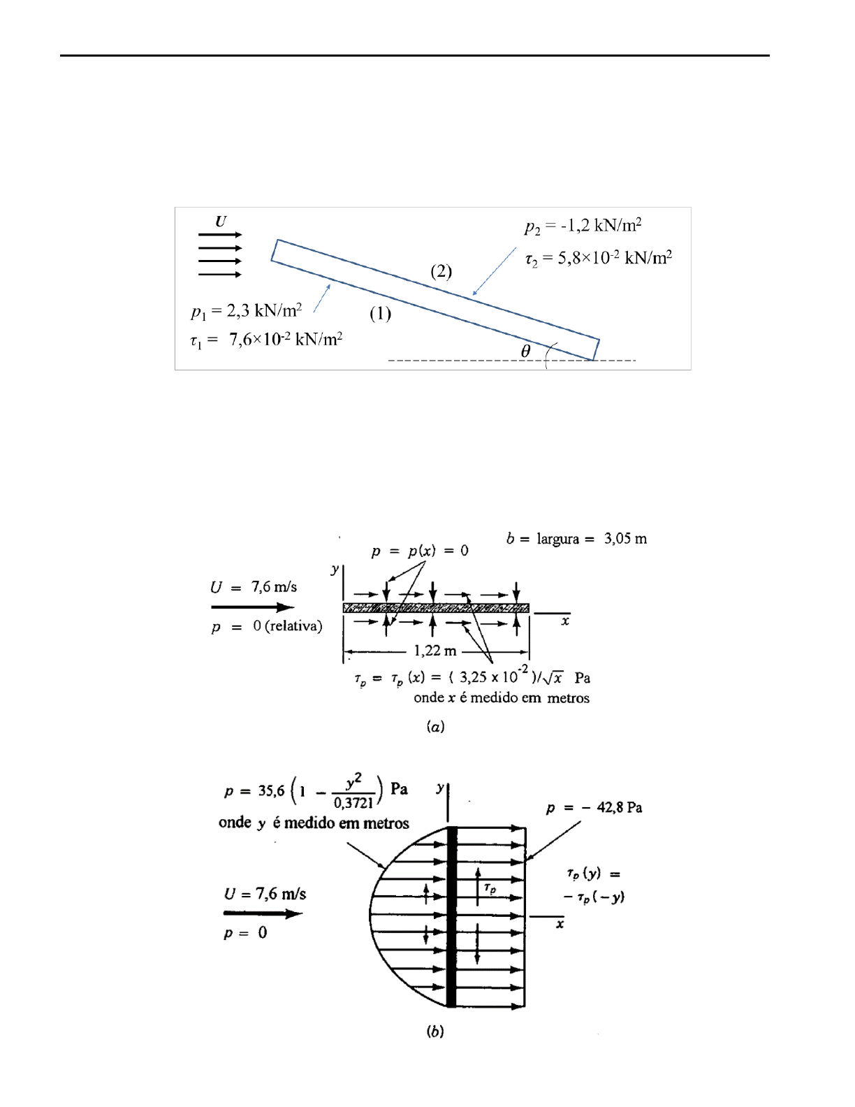1 Lista 1 – Fenômenos de Transporte III – Escoamento Externo, Arrasto e Sustentação 1 A figura abaixo mostra as pressões e as tensões de cisalhamento médias que atuam sobre as superfícies (1) e (2) de uma placa plana quadrada com 1,0 m de lado com um ângulo de ataque θ = 7°. Considere que nas outras superfícies p e τ são aproximadamente nulas. a) Calcule o arrasto e a sustentação na placa. b) Determine a sustentação e o arrasto admitindo que as forças de cisalhamento são nulas. Compare os dois conjuntos de respostas. Resp.: a) D = 559 N; L = 3457 N; b) D = 426 N; L = 3474 N. 2 (Exemplo 9.1, pág. 484, Munson, 4ª Ed.) Ar, no estado padrão, escoa sobre a placa plana mostrada na Figura abaixo. No caso (a), a placa está paralela ao escoamento ao longe e no caso (b) está posicionada perpendicularmente ao escoamento. Se a pressão e a tensão de cisalhamento sobre a superfície são as indicadas na Figura, determine as forças de sustentação e o arrasto na placa. Resp.: a) L = 0; D = 0,44 N; b) L = 0; D = 247,6 N. 2 3 (Problema 9.1, pág. 548, Munson, 4ª Ed.) Água escoa em torno da barra mostrada na figura abaixo. A barra tem 0,61 m de comprimento e sua seção transversal é um triângulo equilátero de 30,5 mm de lado. O escoamento produz a distribuição simétrica de pressão indicada na figura. a) Determine a sustentação e o arrasto na barra. b) Calcule, também, os coeficientes de sustentação e arrasto correspondentes baseados na área frontal da barra. Despreze as forças de cisalhamento. Dado: ρ = 999 kg/m3. Resp.: a) D = 21,5 N; L = 0; b) CD = 1,00; CL = 0. 4 Determine os coeficientes de sustentação e arrasto (baseados na área frontal) para o objeto bidimensional triangular mostrado na figura a seguir. A distribuição de pressão é simétrica. Despreze as forças de cisalhamento. Resp.: CD = 1,7; CL = 0. 5 (Problema 9.2, pág. 548, Munson, 4ª Ed.) Um fluido escoa em torno da barra bidimensional mostrada na Figura abaixo. Observe que a figura também indica os valores da pressão nas superfícies frontal e posterior da barra e que a tensão de cisalhamento média na superfície superior e inferior da barra vale τmed. Note que a pressão nas paredes superior e inferior são nulas e a tensão de cisalhamento nas paredes frontal e posterior também são nulas em aproximação. a) Determine τmed em função da pressão dinâmica pdin = ρU2/2. b) Determine o coeficiente de arrasto deste objeto. Sugestão: admita que o arrasto devido a pressão Dp é igual aquele devido aos efeitos viscosos (atrito) DA. Resp.: a) τmed = 0,03ρU2; b) CD = 2,40. 1 Lista 2 – Fenômenos de Transporte III – Escoamento Externo, Camada Limite sobre uma Placa Plana 2 Se a velocidade ao longe do escoamento no problema anterior é U = 1,5 m/s, determine a viscosidade cinemática do fluido. Resp.: ν = 6,65 × 10-6 m2/s. 1 (Exercício 14.37, pág. 382, Moran, 5ª Ed.) Um fluido viscoso escoa sobre uma placa plana e a espessura de camada limite é 12 mm a 1,3 m do bordo de ataque da placa. Determine a espessura da camada limite a 0,2; 2,0 e 20 m do bordo de ataque. Admita que o escoamento é laminar. Resp.: δ = 4,7 mm; δ = 14,9 mm e δ = 47,1 mm. 3 (Problema 9.13, pág. 574, Munson, 2ª Ed., Vol. 2) A espessura da camada limite num determinado ponto de uma placa plana é igual a 45 mm. Qual seria a espessura da camada limite se esta fosse definida como a distância da placa até o ponto onde a velocidade é igual a 97% do valor ao longe, em vez de 99%. Admita que o escoamento é laminar. Sugestão: use interpolação linear nos resultados numéricos da solução de Blasius. Resp.: δ = 38,7 mm. 4 (Problema 9.12, pág. 549, Munson, 4ª Ed.) Água escoa sobre uma placa plana com velocidade ao longe igual a 0,02 m/s. Determine a velocidade do escoamento u a 10 mm de altura da placa, admitindo que a distância ao bordo de ataque da placa é igual a a) 1,5 m e b) 15 m. Sugestão: use interpolação linear nos resultados numéricos da solução de Blasius. Dado: ν = 1,12 × 10-6 m2/s. Resp.: a) u = 7,17 x 10-3 m/s; b) u = 2,29 x 10-3 m/s. 5 (Problema 9.16, pág. 549, Munson, 4ª Ed.) Uma placa plana lisa com comprimento l = 3,5 m e largura b = 2,5 m, é colocada num escoamento de água que apresenta velocidade ao longe U = 0,14 m/s. Determine a espessura da camada limite e a tensão de cisalhamento na parede a) no centro e b) no bordo de fuga da placa. Dados da água: ρ = 999 kg/m3 e viscosidade dinâmica μ = 1,12 × 10-3 N·s/m2. Resp.: a) δ = 18,7 mm e τ = 0,0139 N/m2; b) δ = 26,5 mm e τ = 0,0098 N/m2. 6 (Problema 9.17, pág. 550, Munson, 4ª Ed.) Uma camada limite atmosférica é formada quando o vento sopra sobre a superfície da Terra. Normalmente, estes perfis de velocidade podem ser aproximados pela lei de potência: u(y) = a·yn, onde as constantes a e n dependem da rugosidade do terreno. A Figura abaixo mostra que para áreas urbanas, n = 0,4, para a zona rural ou de subúrbio, n = 0,28 e, para grandes planícies, n = 0,16. a) Se a velocidade no convés de um barco (y = 1,22 m) for igual a 6,1 m/s, determine a velocidade na ponta do mastro (y = 9,14 m). b) Se a velocidade média no décimo andar de um edifício é 4,5 m/s, qual será a velocidade média no sexto andar do edifício? Resp.: a) u = 8,42 m/s; b) u = 3,67 m/s. 2 7 (Problema 9.18, pág. 550, Munson, 4ª Ed.) Um edifício comercial com 30 andares (cada andar apresenta altura igual a 3,7 m) está localizado em um subúrbio industrial. Construa o gráfico da pressão dinâmica, pdin = ρu2/2, em função da altura y se a velocidade do vento no topo do edifício é 121 km/h (furacão). Utilize as informações sobre a camada limite atmosférica fornecida no problema anterior. Dado: ρAr = 1,23 kg/m3. Resp.: pdin = 49,71·y0,56. 8 Ar a 0oC (massa específica de 1,29 kg/m3 e viscosidade cinemática de 1,34 x 10-5 m2/s) escoa sobre uma placa plana lisa com velocidade de 4,39 m/s. O comprimento da placa é