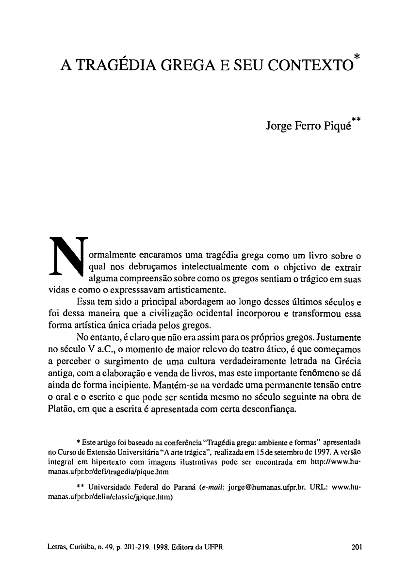 A TRAGÉDIA GREGA E SEU CONTEXTO* * * Jorge Ferro Piqué Normalmente encaramos uma tragédia grega como um livro sobre o qual nos debruçamos intelectualmente com o objetivo de extrair alguma compreensão sobre como os gregos sentiam o trágico em suas vidas e como o expresssavam artisticamente. Essa tem sido a principal abordagem ao longo desses últimos séculos e foi dessa maneira que a civilização ocidental incorporou e transformou essa forma artística única criada pelos gregos. No entanto, é claro que não era assim para os próprios gregos. Justamente no século V a.C., o momento de maior relevo do teatro ático, é que começamos a perceber o surgimento de uma cultura verdadeiramente letrada na Grécia antiga, com a elaboração e venda de livros, mas este importante fenômeno se dá ainda de forma incipiente. Mantém-se na verdade uma permanente tensão entre o oral e o escrito e que pode ser sentida mesmo no século seguinte na obra de Platão, em que a escrita é apresentada com certa desconfiança. * Este artigo foi baseado na conferência "Tragédia grega: ambiente e formas" apresentada no Curso de Extensão Universitária "A arte trágica", realizada em 15 de setembro de 1997. A versão integral em hipertexto com imagens ilustrativas pode ser encontrada em http://www.hu- manas.ufpr.br/defi/tragedia/pique.htm ** Universidade Federal do Paraná (e-mail: jorge@humanas.ufpr.br, URL: www.hu- manas.ufpr.br/delin/classic/jpique.htm) Letras, Curitiba, n. 49, p. 201-219. 1998. Editora da UFPR 201 PIQUÉ, J. F. A tragédia grega e seu contexto Aos poucos, entretanto, a experiência da leitura de tragédias se consolida e é célebre a passagem em que Aristóteles declara que é possível alcançar também o efeito trágico ao apenas 1er uma peça, sem uma performance pública. Embora pudéssemos dizer que deveria ser certamente mais prazeroso apenas 1er tragédias de Esquilo, Sófocles e Eurípides do que ir ao teatro para assistir às peças que eram encenadas no século IV a.C., à época de Aristóteles, nenhuma das quais chegou até nós, certamente por suas poucas qualidades artísticas. Hoje, para nós, a possibilidade mais comum de contato com as tragédias gregas é através de sua transcrição em um livro e em geral em tradução para as línguas européias modernas. Infelizmente no Brasil ainda não temos a nossa disposição montagens regulares e sistemáticas do teatro grego que poderiam sem dúvida abrir novas possibilidades de encontro com o trágico assim como era percebido pelos gregos.1 Mas, apesar dessas poucas montagens esparsas, o que vemos em cena ainda está muito distante do fenômeno trágico como era experimentado em Atenas no século V a.C. Será portanto o objetivo deste artigo fornecer alguns dados obtidos pelas investigações recentes sobre o ambiente geral da performance teatral trágica, ambiente em seu sentido mais amplo, isto é, sua inserção social e cultural e suas condições materiais de existência, e que em geral não estão acessíveis de forma imediata a um leitor ou mesmo espectador contemporâneo, de modo a termos uma visão mais ampla sobre este tema e podermos, a partir daí, ir adiante no questionamento propriamente do conteúdo trágico, o que pretendemos fazer em um próximo artigo. Os festivais dionisíacos 0 ambiente mais geral onde se insere o teatro trágico ático é o da comunidade, especificamente o da cidade, e o da religião, na forma social de sua expressão. A religião grega pode ser abordada por dois aspectos mais exteriores. De um lado, o lugar sagrado, onde o contato com os deuses se realiza através de sacrifícios, de outro, a festa, quando em determinados dias do ano, aos quais é acrescentada a noite anterior, se dá uma quebra do ritmo cotidiano. Assim, se o templo acentua o espaço da comunidade, a festa acentua a sua temporalidade. 1 No caso das comédias gregas a situação é ainda pior, sendo um acontecimento raro a sua encenação no palco. 202 Letras, Curitiba, n. 49, p. 201-219. 1998. Editora da UFPR PIQUÉ, J. F. A tragédia grega e seu contexto Era nas festas, heortaí, que a religião viva, verdadeiramente praticada, se concentrava. Durante as festividades religiosas o trabalho específico, seja produtivo ou não, cessa, a distribuição social de papéis torna-se mais frouxa e há um clima de descontração generalizado. Mas não só isso. Novos papéis são criados momentaneamente, novos grupos se associam e separam-se. E um momento especial e que de diferentes formas é destacado do cotidiano. Segundo Burkert2 "[...] o contraste em relação ao habitual pode exprimir-se no prazer e na alegria, nos adornos e na beleza, mas também na ameaça e na morte". A tragédia grega era na verdade parte de uma das principais festividades religiosas anuais que se realizavam em Atenas, as Grandes Dionísias Urbanas. Atenas, como as demais cidades gregas, tinha o seu calendário anual recortado por inúmeras e diferentes festas. Na verdade cada cidade grega tinha a sua sucessão particular de festivais religiosos e portanto o seu próprio calendário. Mais ainda, havia festas exclusivas apenas de determinada tribo dentro de uma cidade. Seu número era muito grande, e o calendário melhor conhecido por nós é o ático. Em Atenas, presumimos que seriam por volta de 60 dias dedicados exclusivamente a festividades religiosas durante o ano. Portanto, poderíamos dizer que se vive "normalmente" de uma festa até a outra. Estas são tão significativas que em geral os próprios nomes dos meses ligam-se às festividades mais importantes realizadas naquele período de tempo. No mês Anthesterión, por exemplo, se realizava a festa das Antestérias, a festa das flores e do vinho novo, no início da primavera. A festa na qual eram apresentadas as tragédias gregas era em homenagem ao deus Dioniso. Dioniso era um deus ligado a diversas festividades. Na Ática, que nos interessa mais de perto, havia os seguintes tipos de 