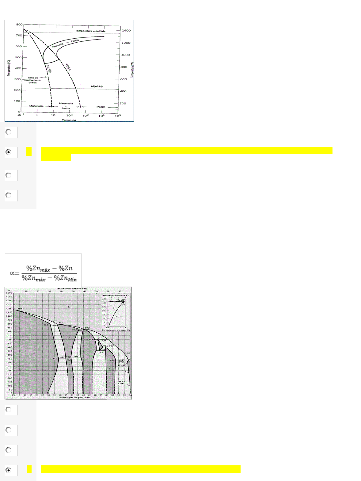 Questão 1/5 - Tecnologia dos Materiais Com base nas curvas TTT e CCT apresentadas abaixo, temos que: A Uma velocidade de resfriamento superior a 140°C/s irá gerar uma estrutura final composta por Martensita e Perlita. B Um tempo de resfriamento de 750°C até a temperatura ambiente de 1000 s leva a uma estrutura composta por Perlita. C Uma velocidade de resfriamento entre 140°C/s e 35°C/s leva a uma estrutura composta por Perlita. D Um tempo de resfriamento de 750°C até a temperatura ambiente de 10 s leva a uma estrutura composta por Martensita. Questão 2/5 - Tecnologia dos Materiais Usando o Diagrama de fases abaixo, e sabendo que a fase alfa é de estrutura cristalina CFC e que a fase beta é de estrutura CCC, verficar para uma liga Zn Cu com 40%Zn e uma com 45%Zn , qual é mais adequada para ser usada em uma aplicação que necessita de maior maleabilidade. Considerar %Zn limite superior 45,5% e %Zn limite inferior 28,5%. A A liga com 40% Zn será mais adequada, pois terá 68% de fase alfa. B A liga com 45% Zn será mais adequada, pois terá 68% de fase alfa. C A liga com 40% Zn será mais adequada, pois terá 3% de fase alfa. D A liga com 45% Zn será mais adequada, pois terá 3% de fase alfa. Questão 3/5 - Tecnologia dos Materiais Ligas de zinco, alumínio e cobre, são conhecidas como ZAMAC , e são ligas para fundição sob pressão. Podem conter também magnésio. Estas ligas possuem ponto de fusão em torno de 385ºC, boas propriedades mecânicas, boa usinabilidade. Podem ser niquelados e cromados, bem como permitem boa aderência de pinturas e vernizes em sua superfície. Tomando como base os dados da tabela abaixo, qual a liga ZAMAC mais adequada para uma aplicação que não permita uma deformação plástica. A Será a ZAMAC 3, pois terá um alongamento de 5-8%, que é maior se comparado com o da ZAMAC 5, que é de 3-6%. B Será a ZAMAC 3, pois terá um limite de elasticidade de 8500 kgf/mm2, que é menor se comparado com o da ZAMAC 5, que é de 9600 kgf/mm2. C Será a ZAMAC 5, pois terá um limite de elasticidade de 9600 kgf/mm2, que é maior se comparado com o da ZAMAC 3, que é de 8500 kgf/mm2. D Será a ZAMAC 5, pois terá um alongamento de 3-6%, que é menor se comparado com o da ZAMAC 3, que é de 5-8%. Questão 4/5 - Tecnologia dos Materiais Os materiais metálicos representam mais de 80% dos materiais de engenharia usados hoje. Com relação a eles, temos que são divididos em dois tipos de ligas. Quais os dois tipos de liga nos quais os materiais metálicos se dividem? A Metais de Baixa liga e alta liga B Ligas ferrosas e ligas não ferrosas C Aços de baixa liga, média liga e alta liga D Ligas ferrosas e compósitos metálicos Questão 5/5 - Tecnologia dos Materiais Latão é uma liga de cobre e zinco tendo teores de zinco que variam de 5% a 50%. Possui estrutura CFC, devido a matriz de cobre, com Zinco sendo introduzido como inclusão substitucional. Como o zinco interfere nas propriedades do cobre ? A Diminui sua resistência a corrosão, diminui sua condutibilidade térmica e elétrica, e aumenta sua resistência mecânica. B Aumenta sua resistência a corrosão, diminui sua condutibilidade térmica e elétrica, e diminui sua resistência mecânica. C Diminui sua resistência a corrosão, aumenta sua condutibilidade térmica e elétrica, e aumenta sua resistência mecânica. D Diminui sua resistência a corrosão, diminui sua condutibilidade térmica e elétrica, e diminui sua resistência mecânica.
