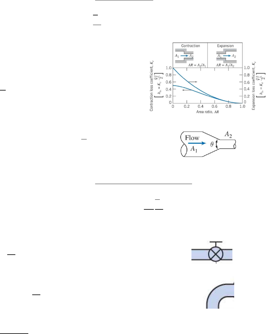 6.4 Perda de Carga Localizada além dos trechos retos de tubulação, temos os acidentes (válvulas, joelhos, expansões e contrações de área...); Cálculo de �� usando o coeficiente de perda �: �� = � � � 2 (proporcional à energia cinética) � = 0,2 (contração súbita na tubulação com �� �� = 0,6) � = 0,07 (contração com �� �� = 0,25 e � = 60�) Cálculo de �� usando o comprimento equivalente de tubo ���: �� = � ��� � � � 2 ��� � = 8 (válvula gaveta totalmente aberta) ��� � = 30 (joelho de 90�) Entradas: Expansões e contrações: Curvas na tubulação: Válvulas e acessórios: (gate valve = válvula gaveta; globe valve = válvula globo; angle valve = válvula em ângulo; ball valve = válvula esfera; lift check valve (globe lift) = válvula de retenção tipo globo; lift check valve (angle lift) = válvula de retenção em ângulo; foot valve with strainer (poppet disk) = válvula de pé com crivo de disco móvel; foot valve with strainer (hinged disk) = válvula de pé com crivo de disco articulado; standard elbow = cotovelo padrão; return bend = curva em "U"; standard tee = "T" padrão) EXERCÍCIOS 9) (Fox, 6a ed., 8.84) Água escoa em um tubo de 25 mm de diâmetro, que sofre um aumento repentino para 50 mm de diâmetro. A vazão volumétrica através da seção de maior diâmetro é de 1,25 L/s. Calcule o aumento de pressão através do aumento de seção. Compare este valor com aquele obtido para escoamento invíscido. 10) (Fox, 8th ed., 8.97) Água escoa, com a vazão de 25 L/s, através de uma contração gradual (gradual contraction) com um ângulo de 150o, e na qual o diâmetro do tubo é reduzido de 75 mm para 37,5 mm. Se a pressão antes da contração é 500 kPa, estime a pressão após a contração. Recalcule a resposta para uma contração abrupta (ângulo de 180o). 11) (Fox, 6a ed., 8.99) Água escoa de um grande tanque através de um tubo de plástico cuja saída está aberta para a atmosfera, em regime permanente. O diâmetro interno do tubo é 3,18 mm, e seu comprimento é 15,3 m. Calcule a vazão volumétrica máxima para a qual o escoamento no tubo permanecerá laminar. Estime o nível de água no tanque abaixo do qual o escoamento será laminar (para escoamento laminar, = 2; Kentrada = 1,4). 12) (Fox, 6a ed., 8.128) O sifão mostrado na figura é feito de um tubo de alumínio estirado de 2 in. de diâmetro. O líquido é água a 60oF. Calcule a vazão volumétrica através do sifão. Estime a menor pressão existente dentro do tubo. 13) (adaptado de Fox, 6a ed., 8.137) Um grande reservatório provê água para uma comunidade. Uma parte do sistema de fornecimento de água é mostrado na figura abaixo. A água é bombeada do reservatório para um grande tanque de armazenamento antes de ser enviada para a estação de tratamento. O sistema é projetado para fornecer 1310L/s de água a 20oC. Do ponto B ao C, o sistema consiste de uma entrada com cantos vivos, 760 m de tubo, 3 válvulas gaveta, 4 cotovelos de 45o e 2 cotovelos de 90o. A pressão manométrica em C é 197 kPa. O sistema entre F e G contém 760 m de tubo, 2 válvulas gaveta e 4 cotovelos de 90o. Todos os tubos têm diâmetro 508 mm e são feitos de ferro fundido. Calcule: a velocidade média da água no tubo, a pressão manométrica na seção F e a potência do motor da bomba (cuja eficiência é de 80%). 14) (Fox, 6a ed., 8.145) Água de resfriamento é bombeada de um reservatório para perfuratrizes de rochas em uma construção, utilizando o sistema mostrado. A vazão volumétrica deve ser 600 galões por minuto e a água deve deixar o bocal do atomizador a 120 ft/s. Calcule a pressão mínima requerida na saída da bomba. Estime a potência do motor da bomba se sua eficiência for de 70% (joints = acessórios quaisquer; gate valve = válvula gaveta - que neste caso está aberta). 15) (Fox, 8th ed., 8.90) Água é bombeada à vazão de 0,075 m3/s de um reservatório cuja superfície está a 20 m acima de uma bomba, até um ponto de descarga livre (free discharge) a 35 m acima da bomba. A pressão na sucção (entrada) da bomba é 150 kPa, e a pressão na descarga da bomba é 450 kPa. Toda a tubulação é feita de aço comercial e tem 15 cm de diâmetro. Determine (a) a carga fornecida pela bomba e (b) a perda de carga total entre a bomba e o ponto de descarga livre. (obs.: elbows are flanged = cotovelos são flangeados) 16) (adaptado de Fox, 6a ed., 8.146) O condicionamento de ar no campus da Purdue University é realizado com água gelada, que é bombeada através de uma tubulação principal de fornecimento. A tubulação faz um ciclo que tem um comprimento total de 3 milhas. Seu diâmetro é 2 ft e seu material é aço. A vazão máxima de projeto é 11200 galões por minuto. O motor da bomba que faz a circulação da água é elétrico. A eficiência da bomba é 0.80. O custo da eletricidade é de 12 centavos/ kWh. Determine (a) a queda de pressão na tubulação, (b) a taxa de adição de energia (pela bomba) à água e (c) o custo diário da energia elétrica utilizado no bombeamento. 17) (Fox, 6a ed., 8.118) Gasolina escoa em um tubo subterrâneo longo, à temperatura de 15oC. Duas estações de bombeamento estão à mesma elevação, mas separadas pela distância de 13km. A queda de pressão entre as duas estações é 1,4 MPa. O tubo possui diâmetro 0,6 m. Apesar de o tubo ser feito de aço comercial, o tempo e a corrosão tornaram sua rugosidade igual à do ferro galvanizado. Calcule a vazão volumétrica de gasolina. 18) (Fox, 6a ed., 8.133) Uma bomba está ao lado de um reservatório, à distância de 15 ft deste e 12 ft acima deste. A bomba é projetada para uma vazão volumétrica de 100 galões por minuto. Para que sua operação seja satisfatória, a pressão estática (manométrica) na bomba não deve ser menor do que - 20 ft H2O. Determine o menor diâmetro da tubulação de aço comerci