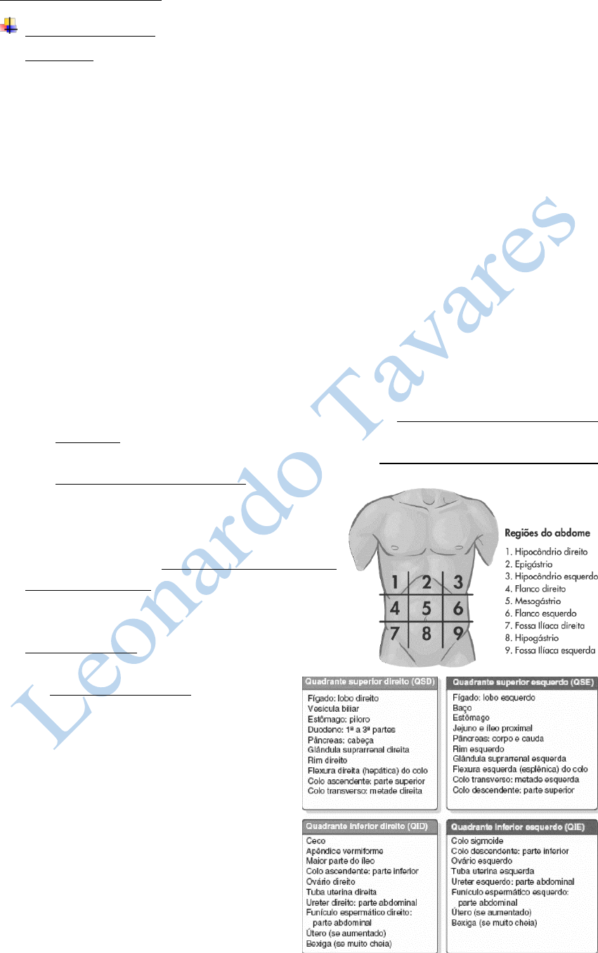 Monitoria Anatomia Abdome e Pelve 1. Abdome É a parte do tronco situada entre o tórax e a pelve. É um receptáculo dinâmico e flexível que abriga a maioria dos órgãos do sistema digestório e parte dos sistemas genital e urinário. CONSIDERAÇÕES GERAIS A parede anterolateral do abdome e diversos órgãos situados adjacentes à parede posterior são recobertos em suas faces internas por uma membrana serosa ou peritônio, que se reflete (dobra-se bruscamente e continua) sobre as vísceras abdominais, como estômago, intestino, fígado e baço. A cavidade abdominal Forma a parte superior e principal da cavidade abdominopélvica, a cavidade contínua que se estende entre o diafragma e o diafragma da pelve. Não tem assoalho próprio porque é contínua com a cavidade pélvica. O plano de abertura superior da pelve é uma separação arbitrária, mas não física, das cavidades abdominal e pélvica. Estende-se superiormente até o 4º espaço intercostal da caixa torácica osteocartilagínea. Órgãos abdominais mais altos (baço, fígado, parte dos rins e estômago) são protegidos pela caixa torácica. A pelve maior sustenta e protege as vísceras abdominais inferiores (parte do íleo, ceco, apêndice vermiforme e colo sigmoide). Nove regiões: delimitadas por quatro planos, dois sagitais (verticais) e dois transversos (horizontais). Os dois planos sagitais geralmente são os planos medioclaviculares (hemiclaviculares), que seguem do ponto médio das clavículas até os pontos medioinguinais. Planos transversais são o plano subcostal, que atravessa a margem inferior da 10ª cartilagem costal de cada lado, e o plano intertubercular, que atravessa os tubérculos ilíacos. PAREDE ANTEROLATERAL DO ABDOME A parede é musculoaponeurótica, exceto a parede posterior, que inclui a região lombar da coluna vertebral. A parede anterolateral do abdome estende-se da caixa torácica até a pelve. Limite superior: cartilagens das VII a X costelas e processo xifoide do esterno. Limite inferior: ligamento inguinal e as margens superiores das faces anterolaterais do cíngulo do membro inferior (cristas ilíacas, cristas púbicas e sínfise púbica). A parede anterolateral do abdome é formada por pele e tela subcutânea, composta principalmente por gordura, músculos, suas aponeuroses e fáscia muscular, gordura extraperitoeal e peritônio parietal. MÚSCULOS DA PAREDE ANTEROLATERAL Músculo Origem Inserção Inervação Ação Oblíquo externo do abdome Faces externas das costelas V a XII Linha alba, tubérculo púbico e metade anterior da crista ilíaca Nervos toracoabdominais (nervos espinhais T7-T11) e nervo subcostal Comprime e sustenta as vísceras abdominais, flexiona e roda o tronco Oblíquo interno do abdome Fáscia toracolombar, dois terços anteriores da crista ilíaca e tecido conjuntivo situado profundamente ao terço lateral do ligamento inguinal Margens inferiores das costelas X a XII, linha alba e linha pectínea do púbis através da foice inguinal Nn. Toracoabdominais (ramos anteriores dos nervos espinais T6-T12) e primeiros nervos lombares Transverso do abdome Faces internas das 7ª a 12ª cartilagens costais, aponeurose toracolombar, crista ilíaca e tecido conjuntivo situado profundamente ao terço lateral do ligamento inguinal Linha alba com aponeurose do M. oblíquo interno do abdome, crista púbica e linha pectínea do púbis através da foice inguinal Comprime e sustenta as vísceras abdominais Reto do abdome Sínfise púbica e crista púbica Processo xifoide e 5ª a 7ª cartilagens costais Nn. Toracoabdominais (ramos anteriores do nervos espinais T6-T12) Flexiona o tronco (vértebras lombares) e comprime as vísceras abdominais; estabiliza e controla a inclinação da pelve (antilordose) A parede anterolateral do abdome tem cinco (pares bilaterais de) músculos: três músculos planos e dois músculos verticais. Músculos planos: oblíquo externo do abdome, oblíquo interno do abdome e o transverso do abdome. Músculos verticais: reto do abdome e piramidal (aparece em 80% das pessoas, mas sem significância). Entre a linha medioclavicular (LMC) e a linha mediana, as aponeuroses dos músculos formam a bainha do músculo reto do abdome, tendínea, aponeurótica e resistente, que envolve o músculo reto do abdome. As aponeuroses se entrelaçam com as companheiras do lado oposto, formando uma rafe mediana, a linha alba, que se estende do processo xifoide até a sínfise púbica. Funções e ações dos músculos da parede abdominal Formam uma sustentação forte e expansível para a parede anterolateral do abdome. Sustentam e protegem as vísceras abdominais contra lesões. Comprimem o conteúdo abdominal para manter ou aumentar a pressão intra- abdominal e, assim, fazem oposição ao diafragma (o aumento da pressão intra- abdominal facilita a expulsão) Movem o tronco e ajudam a manter a postura. INERVAÇÃO DA PAREDE ANTEROLATERAL Nervos toracoabdominais: são formados pelas partes abdominais, distais dos ramos anteriores dos seis nervos espinais torácicos inferiores (T7 a T11); correspondem aos nervos intercostais inferiores distais à margem costal. Ramos cutâneos laterais (torácicos): dos nervos espinais torácicos T7 a T9 ou T10. Nervo subcostal: o grande ramo anterior do nervo espinal T12. Nervos ílio-hipogástrico e ilioinguinal: ramificações terminais do ramo anterior do nervo espinal L1. Ramos cutâneos anteriores do abdome dos nervos toracoabdominais: T7 a T9 inervam a pele superior ao umbigo. T10 inerva a pele ao redor do umbigo. T11, mais os ramos cutâneos dos nervos subcostal (T12), ílio-hipogástrico e ilioinguinal (L1), suprem a pele inferior ao umbigo. VASCULARIZAÇÃO DA PAREDE ABDOMINAL Artéria(s) Origem Musculofrênica Artéria torácica interna Epigástrica superior 10ª e 11ª artérias intercostais posteriores Aorta Subcostal Epigástrica inferior Artéria ilíaca externa Circunflexa ilíaca profunda Circunflexa ilíaca superficial Artéria f