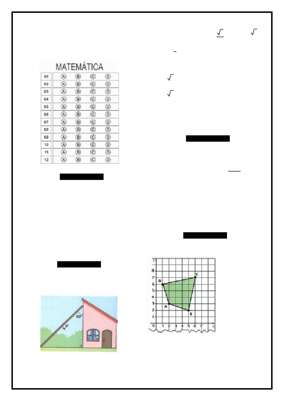 SIMULADO 6 Colégio: ______________________- 3ª Série E.M Sabendo que: ( sen(60º ) = 3 tg(60º ) = 3 2 , Professor: _____________________ Nome: ____________________________ cos(60º ) = 1 2 ). A altura da parede que o pedreiro D4 ––––––––– QUESTÃO 01 –––––––––– Ao passar sua mão direita por todos os vértices e arestas de um octaedro, somente uma vez, um deficiente visual percebe que passou por 6 vértices e 12 arestas. Pela relação de Euler, F + V = A + 2, o número de faces desse poliedro é, então, igual a: (A) 20. (B) 12. (C) 8. (D) 6. (E) 4. D5 ––––––––– QUESTÃO 02 –––––––––––– Para consertar um telhado, o pedreiro Pedro colocou uma escada de 8 metros de comprimento numa parede, formando com ela um ângulo de 60º. apoiou a escada é: (A) 5 m. (B) 4 3 m (C) 8 m. (D) 8 3 m (E) 4 m D33 ––––––––– QUESTÃO 03 ––––––––––– Uma urna contém 10 bolas identificadas pelas letras, A, B, ..., J. Uma bola é extraída ao acaso da urna, e sua letra é observada. A probabilidade de a letra ser uma vogal é: (A) 10% (B) 5% (C) 30 % (D) 50% (E) 40% D6 ––––––––– QUESTÃO 04 –––––––––––– Quatro cidades de grande expressão no setor industrial estão situadas nos pontos do quadrilátero abaixo. As coordenadas que representam as cidades A, B, C e D, respectivamente, são: (A) (1, 6), (6, 7), (5, 2), (4, 3) (B) (6, 1), (7, 6), (2, 5), (3, 4) (C) (6, 7), (1, 6), (2, 5), (3, 4) (D) (4, 3), (5, 2), (6, 7), (1, 6), (E) (–6, 1), (–7, 6), (–2, –5), (3, 4) 1 SIMULADO 6 D14 ––––––––– QUESTÃO 05 ––––––––––– Um professor de matemática representou geometricamente os números reais 0, x, y e 1 numa reta numérica. A posição do número x·y é: (A) à esquerda de 0. (B) entre 0 e x. (C) entre x e y. (D) entre y e 1. (E) à direita de 1. D15 ––––––––– QUESTÃO 06 ––––––––––– Marcio contratou 5 operários para construir sua casa. Esses operários, trabalhando 8 horas por dia, levarão 150 dias para terminar a construção. conhecem o boato, tem-se: R(x) = k ⋅ x(P − x) , em que k é uma constante positiva característica do boato. O gráfico cartesiano que melhor representa a função R(x), para x real, é: Resposta E D22 ––––––––– QUESTÃO 08 ––––––––––– Num programa de condicionamento físico, um atleta corre sempre 200m a mais do que correu no dia anterior. O termo que ocupa a posição n em uma progressão aritmética (PA) de razão r é Mantendo o mesmo ritmo de trabalho, 8 operários, trabalhando 10 horas por dia, terminam a mesma obra em: (A) 75 dias. (B) 300 dias. (C) 192 dias. (D) 100 dias. (E) 125 dias. dado pela fórmula an = a1 + (n − 1) ⋅ r . D21 ––––––––– QUESTÃO 07 ––––––––––– Um boato tem um público alvo e alastra-se com determinada rapidez. Em geral, essa rapidez é diretamente proporcional ao número de pessoas desse público que conhecem o boato e diretamente proporcional também ao número de pessoas que não o conhecem. Em outras palavras, sendo R a rapidez de propagação, P o público alvo e x o número de pessoas que Sabe-se que no 1º dia ele correu 500 metros. Em 10 dias correrá: (A) 10.180 metros. (B) 4.700 metros. (C) 2.700 metros. (D) 5.000 metros. (E) 2.300 metros. D23 ––––––––– QUESTÃO 09 ––––––––––– Marcos Aurélio pegou um táxi comum, que cobra R$ 3,20 pela bandeira e R$ 1,20 por quilometro rodado, para ir à casa de sua namorada, que fica a 18 km de distância. A função que representa 2 SIMULADO 6 esta situação é V (x) = 3,20 + 1,20D , onde V é o valor pago e D a distância percorrida. O melhor gráfico que representa está situação é: D25 ––––––––– QUESTÃO 11 ––––––––––– Uma bola colocada no chão é chutada para o alto, percorre uma trajetória descrita por y = −2x 2 + 12x , onde y é a altura e x é o alcance, em metros, está representada no gráfico abaixo. D24 ––––––––– QUESTÃO 10 ––––––––––– Os mecânicos de um carro de fórmula 1 durante um abastecimento perceberam que o tanque tinha 8 litros de gasolina. A bomba injetava 3 litros por segundo. O gráfico abaixo representa esta situação. Nessas condições, a altura máxima atingida pela bala é (A) 48 metros. (B) 144 metros. (C) 18 metros. (D) 72 metros. (E) 36 metros. D34 ––––––––– QUESTÃO 12 ––––––––––– No gráfico abaixo, mostra-se como variou o valor do dólar, em relação ao real, entre o final de 2001 e o inicio de 2005. Por exemplo, em janeiro de 2002, um dólar valia cerca de R$ 2,40. A expressão algébrica que representa a função esboçada é: (A) V (t) = 3 ⋅ t + 8 (B) V (t) = 8 ⋅ t + 3 (C) V (t) = 6 ⋅ t + 26 (D) V (t) = 8 ⋅ t + 26 (E) V (t) = 2 ⋅ t + 6 Banco central Durante esse período, a época em que o real esteve mais desvalorizado em relação ao dólar foi no: (A) final de 2001; (B) final de 2002; (C) início de 2003; (D) final de 2004; 3 SIMULADO 6 (E) início de 2005. 4 Obrigado por avaliar o Wondershare PDF Editor. Você pode converter apenas 5 páginas com a versão de teste. Para converter todas as páginas, você precisa adquirir o software em: http://cbs.wondershare.com/go.php?pid=1140&m=db