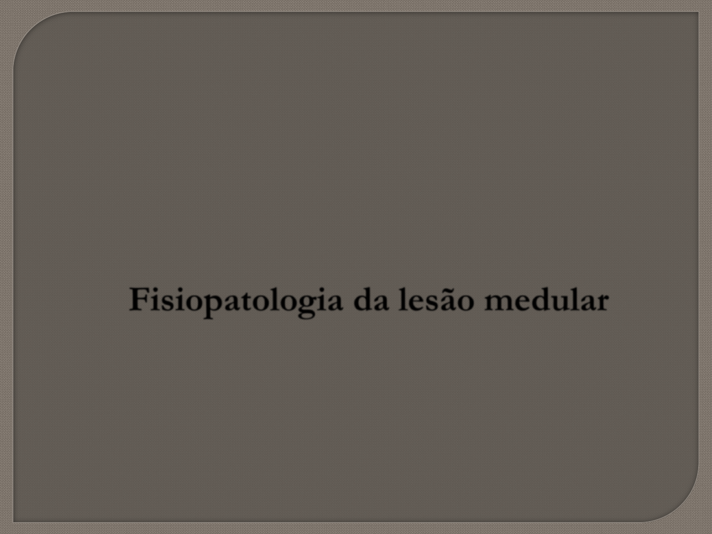 Fisiopatologia da lesão medular Débora Wanderley Medula espinhal •31 pares de nervos espinhais •Bulbo até L2 •Cone •Filum terminal •Intumescência cervical •Intumescência lombar Plexo braquial Plexo lombossacral Território cutâneo inervado por fibras de uma única raiz dorsal Relação entre medula espinhal, raízes nervosas e grupos musculares C1, C2 C3 C4 C5 C6 C7 C8, T1 Músculos faciais e do pescoço Diafragma e trapézio Rombóides Deltóide e bíceps Extensores do punho Tríceps Mãos e dedos T2-T8 T6-T12 Músculos do tórax Abdominais L1-S1 Músculos da perna S1-S2 S3-S5 Músculos do quadril e pés Intestino, bexiga e genitais Nervo coccígeo Medula espinhal Fascículos grácil e cuneiforme • Propriocepção e vibração Trato espinotalâmico lateral • Dor e temperatura Trato espinotalâmico anterior • Tato grosseiro e pressão Trato córtico-espinhal lateral e anterior • Função motora Trato espinocerebelar ventral e dorsal • Propriocepção e reflexos Cone medular e cauda equina • Função motora dos MMII, intestino e bexiga • Função sexual • Sensibilidade nos segmentos sacrais e coccígeos Traumatismo raquimedular - TRM Choque espinhal “ É um fenômeno de cessação de toda a função do sistema nervoso, abaixo do nível da lesão da medula espinhal.” Stokes, 2000 TRM •Relação homem-mulher • 4:1 • 15 a 40 anos •Tipos • Lesão completa • Lesão incompleta •Etiologia: Queda de altura Acidentes automobilísticos Mergulho em água rasa Arma de fogo Nervos e vasos TRM • Áreas mais acometidas • Cervical inferior (C5-C7) - 2/3 das lesões (mergulho e chicote) • Mais graves • Sensibilidade e movimentos dos MMSS • Torácica média (T4-T7) - 10% • Sensibilidade e movimentos do tórax e abdome • Tóraco-lombar (T10-L2) - 7% • Sensibilidade e movimentos do abdome e dos MMII Classificação do TRM •Tetraplegia • 4 membros, tronco e músculos respiratórios • Lesão cervical, acima de T1 •Paraplegia • Todo o tronco ou parte dele e ambos os membros inferiores • Lesão torácica, lombar ou cauda equina • Fase aguda (choque medular) • 4-6 semanas • Paralisia flácida (hipotonia) • Diminuição ou abolição dos reflexos e da sensibilidade • Retenção urinária e fecal • Queda de PA • Bradicardia/comprometimento respiratório • Dor • Fase pós-choque medular • Pode haver recuperação dos movimentos e da sensibilidade • Hipertonia (espasticidade) • Atrofia • Espasmos • Aumento dos reflexos (patológicos) • Urgência/incontinência urinária/fecal Quadro clínico Complicações •Contraturas •Deformidades •Atrofias •Escaras de decúbito •Osteoporose •Espasticidade •Dor •TVP Síndromes medulares Lesão medular anterior Perda motora completa inferiormente à lesão Perda da sensibilidade dolorosa, térmica, tato e pressão Trato espinotalâmico anterior e lateral * Vibração e propriocepção inalteradas Lesão medular central •Pacientes idosos com espondilose cervical •MMSS afetados mais profundamente que MMII Atrofia flácida dos MMSS Padrão espástico em MMII Síndromes medulares Lesão com hemisecção medular – Síndrome de Brown-Séquard •Causada por ferimentos de arma branca •Perda motora e proprioceptiva homolateral à lesão •Perda da sensibilidade térmica e dolorosa contralateral à lesão Síndromes medulares Lesão do cone medular •Lesão das raízes nervosas sacrais (nível ósseo de T12-L1) •Paralisia flácida nos MMII •Disfunções do intestino, bexiga e função sexual •Sensibilidade alterada nos segmentos sacrais e coccígeos Síndromes medulares Lesão da cauda equina •A lesão de nervos espinhais da cauda equina (L1-L2) •Quadro clínico depende da raiz atingida •Paresia de MMII •Arreflexia •Distúrbios da sensibilidade •Incontinência fecal e vesical Síndromes medulares Lesão da medula posterior •Função motora, dor e tato preservadas •Propriocepção alterada Síndromes medulares Nível mais caudal da medula espinhal com função normal, motora e sensorial, em ambos os lados (direito e esquerdo). American Spinal Injury Association (ASIA) Nível da lesão Nível da lesão É feita para dor e tato leve • Dor (alfinete) • Tato leve (toque leve ou algodão) Classificação - 2 = normal - 1 = prejudicada, não consegue diferenciar entre leve e forte ou o local - 0 = sem sensibilidade - NT = não testável Avaliação da força muscular Chamada pela ASIA de ASIA impairment scale (AIS), avalia o grau de deficiência do paciente com TRM Relação entre medula espinhal, raízes nervosas e grupos musculares C1, C2 C3 C4 C5 C6 C7 C8, T1 Músculos faciais e do pescoço Diafragma e trapézio Rombóides Deltóide e bíceps Extensores do punho Tríceps Mãos e dedos T2-T8 T6-T12 Músculos do tórax Abdominais L1-S1 Músculos da perna S1-S2 S3-S5 Músculos do quadril e pés Intestino, bexiga e genitais Nervo coccígeo Lesão C1-C2 •Músculos da face e pescoço •Ventilação mecânica •Dependente Avaliação do nível da lesão Lesão C3 •Diafragma • Ventilação mecânica • Controle da boca e queixo •Prognóstico: cadeira de rodas elétrica com controle no queixo, testa ou parte posterior da cabeça •Adaptações para comer (canudos, cabos, etc), para computador (boca) Avaliação do nível da lesão Lesão C4 •Romboides e trapézio • Controle de cabeça • Dependente • Elevação dos ombros e escápulas • Não usa MMSS • Ventilação espontânea, mas tem problemas respiratórios Não tem intercostais Avaliação do nível da lesão Lesão C5 •Manguito rotador (bíceps, braquial, braquiorradial, deltoide, infraespinhoso, romboides e supinador) •Flexão e supinação do cotovelo; Flexão e abdução do ombro •Precisa de órtese para as mãos – leva mão à boca •Move a cadeira com controle •Contratura em flexão de cotovelo Avaliação do nível da lesão Lesão C6 – extensor de 