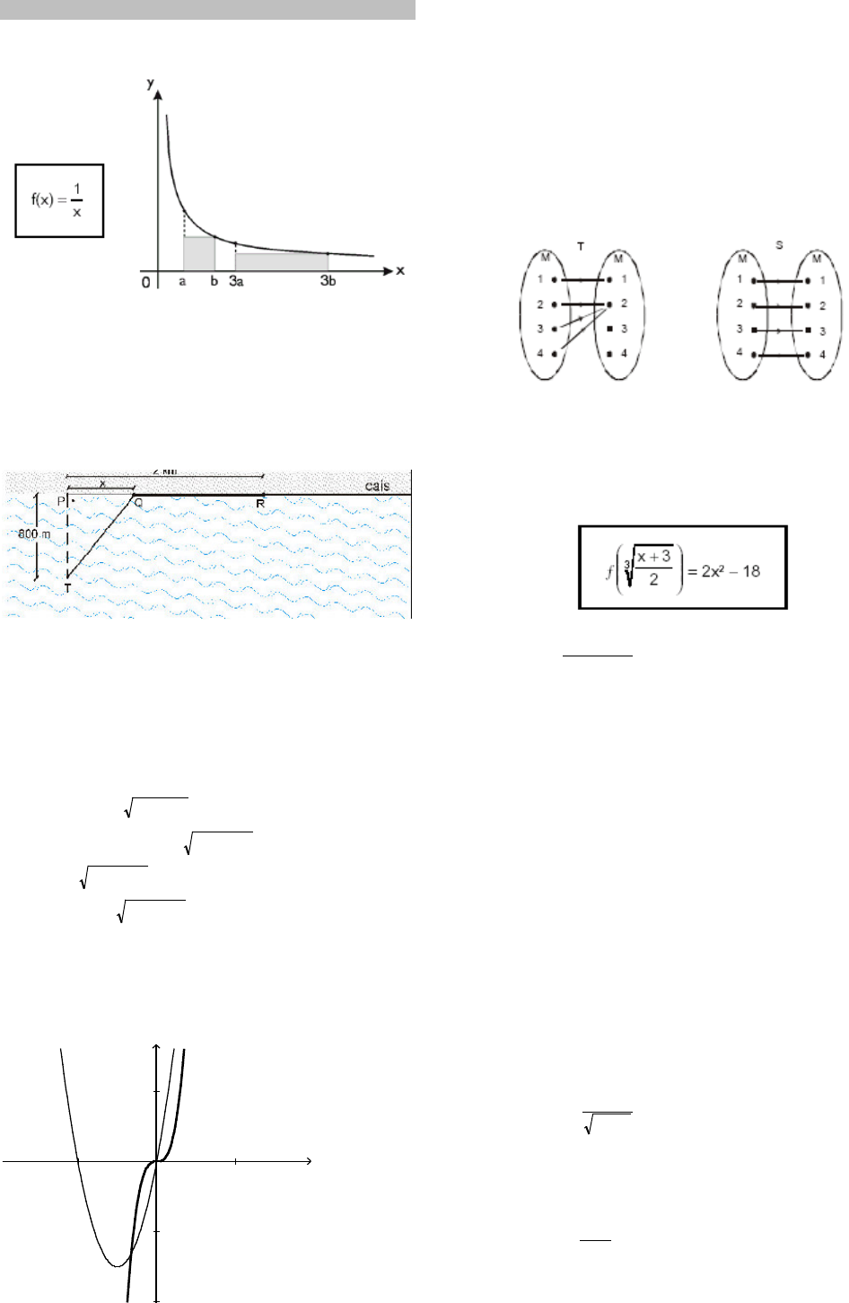 Funções (Outras) 1. (UERJ 2001) Considere a função f, definida para todo x real positivo, e seu respectivo gráfico. Se a e b são dois números positivos (a < b), a área do retângulo de vértices (a,0), (b,0) e (b, f(b)) é igual a 0,2. Calcule a área do retângulo de vértices (3a, 0), (3b, 0) e (3b, f(3b)). 2. (UFF 03) Na figura, o ponto R representa a localização, à beira-mar, de uma usina que capta e trata o esgoto de certa região. Com o objetivo de lançar o esgoto tratado no ponto T, uma tubulação RQT deverá ser construída. O ponto T situa-se a 800 m do cais, em frente ao ponto P, que dista 2 km de R, conforme ilustração acima. O custo da tubulação usada no trajeto retilíneo RQ, subterrâneo ao longo do cais, é de 100 reais por quilômetro, e o custo da tubulação usada na continuação QT, também retilínea, porém submarina, é de 180 reais por quilômetro. Sendo x a medida de PQ, a função f que expressa o custo, em real, da tubulação RQT em termos de x, em quilômetro, é dada por: a) f x x xc h = − + +2 800 2 b) f x x xc h = − + +200 100 180 0 64 2, c) f x x x xc h = + + +0 64 2 2, d) f x xc h = + +200 0 64 2, e) f x x xc h = − +200 100 0 8 2, 3. (UENF 2003) No gráfico abaixo, estão representadas as funções reais f(x) = x3 e g(x) = ax2 + bx +c. sabendo que f(3) = g(3), determine o conjunto-solução da inequação f(x) ≥ g(x). − 6 6 − 1 2 − 6 6 x y 4. (UFF 01) Uma fábrica utiliza dois tanques para armazenar combustível. Os níveis de combustível, H1 e H2, em cada tanque, são dados pelas expressões: H t t t1 3150 190 30c h = − + eH t t t2 350 35 30c h = + + , sendo t o tempo em hora. O nível de combustível de um tanque é igual ao do outro no instante inicial (t = 0) e, também, no instante: a) t = 0,5 h d) t = 1,0 h b) t = 1,5 h e) t = 2,0 h c) t = 2,5 h 5. (UFF 02) Sejam T: M → M e S: M → M as funções representadas a seguir. Com respeito à função composta ToS, tem-se: (A) ToS(3) = S(3) (B) ToS(3) = T(2) (C) ToS(4) = ToS(1) (D) ToS(1) = S(3) (E) ToS(2) = T(1) 6. (UERJ 02) Considere a função f: a) Determine suas raízes b) Calcule f f1 1 2 c h c h+ − 7. (UFRJ-02) Dada a função f : R →→→→ R definida por: 2x 4x, se x 1 f(x) 2x-5, se x>1 − ≤ = determine os zeros de f. 8. (UFRJ-99) Durante o ano de 1997 uma empresa teve seu lucro diário L dado pela função L( x ) = 50 ( | x - 100 | + | x - 200 | ) onde x = 1,2,...,365 corresponde a cada dia do ano e L é dado em reais. Determine em que dias (x) do ano o lucro foi de R$10.000,00. 9. (UERJ 01) O volume de água em um tanque varia com o tempo de acordo com a seguinte equação: V= 10 - | 4 - 2t| - |2t – 6| , t ∈∈∈∈ R+ Nela, V é o volume medido em m3 após t horas, contadas a partir de 8h de uma manhã. Determine os horários inicial e final dessa manhã em que o volume permanece constante. 10. (UFF 00) Dada a função real de variável real f tal que f x x x 2 1 2 12 + = − c h , x ≠ 1 e x ≠ – 1, determine: a) a expressão de f(x); b) o domínio da função f. 11. (UFF 01) Dada a função real de variável real f, definida por f x x x c h = + − 1 1 , x ≠ 1. a) determine f f x�c hc h b) escreva uma expressão para f x−1c h .