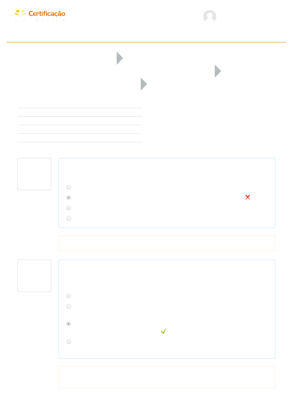 28/01/2019 Atividade 02 https://www.certificacaotecnica.com.br/mod/quiz/review.php?attempt=466952 1/2 (https://www.certificacaotecnica.com.br) Lucas Souza de Freitas Introdução ao Word - Questão 1 Incorreto Atingiu 0,0 de 2,0 Questão 2 Correto Atingiu 2,0 de 2,0 / / / Iniciado em segunda, 28 Jan 2019, 16:21 Estado Finalizada Concluída em segunda, 28 Jan 2019, 16:29 Tempo empregado 7 minutos 41 segundos Avaliar 8,0 de um máximo de 10,0(80%) É possível adicionar informações em um documento aberto com senha? Escolha uma: a. Não, mas se clicar em recuperar senha as informações poderão ser alteradas. b. Sim, mas somente se a senha for reconhecida e registrada na internet. c. Sim, após aberto o programa funciona normalmente. d. Não, após criada a senha é impossível fazer alteração em um documento. A resposta correta é: Sim, após aberto o programa funciona normalmente.. Como vimos na aula é possível criar um Atalho para área de trabalho. Como devemos fazer isto? Escolha uma: a. Basta clicar no programa, e em seguida pressionar a tecla Enter no teclado. b. Você deve abrir o programa de Criação de Atalhos, que está na barra de tarefas do Windows. c. Basta selecionar o programa, clicar com o botão direito do mouse e em seguida Enviar para o local desejado. d. Você deve clicar com o botão direito do mouse onde deseja salvar o atalho e em seguida clicar no botão de Iniciar do Windows. A resposta correta é: Basta selecionar o programa, clicar com o botão direito do mouse e em seguida Enviar para o local desejado.. (https://www.certificacaotecnica.com.br/) Introdução ao Word - (https://www.certificacaotecnica.com.br/course/view.php?id=334) Aula 2 - Conhecendo as ferramentas do Word 2010 Atividade 02 (https://www.certificacaotecnica.com.br/mod/quiz/view.php?id=23244) 28/01/2019 Atividade 02 https://www.certificacaotecnica.com.br/mod/quiz/review.php?attempt=466952 2/2 Questão 3 Correto Atingiu 2,0 de 2,0 Questão 4 Correto Atingiu 2,0 de 2,0 Questão 5 Correto Atingiu 2,0 de 2,0 Como se faz para aumentar a margem da régua? Escolha uma: a. Basta dar um Duplo clique na barra de rolagem lateral. b. Basta clicar na margem, e em seguida arrastar até o local desejado. c. Basta dar um Clique no centro da tela. d. Basta digitar um valor e pressionar a tecla Enter, mesmo sem clicar na régua. A resposta correta é: Basta clicar na margem, e em seguida arrastar até o local desejado.. Como se faz para remover senha do documento? Escolha uma: a. Basta clicar em Criptografar Senha e em seguida selecionar o botão de Remover Senha. b. Basta clicar em Criptografar com Senha, em seguida selecionar a senha e por fim pressionar a tecla Delete. c. Basta clicar em Criptografar Senha, pressionar a tecla Enter, e em seguida digitar a palavra Remover. d. Basta clicar em Criptografar Senha, em seguida clicar em Remover Senha e pressionar a tecla Enter. A resposta correta é: Basta clicar em Criptografar com Senha, em seguida selecionar a senha e por fim pressionar a tecla Delete.. Qual o caminho correto para salvar um documento com Senha? Escolha uma: a. Arquivo > Informações > Senha > Recuperar senha b. Informações > Proteger Documento > Inserir Senha > Criptografar Documento c. Arquivo > Informações > Proteger Documento > Criptografar com Senha d. Informações > Recentes > Criptografar com Senha > Senha A resposta correta é: Arquivo > Informações > Proteger Documento > Criptografar com Senha.