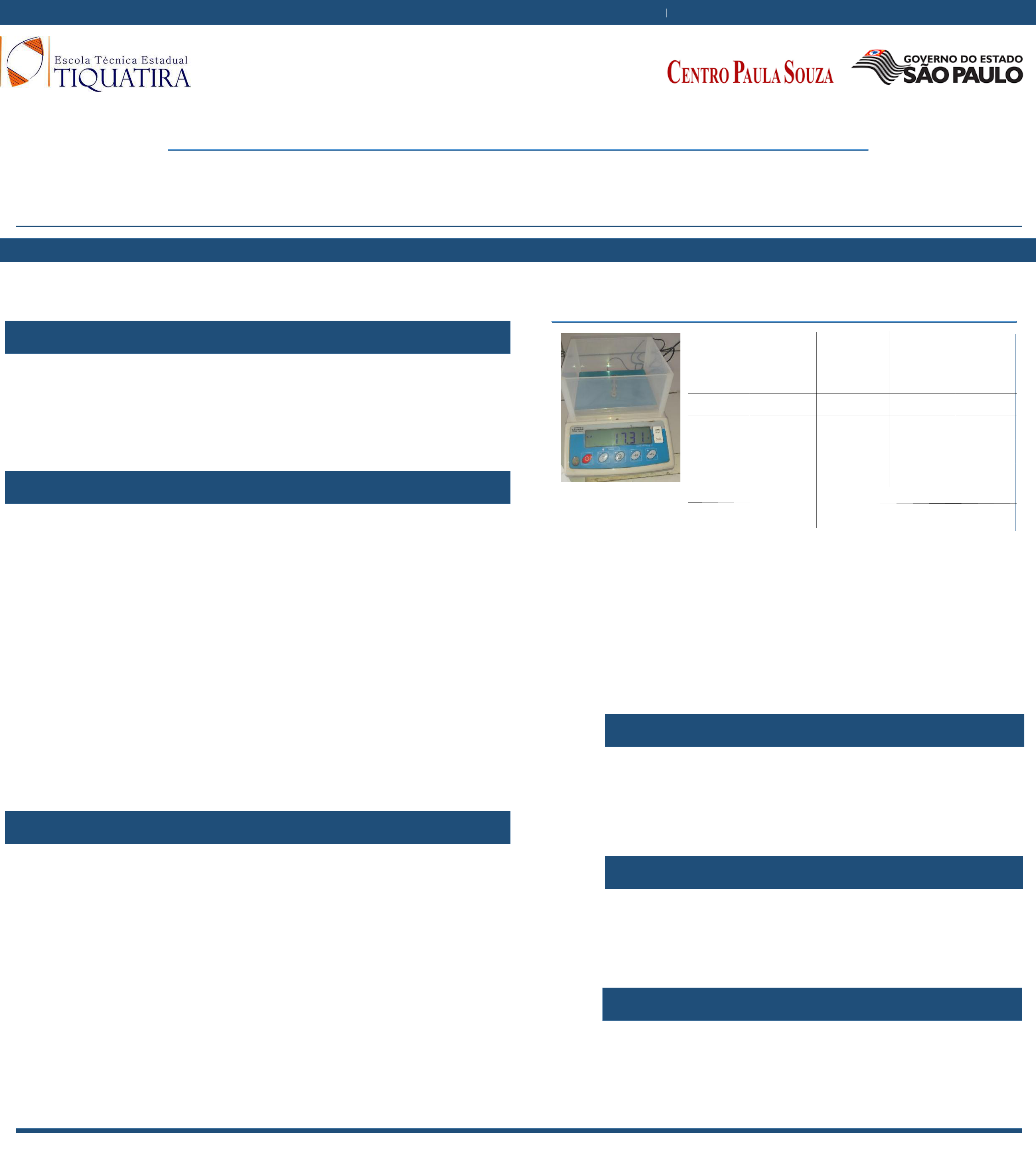 QUÍMICA-TIQUATIRA-2019 DENSIDADE Autores: Pedro Tipolt Lopes RESUMO INTRODUÇÃO METODOLOGIA RESULTADOS CONSIDERAÇÕES FINAIS AGRADECIMENTOS REFÊRÊNCIAS BIBLIORÁFICAS A Densidade é a concentração de matéria num determina do volume. Para medir essa propriedade física é preciso considerar a interação que há entre a massa de um material e o volume que ele ocupa. Dois quilos de esponja pesam exatamente o mesmo que dois quilos de chumbo, ou seja, ambos pesam dois quilos. O que inconscientemente nos faz dizer que os dois quilos de chumbo pesam mais que os dois quilos de esponja é o fato de sabermos que o chumbo é mais pesado do que uma esponja. A diferença está no volume de esponja e no volume de chumbo que temos de ter para obter o mesmo peso. É claro que terei um volume de esponja muito maior do que o volume de chumbo, afinal, o chumbo é mais concentrado, ou seja, a sua densidade é maior. A densidade é uma propriedade física que caracteriza uma substância ou elemento, ela é intensiva e não varia com o aumento da quantidade de matéria. A densidade de sólidos e líquidos, segundo o SI ( Sistema Internacional de Unidades ) é expressa em quilograma por metro cúbico – kg/m3. porém, é mais comumente expressa em unidade de gramas por centímetros cúbicos – g/cm3, ou em gramas por litro - g/ L. Uma substância pura, é caracterizada por uma densidade especifica, que a diferencia das outras substâncias e que pode ser determinada por meio da seguinte fórmula: m/V M= massa do experimento, e V= é o espaço que a matéria está ocupando. Materiais: Água; Balança analítica; Proveta (100 mL); 4 amostras de sólidos (não identificados); Termômetro. Com as amostras em mãos, leve-as para pesar uma a uma na balança analítica. Após pesar e anotar a massa de todas as amostras, adicione um determinado volume de água em uma proveta (no experimento foi adotado o volume de 60 mL); Mergulhe a amostra, já com o peso registrado, na proveta com água e observe a variação do volume. A variação de volume, será igual ao volume da amostra, de acordo com o princípio da determinação da densidade de sólidos irregulares, criado por Arquimedes. Registre a variação de volume da proveta e partir daí se tem todos os dados necessários para o cálculo da densidade; O termômetro foi utilizado para verificar a temperatura do ambiente em que o experimento estava sendo executado. A densidade dos sólidos foi determinada através do princípio de Arquimedes, já explanado neste relatório. Os resultados foram obtidos por meio da razão das massas das amostras pela a variação de volume . A densidade obtida experimentalmente é diferente do valor real, previamente tabelado, por isso houve uma variação de valores. Está variação pode ocorrer por diversas hipóteses, as mais comuns são: erro na pesagem, erro na leitura do volume ao emergir o sólido na proveta, criação de bolhas na proveta, fazendo com que o volume e aumente e haja erro na leitura, entre outros fatores Foi possível, após conhecer a densidade de algumas amostras, determinas a sua natureza, porém outras se tratavam de ligas metálicas ou junção de metais e por isso não foi possível identificar a sua composição. 6 Em todos os experimento de Densidade, com o picnômetro, com o densímetro e pelo princípio de Arquimedes, foram obtidos erros, entretanto a determinação da densidade com o picnômetro mostrou mais precisão que os demais métodos. Os experimentos poderiam ter valores mais confiáveis, caso a balança analítica tivesse mais casas decimais, o u se os sólidos fossem realmente puros, porém mesmo com os empecilhos, foi possível relacionar os conhecimentos teóricos com os práticos e absorver a essência do experimento. ATKINS, P.W.; JONES, Loretta. Princípios de química: questionando a vida moderna e o meio ambiente. 3.ed. Porto Alegre: Bookman, 2006. 965 p; BROWN, Theodore; LEMAY, H. Eugene; BURSTEN, Bruce E. Química: a ciência central. 9 ed. Prentice-Hall, 2005 Pesando Sólido Amostra Peso (g) Volume Inicial (ml) Volume Total (ml) Densidade 1 17,31 60 65 3,462 2 57,56 60 68 7,195 3 9,17 60 64 2,29 4 50,25 60 67 7,179 Temperatura (C°) Pressão (mmHg) 24 760 A densidade obtida experimentalmente é diferente do valor real, previamente tabelado, por isso houve uma variação de valores. Está variação pode ocorrer por diversas hipóteses, as mais comuns são: erro na pesagem, erro na leitura do volume ao emergir o sólido na proveta, criação de bolhas na proveta, fazendo com que o volume e aumente e haja erro na leitura, entre outros fatores. Foi possível, após conhecer a densidade de algumas amostras, determinas a sua natureza, porém outras se tratavam de ligas metálicas ou junção de metais e por isso não foi possível identificar a sua composição. Sou imensamente grato pelo apoio que foi dado a mim durante ao execução desses experimento, e também a todos os colaboradores que auxiliaram tanto no planejamento do trabalho como na execução do mesmo.