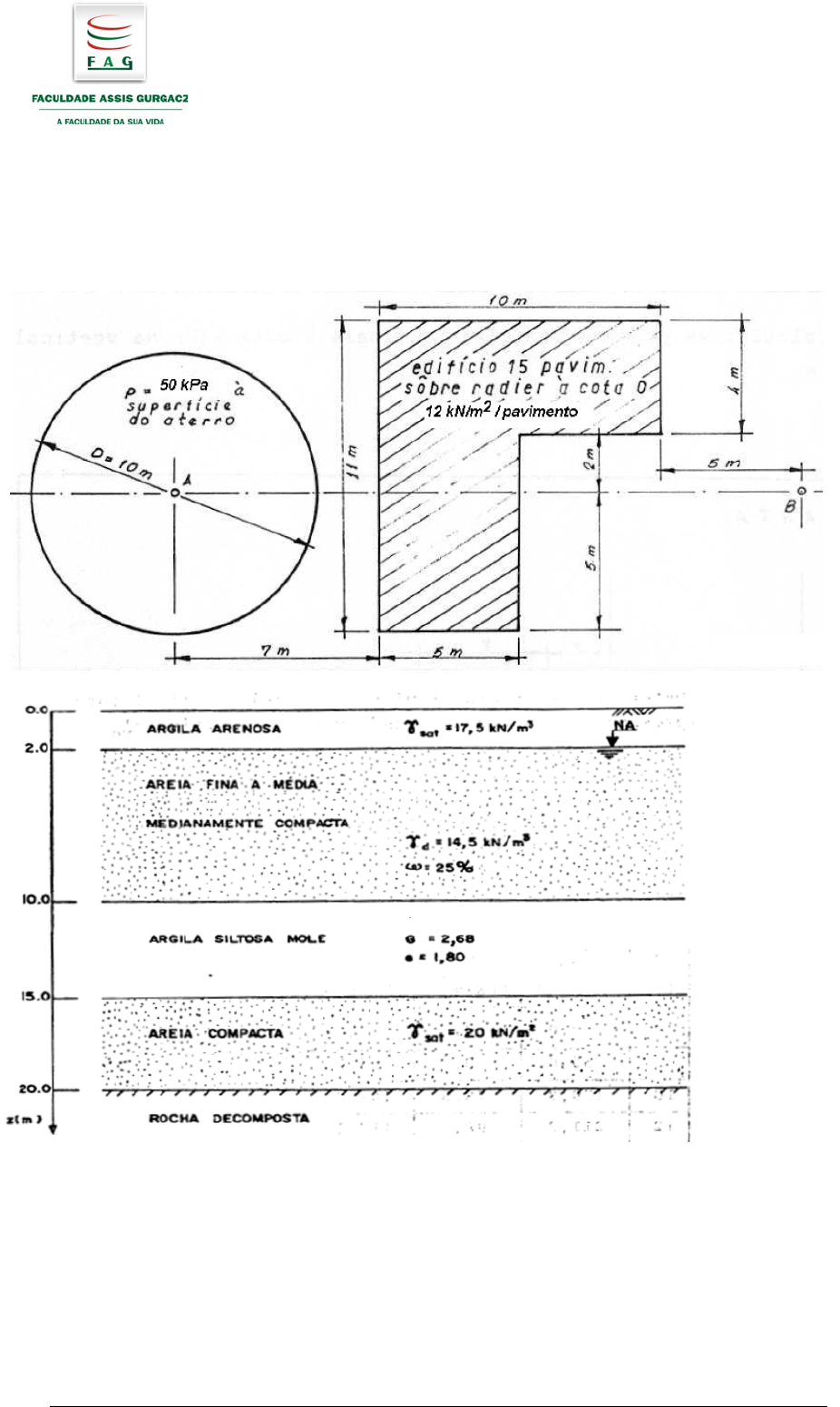FACULDADE ASSIS GURGACZ Avenida das Torres, 500 - Loteamento FAG - Cascavel/PR MECÂNICA DOS SOLOS ATIVIDADE 1 – 2 BIMESTRE Prof. Me. Maycon André de Almeida 1 1) Calcular as tensões efetivas finais verticais nos pontos A e B do solo abaixo, considerando a aplicação das cargas das estruturas abaixo, para a superfície do solo (cota 0m) e para o meio da cama de argila siltosa mole (-12,5m), considerando que ocorre saturação da argila arenosa por capilaridade. FACULDADE ASSIS GURGACZ Avenida das Torres, 500 - Loteamento FAG - Cascavel/PR MECÂNICA DOS SOLOS ATIVIDADE 1 – 2 BIMESTRE Prof. Me. Maycon André de Almeida 2 2) Qual o valor máximo da carga distribuída “p” (kPa) a ser aplicada pelo tanque, sabendo-se que a laje superior da galeria de águas pluviais suporta uma tensão efetiva vertical máxima de 400 kPa no ponto A. (Considerar γg = γs e γsub = γsat – γw). 3) Para a situação detalhada em 3D e planta abaixo, determinar as tensões finais atuantes em uma vertical passando pelo centro do poste e a 6m abaixo da superfície do terreno. Considerar que o poste transmite ao terreno uma força de 100 kN e que será realizada a escavação para a execução de uma piscina, conforme desenho, e posterior preenchimento de água até a cota – 0,20 metros. Desconsiderar o peso próprio da estrutural de fibra de vidro da mesma. FACULDADE ASSIS GURGACZ Avenida das Torres, 500 - Loteamento FAG - Cascavel/PR MECÂNICA DOS SOLOS ATIVIDADE 1 – 2 BIMESTRE Prof. Me. Maycon André de Almeida 3 4) Um terreno, cujo perfil do subsolo é apresentado abaixo (1 fase), serviu de área de empréstimo à construção de uma pequena barragem, sendo escavado até a cota 575; simultaneamente, devido à sua localização próxima à bacia de inundação, seu nível d’água subiu 5 m (2 fase). Após alguns anos, devendo o local ser aproveitado para uma construção (apresentada abaixo), foi rebaixado o nível d’água à cota 573 e feito simultaneamente sobre a superfície existente um aterro de 5m de altura com os seguintes dados: γd = 16 kN/m³ e w = 25%. (3 fase). Determinar as tensões totais e efetivas e a pressão neutra nas 3 fases para as cotas 572m, 565m e 559m. γs = 27 kN/m³ FACULDADE ASSIS GURGACZ Avenida das Torres, 500 - Loteamento FAG - Cascavel/PR MECÂNICA DOS SOLOS ATIVIDADE 1 – 2 BIMESTRE Prof. Me. Maycon André de Almeida 4 5) No perfil de terreno indicado abaixo irá se proceder a construção de um edifício de 20 pavimentos apoiado à cota –1 m, bem como de uma torre. Ao mesmo realizar-se-á uma escavação retangular para a execução de um canal. Um fabrica também será construída sobre a cota 0,00 m. Calcular as tensões totais e efetivas finais no meio da camada de argila siltosa mole, na vertical que passa abaixo da torre. CONSIDERAR A MASSA ESPECIFICA NATURAL DAS CAMADAS COMO MASSA ESP. SATURADA. UTILIZAR O MESMO VALOR PARA NAT E SAT. FACULDADE ASSIS GURGACZ Avenida das Torres, 500 - Loteamento FAG - Cascavel/PR MECÂNICA DOS SOLOS ATIVIDADE 1 – 2 BIMESTRE Prof. Me. Maycon André de Almeida 5 6) A Figura abaixo ilustra um corte em um maciço terroso num local onde se pretende construir uma auto-estrada. Na zona em causa ocorre a transição entre uma parte da plataforma assente em aterro e outra em obra de arte. Como mostra a figura, as fundações da obra de arte serão por estacas cuja ponta ficará alojada no estrato D. O Quadro abaixo inclui características físicas e de identificação dos solos constituintes dos quatro estratos da figura (não necessariamente indicados pela mesma ordem). Admita que todos os solos se encontram saturados. wL = Limite de Liquidez / wP = limite de plasticidade a) Descreva em linhas gerais características geotécnicas marcantes das quatro camadas de solo apresentadas, sob ponto de vista da Engenharia Civil. b) Estabeleça a correspondência entre os solos 1 a 4 do Quadro e os estratos A a D da Figura. Para responder a esta questão considere a seguinte informação complementar: o solo em questão é comprovadamente residual. c) Que camada(s) pode(m) ocasionar mais dificuldades na altura da construção e nos primeiros anos de exploração da obra? Caracterize essas dificuldades. Como podem ser evitadas? FACULDADE ASSIS GURGACZ Avenida das Torres, 500 - Loteamento FAG - Cascavel/PR MECÂNICA DOS SOLOS ATIVIDADE 1 – 2 BIMESTRE Prof. Me. Maycon André de Almeida 6 d) Falando agora do aterro propriamente dito e considerando que o mesmo seja executado para servir como subleito de uma rodovia, que características geotécnicas são almejadas para ele e como podem ser obtidas e controladas durante sua execução (cite ao menos 3)? 7) Ainda de acordo com a tabela apresentada no exercício acima, classifique o solo 3 e 4 de acordo com o sistema unificado (SUCS) e pela plasticidade.