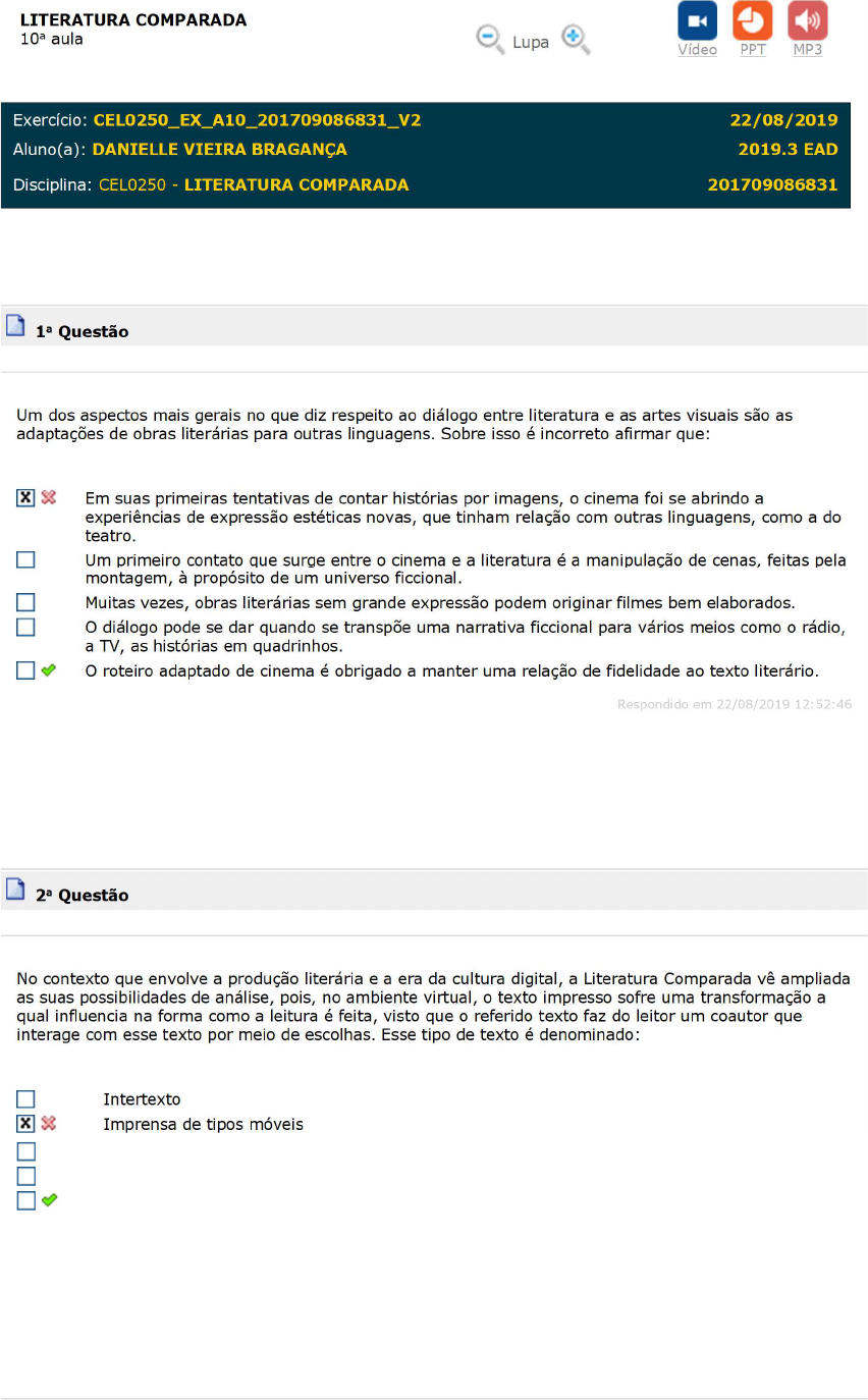 LITERATURA COMPARADA 10a aula Lupa Vídeo PPT MP3 Exercício: CEL0250_EX_A10_201709086831_V2 22/08/2019 Aluno(a): DANIELLE VIEIRA BRAGANÇA 2019.3 EAD Disciplina: CEL0250 - LITERATURA COMPARADA 201709086831 1a Questão Um dos aspectos mais gerais no que diz respeito ao diálogo entre literatura e as artes visuais são as adaptações de obras literárias para outras linguagens. Sobre isso é incorreto afirmar que: Em suas primeiras tentativas de contar histórias por imagens, o cinema foi se abrindo a experiências de expressão estéticas novas, que tinham relação com outras linguagens, como a do teatro. Um primeiro contato que surge entre o cinema e a literatura é a manipulação de cenas, feitas pela montagem, à propósito de um universo ficcional. Muitas vezes, obras literárias sem grande expressão podem originar filmes bem elaborados. O diálogo pode se dar quando se transpõe uma narrativa ficcional para vários meios como o rádio, a TV, as histórias em quadrinhos. O roteiro adaptado de cinema é obrigado a manter uma relação de fidelidade ao texto literário. Respondido em 22/08/2019 12:52:46 2a Questão No contexto que envolve a produção literária e a era da cultura digital, a Literatura Comparada vê ampliada as suas possibilidades de análise, pois, no ambiente virtual, o texto impresso sofre uma transformação a qual influencia na forma como a leitura é feita, visto que o referido texto faz do leitor um coautor que interage com esse texto por meio de escolhas. Esse tipo de texto é denominado: Intertexto Imprensa de tipos móveis Supertexto Digitalização Hipertexto Respondido em 22/08/2019 12:52:50 3a Questão A presença da tela dos computadores e da internet como realidades no mundo atual faz surgir o conceito de hipertexto, que pode ser conceituado como: Uma forma de escrita seqüencial ¿ um texto que se espalha em ramificações e permite ao leitor escolher caminhos, preferencialmente lido em uma tela interativa. Nenhuma das opções acima. Uma forma de escrita não seqüencial ¿ um texto que se espalha em ramificações, mesmo que não tenha como permitir ao leitor escolher caminhos, Uma forma de escrita não seqüencial ¿ um texto que se espalha em ramificações e permite ao leitor escolher caminhos, preferencialmente lido em uma tela interativa. Uma forma de escrita seqüencial ¿ um texto que não se espalha em ramificações, mas permite ao leitor escolher caminhos, preferencialmente lido em uma tela interativa. Respondido em 22/08/2019 12:52:54 Gabarito Coment. 4a Questão Assinale a alternativa correta sobre a origem do termo hipertexto: A ideia de hipertexto surgiu no final dos anos 90 em virtude do advento e popularização da internet. A ideia do hipertexto digital surgiu nos anos 60, nos Estados Unidos. Ele seria possível através da exposição de textos em meios eletrônicos que possibilitariam maior interação entre o leitor e o conhecimento. O hipertexto surgiu no inicio de 2010 ,em virtude do advento e popularização da internet juntamente com a ciência e tecnologia Não é possível precisar a origem do termo hipertexto, elemento amplamente difundido em livros, sobretudo em notas de rodapé e verbetes de enciclopédias e dicionários. O hipertexto foi criado na primeira década dos anos 2000 por um grupo de cientistas da informação que vislumbrou no conceito a possibilidade de propagação de conhecimento e informação de maneira dinâmica e interativa. Respondido em 22/08/2019 12:52:57 Explicação: RESPOSTA "A" A noção de hipertexto digital surgiu há cinquenta anos, na década de 60. Seu inventor foi Ted Nelson, filósofo e sociólogo americano que foi pioneiro da Tecnologia da Informação. 5a Questão Dentre as dificuldades encontradas em todo processo de adaptação de uma obra literária para o cinema, podemos destacar: O fato de que o tempo, muitas vezes, é curto para dar conta de toda a trama de um romance, aliado ao fato de que as imagens estão, no cinema, aliadas ao texto, para comunicar as mensagens. O fato de que o tempo precisa ser muito bem administrado para que seja possível narrar toda a trama de um romance. O fato de que no cinema deve-se ter em conta a importância das imagens como principais transmissoras da mensagem, o que coloca o texto em segundo plano. Nenhuma das opções acima. O fato de que no cinema há muito pouco tempo para o desenvolvimento da trama de um romance, o que leva os diretores a sempre produzirem obras incompletas. Respondido em 22/08/2019 12:53:02 6a Questão Sobre o diálogo entre literatura e cinema, é incorreto afirmar que: Um filme pode ser avaliado pela crítica positivamente, mesmo sem manter a fidelidade ao texto adaptado. Se o filme capta a essência da mensagem contida no texto literário, isso já pode ser considerado como um dado positivo. Um filme que é uma adaptação de uma obra literária, à luz do conceito de intertextualidade, é outro texto. O cinema deve ser subserviente à literatura. O ideal de um roteiro adaptado para o cinema é que não se faça uma transposição para as telas da narrativa literária, com vistas a se realizar plenamente em sua realidade de obra cinematográfica. Respondido em 22/08/2019 12:53:05 Gabarito Coment. 7a Questão A literatura gerada por computador ou ciberliteratura diferencia-se da literatura tradicional, impressa na forma de livros, principalmente por: utilizar uma linguagem que ficou conhecida como internetês. utilizar signos sonoros e visuais. não possuir prefácio. apresentar um resumo que estimula o leitor a não se dedicar à leitura integral da obra. impedir o recorte de passagens que mais interessem ao leitor. Respondido em 22/08/2019 12:53:08 8a Questão Entre as alternativas abaixo, marque a que corresponde ao principal impedimento da fidelidade do filme em relação ao texto literário: O espaço O tempo O foco narrativo O enredo Os personagens