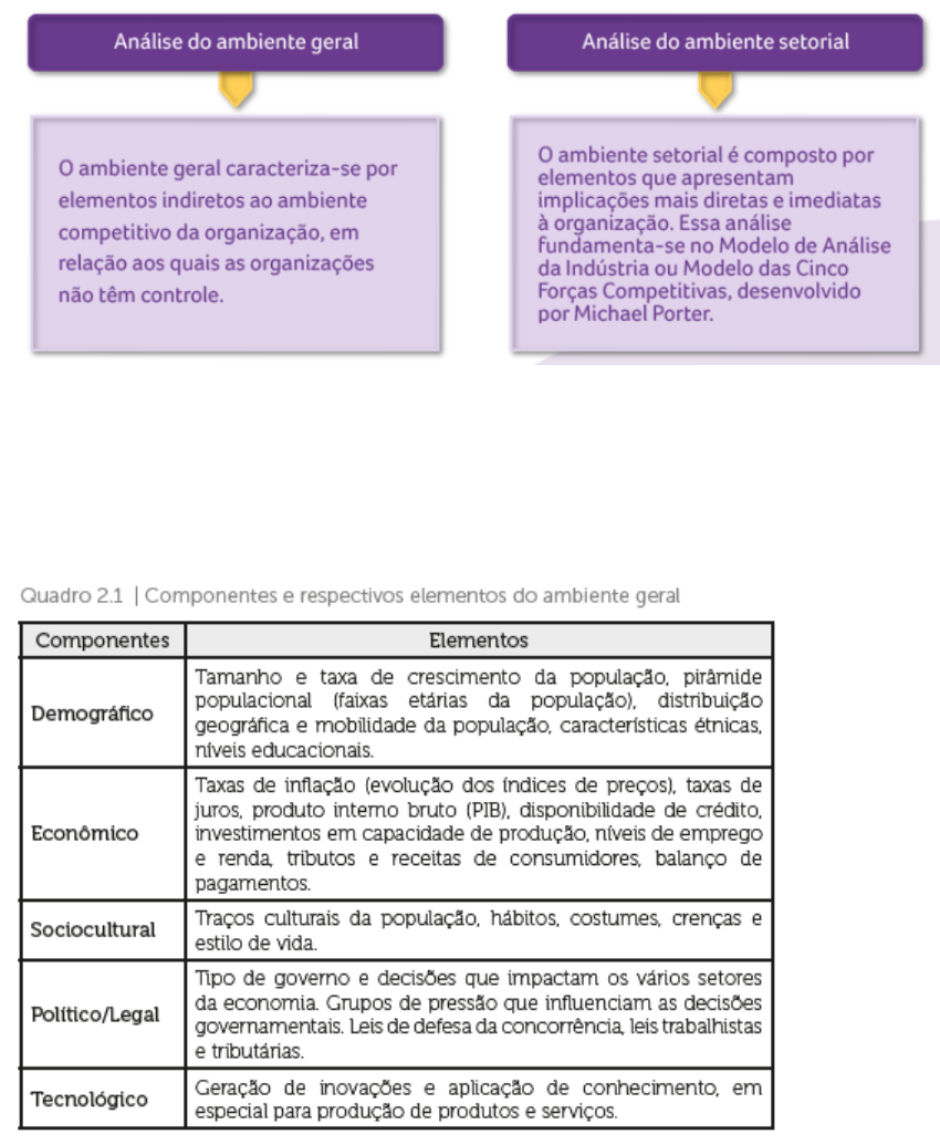 O primeiro, ambiente geral, caracteriza-se por elementos indiretos ao ambiente competitivo da organização, sobre os quais as organizações não têm controle. O ambiente setorial, em contrapartida, é composto por elementos que apresentam implicações mais diretas à organização.