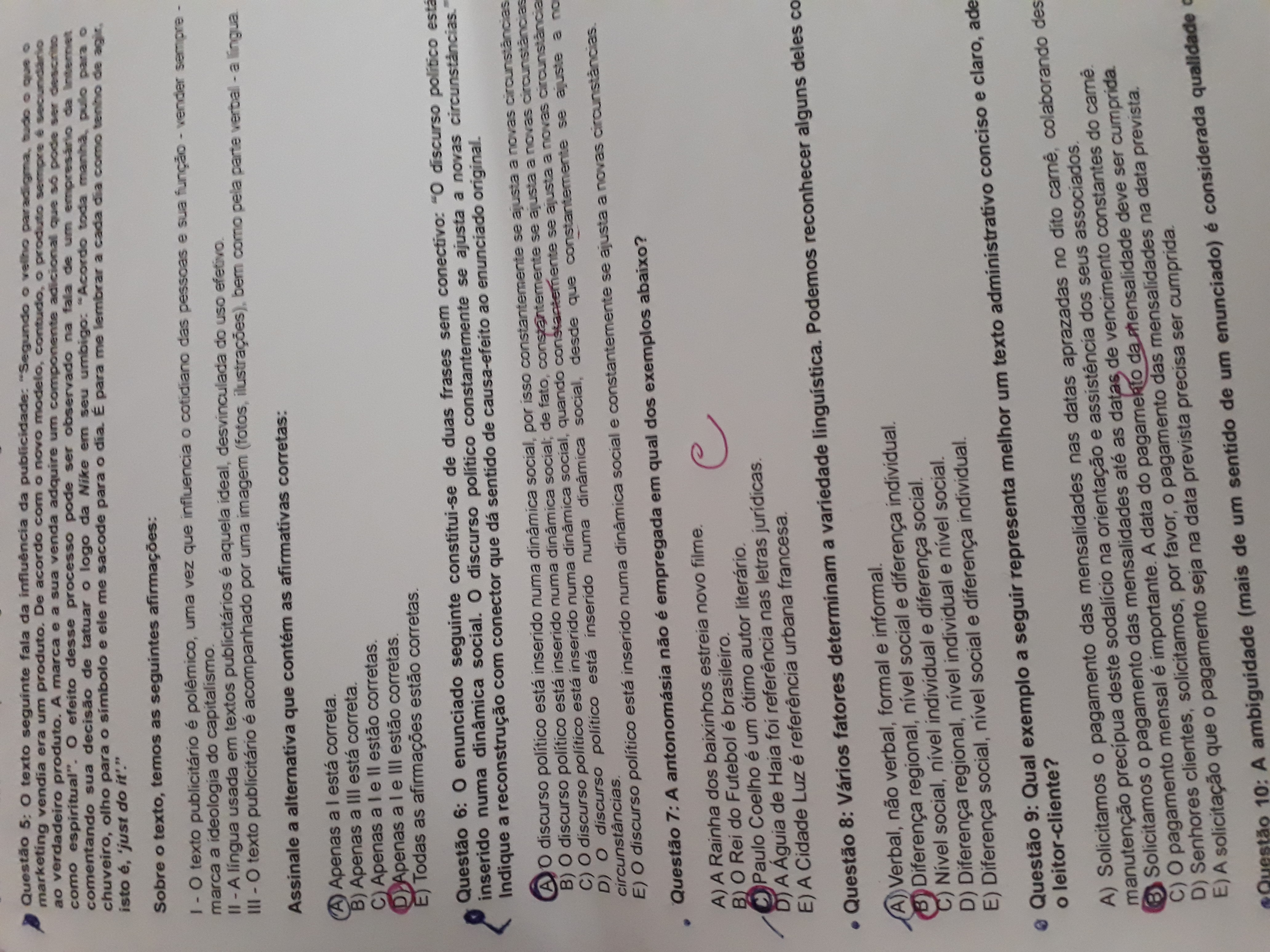 Sobre texto, temos as seguintes afirmacoes: Assinale a alternativa que contem as afirmativas corretas: - O texto e polemico, uma vez que influencia o cotidiano das pessoas e sua funcao e vender. - A lingua usada em textos publicitarios e aquela ideal, desvinculada do efetio. - O texto publicitario e acompanhado por uma imagem (fotos, ilustracoes), bem como pela parte verbal. A) Apenas a I esta correta. B) Apenas a II esta correta. C) Apenas a I e II estao corretas. D) Apenas a II e III estao corretas. E) Todas as afirmacoes estao corretas.