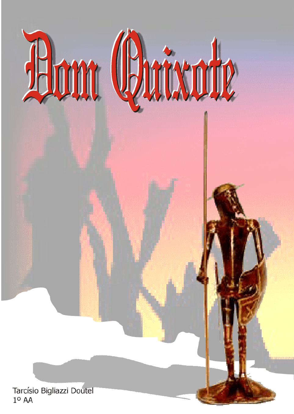 Quem foi Miguel de Cervantes? Miguel de Cervantes, nascido no século XVI, mais precisamente no ano de 1547 na cidade de Alcalá na Espanha. Filho de um pobre barbeiro não se sabe se freqüentou escola ou universidade, sabe-se que estudou retórica e gramática com um professor em Madri e que seus primeiros escritos foram sobre a vida e a morte de D. Isabel. Ele também participou da histórica batalha de Lepanto. Quando voltava para a Espanha em 1575, ficou aprisionado durante 5 anos na Argélia de onde saiu somente quando sua família e amigos pagaram uma alta quantia. Em 1597, acusado de corrupção foi preso e começou a escrever Dom Quixote. Em 1604 foi publicado Dom Quixote pela primeira vez. Nesse mesmo ano se esgotaram as cinco primeiras edições do livro. Era 1616, Miguel de Cervantes se recolheu para um mosteiro franciscano e morreu pobre. Aqui apresentamos Dom Quixote de la Mancha Numa aldeia da Mancha, vivia um fidalgo de costumes rigorosos e decadente fortuna. Dom Quesada ou Quixano envestia quase todo dinheiro que conseguia com a exploração de suas propriedades numa biblioteca, na qual, praticamente, só haviam livros de cavaleiros andantes que eram muito antigos para a época. Aos cinqüenta anos, perdeu a razão e decidiu virar cavaleiro andante. Súbio no sótão de sua casa e pegou a armadura que era de seu bisavô, mas ainda lhe faltava um cavalo. Ele tinha um pangaré, que aos seus olhos parecia um garanhão e decidiu dar-lhe o nome de Rocinante. Mas cavalheiros andantes nunca usavam o próprio nome, por isso, decidiu se chamar Dom Quixote de la Mancha. Também precisava de uma amada. Então se lembrou de Dulcinéia de Toboso. Certa madrugada armado e montado lançou-se ao mundo. Dom Quixote parte em busca de glórias Depois de cavalgar a madrugada inteira encontrou uma hospedaria onde avistou duas mulheres que pensou que fosse donzelas. Elas riram pois tinham a profissão de divertir os homens. O gordo dono da hospedaria que Dom Quixote pensou ser uma fortaleza, ofereceu sua hospitalidade alimentando-o. A graciosa maneira com que Dom Quixote é armado cavaleiro Dom Quixote pediu ao dono da hospedaria que o fizesse um cavaleiro andante. Como de costume as armas do futuro cavaleiro deviam ser veladas na capela do castelo, mas como era uma hospedaria elas foram veladas no pátio em frente à cavalariça. Depois das armas serem veladas, o estalajadeiro realizou a cerimônia com ajuda das duas mulheres. O primeiro acontecimento importante após ser armado cavaleiro Depois de sair da hospedaria pensou em voltar para casa para buscar dinheiro e no caminho viu um camponês batendo em seu criado por Ter perdido algumas ovelhas e ainda reclamar do salário atrasado. Dom Quixote tentou impedir isso obrigando o camponês a jurar que pagaria seu criado, mas quando Dom Quixote foi embora o camponês deu uma surra dez vezes pior em seu criado. Aqui continuamos narrando os feitos do nobre cavaleiro Quando retornava para casa encontrou um bando de mercadores, logo Dom Quixote parou-os e disse que eles não podiam prosseguir se não afirmassem que Dulcinéia, sua amada, era a mais bonita das donzelas. Nisso o bravo Rocinante tropeçou e derrubou Dom Quixote que com o peso de sua armadura não conseguiu levantar. Vendo a situação um dos mercadores pegou a lança de Dom Quixote e a quebrou em quatro pedaços. Não satisfeito ele pegou um dos pedaços e deu uma sova no cavaleiro que chegou em casa ferido. A solução encontrada para afastar Dom Quixote da biblioteca Enquanto Dom Quixote dormia, a ama teve a idéia de incinerar todos os livros de idéias más, e juntamente com o cura iniciaram uma minuciosa busca nos livros que deveriam ser queimados. Para evitar a fúria do fidalgo, a sobrinha inventou uma estória sobre um feiticeiro que teria roubado a biblioteca. De como Dom Quixote consegue um fiel escudeiro Depois de quinze dias em casa, parecia haver esquecido a idéia de ser cavaleiro, mas depois de conversar com seu vizinho Sancho Pança, conseguiu convence-lo de ser seu escudeiro. A incrível batalha contra os moinhos de vento Quixote e Sancho estavam a cavalgar quando avistaram uns trinta moinhos. Dom Quixote pensou serem gigantes, e ao atacar um deles foi lançado longe pela pá do moinho. Depois disso seguiram em direção de Porto Lápice em busca de aventura. A estupenda vitória sobre o cavaleiro de Biscaia Na estrada, Dom Quixote e Sancho Pança encontraram dois frades, e logo atrás uma donzela na carruagem. Quixote acreditou serem dois feiticeiros raptando uma princesa, e logo foi ao encontro dos frades derrubando um deles. Sancho decidiu pegar os pertences do frade, mas um dos moços que acompanhava a carruagem viu que o fidalgo não estava próximo e deu uma sova em Sancho. Nisso Dom Quixote entrou em combate com um sovinho que acompanhava a carruagem, no qual saiu vencedor. As conseqüências de um namorico do brioso Rocinante O cavaleiro e seu escudeiro após comer e dormir numa estalagem, continuaram à viajar. Estavam descansando, quando chegou uma tropilha de éguas conduzidas por mais de vinte pastores. Rocinante, assanhado, foi correndo em direção das éguas. Porém os vaqueiros, pensando que Rocinante estaria machucando as éguas, espancaram o pangaré. Dom Quixote em pró de ajudar seu cavalo, conseguiu ferir o primeiro pastor, embora ele e Sancho acabaram apanhando do resto. O que sucedeu ao engenhoso fidalgo na estalagem que ele teimava em chamar de castelo Depois dos dois terem levado uma sova, encontraram uma estalagem onde foram medicados e ficaram para dormir. No entanto, uma das empregadas havia combinado de se encontrar com um hóspede no mesmo quarto de Quixote e Sancho. Como o fidalgo estava acordado, quando viu a empregada sentou na cama e pensou que fosse sua amada. Quando os dois estavam na cama, aquele que esperava pela moça começou a bater no fidalgo. Nisso o dono da estalagem acordou com o barulho e chamou pela empregada, que assusta