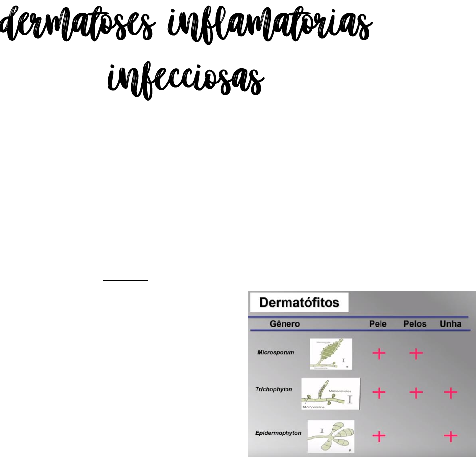 As dermatoses inflamatórias infecciosas são as dermatoses eritêmato-descamativas e verrucosas, causadas por fungos, protozoários e vírus. 1. DERMATOSES ERITÊMATO-DESCAMATIVAS 1.1. MICOSES SUPERFÍCIAIS • DERMATOFITOSES - TINHAS O termo vem do latin “Tínea” e refere-se à larva de inseto, que era considerada pelos Romanos como agente causal da infecção. São micoses superficiais e compreendem um grupo de afecções causadas por fungos, limitadas às camadas queratinizadas ou semi-queratinizadas da pele e localizadas na superfície da epiderme, pêlos ou unhas. São fungos que utilizam a queratina como fonte de subsistência. Este grupo constitui as dermatofitoses, afecções produzidas por vários gêneros de parasitas, denominados em conjunto de dermatófitos (antropo, zoo e geofílicos). Os gêneros principais que afetam a espécie humana são: Microsporum; Tricophyton e Epidermophyton. Nem todos são patogênicos. Clinicamente podem manifestar-se em distintas regiões da pele. De acordo com a área de acometimento são denominadas: Tinha do couro cabeludo, Tinha da barba, Tinha corporal, Tinha do pé e da mão, Tinha crural (períneo; regiões gluteas e parede abdominal) e Tinha das unhas (onicomicoses). Não são consideradas dermatofitoses: a candidíase (Monília sp) e a pitiríase versicolor (Pityrosporum oovale). → Tinha do Couro Cabeludo: é comum em crianças e raras em adultos. As tinhas com tonsura ou fratura da haste pilosa são causadas Microsporum spp. ou Trichophylon spp. Apresentam os cotos pilosos e descamação do couro cabeludo. Podem ser únicas ou múltiplas e têm evolução crônica. Uma forma aguda, causada geralmente por fungos zoo ou geofílicos, é o quérion. Estes agentes podem produzir grande reação inflamatória que se apresenta como placa elevada, geralmente úmida, bem delimitada e dolorosa, com pústulas e microabcessos que drenam pus à expressão. A tinha favosa é causada pela T. schoenleinii e acontece como microendemias em zonas rurais ou pequenas comunidades. DERMATOPATOLOGIA Branda de Oliveira de Lima, Turma LVI - MedUnicamp 2 Pode determinar alopecia cicatricial e, sendo causada por fungo antropofílico, tem caráter muito crônico e não tende à cura expontânea durante a adolescência, como observada na tinha tonsurante. Há também uma forma onde o favo é predominantemente descamativo e outra onde há pústulas foliculares e escamo-crostas. → Tinha da barba: é mais rara, pode apresentar-se com lesões inflamatórias que lembram o quérion ou lesões com contornos cíclicos, eritemato-vesiculosas e descamativas. Outra forma é semelhante à foliculite bacteriana. → Tinha Inguino-crural (Cruris): é comum no homem e rara na mulher. O comprometimento em geral é bilateral e pode estender-se para os glúteos e a parede abdominal, sobretudo nos imunodeficientes. Em geral, tem manifestação clínica como a descrita para as lesões do corpo. Deve ser diferenciada da dermatite seborréica desta região. → Tinha dos pés ou das mãos: A tinha dos pés, onde é mais comum (“pé de atleta”), ou das mãos pode apresentar-se nos interdígitos com prurido, descamação e maceração. Podem ocorrer fissuras ou vesículas. Em outras áreas dos pés/mãos, é, por vezes, mais descamativa e crônica. → Tinha da unha: A tinha da unha é a onicomicose por dermatófitos, inicia-se, geralmente, pela borda distal das unhas e é causada por Trichophyton spp. e Epidermophyton spp. Pode haver evolução com comprometimento de toda a lâmina ungueal de um ou mais dedos. DERMATOPATOLOGIA Branda de Oliveira de Lima, Turma LVI - MedUnicamp 3 Outros fungos, como leveduras do gênero Candida, podem também infectar as unhas. Outro diagnóstico diferencial para as unhas distróficas deve ser feito com doenças inflamatórias, como a psoríase. Portanto, é sempre necessário visualizar o dermatófito no exame micológico direto para o diagnóstico de dermatofitose ungueal. Como a sensibilidade do exame é baixa, poderá ser necessário repetir e/ou fazer a cultura do raspado da lâmina. O tratamento de micose da unha é sempre caro e demorado e o diagnóstico correto é imperativo. → Tinha do Corpo: A tinha do corpo (pele glabra) é um modelo para as outras tinhas. São causadas pelo Tricophyton rubrum, Microscoporum canis e Tricophyton mentagrophytes. As lesões são eritemato-descamativas com bordas circinadas (papulosas circulares) com essas características, enquanto o centro é da cor normal da pele pois tende a curar-se. O crescimento é centrífugo, do centro para as bordas. As bordas são a área ativa da lesão! Essas lesões podem se confluir. Caso haja descamação no centro temos que nos atentar pois pode ser que o paciente seja imunossuprimido (diabético, HIV), pois o centro deve ficar limpo. Neles, há lesões papulosas disseminadas pela pele, com muitas hifas no estrato córneo e em folículos pilosos da derme. Alterações Histopatológicas: A biópsia é feita da borda. Nela, a epiderme está muito espessada (acantose psoriasiforme) e o extrato córneo esta espessado (hiperortoceratótico compacto ou paraceratótico). Ausência da camada granulosa (agranulose). Os fungos podem ser vistos , por vêzes, como estrutras na forma de hifas refractáveis, formando espaços claros no estrato córneo (coloração pela H&E). Parece sujeira no estrato córneo, cortadas longitudinal e transversalmente. Para a demonstração adequada do fungo, pode-se utilizar a reação pelo ácido periódico de Schiff (PAS), na qual o fungo cora-se em vermelho profundo ou pelo de Grocott ou Gomori (coloração pela Prata), onde o fungo é corado em preto. Branda Destacar DERMATOPATOLOGIA Branda de Oliveira de Lima, Turma LVI - MedUnicamp 4 Os fungos podem apresentar-se na forma de: hifas filamentosas (semelhantes à linha), artrosporos (esporos formados pela fragmentação de hifas septadas) e pseudohifas (leveduras que crescem isoladamente pelo bro