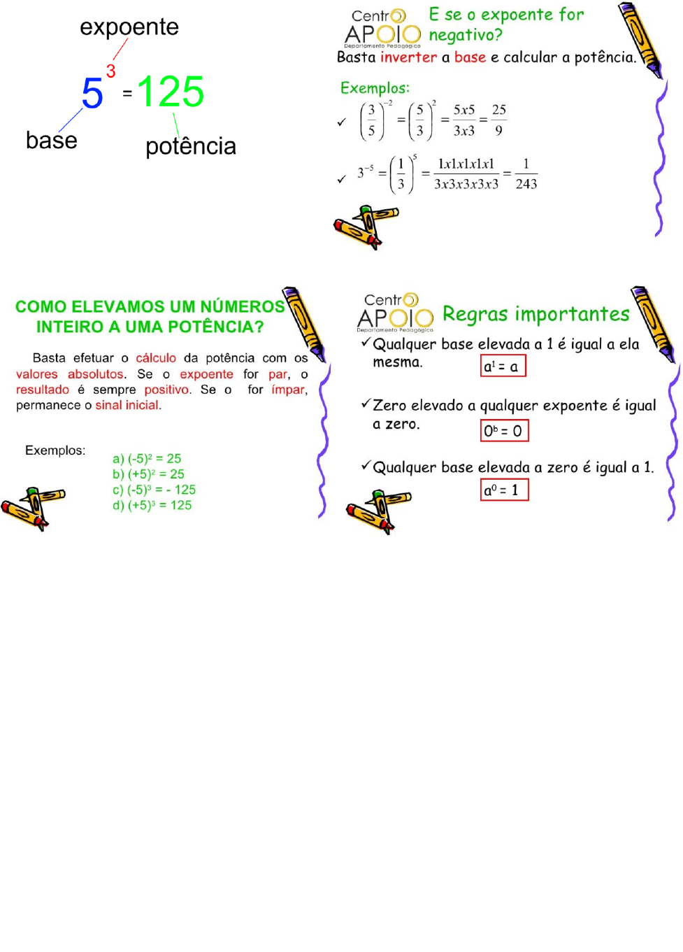 LISTA DE EXERCÍCIOS DE MATEMÁTICA PARA: 8ª ANO A , 8ª ANO B e 8ª ANO C ESC EST PROF MARIA MERIAN DOS S C FERNANDES. POTENCIAÇÃO Exercícios Potenciação 8° Ano 1- Calcule as potências ; a) (+7)²= b) (+4)² = c) (+3)-² = d) (+5)³ = e) (+2)-³ = f) (+3)³ = g) (+2)⁴ = h) (+2)⁵ = i) (-5)-² = j) (-3)² = k) (-2)³ = l) (-5)³ = m) (-1)³ = n) (-2)⁴ = o) (-3)³ = p) (-3)⁴ = 2) Calcule as potências: a) (+6)¹ = b) (-2)¹ = c) (+10)¹ = d) (-4)⁰ = e) (+7)⁰ = f) (-10)⁰ = g) (-1)⁰ = h) (+1)⁰ = i) (-1)⁴²³ = j) (-50)¹ = k) (-100)⁰ = l) 20000⁰ = 3- Em um estacionamento há 4 automóveis, em cada automóvel há 4 rodas e em cada roda há 4 parafusos. Qual é o total de parafusos desses 4 automóveis? 4- Em uma rua há duas casas e em cada casa há dois galinheiros. Em cada galinheiro há dois cercados, em cada cercado há duas galinhas, e cada galinha tem dois pintinhos. Qual o total de pintinhos dessas casas? 5- Pedro recebeu um e-mail com uma mensagem de amizade. No 1º dia ele enviou esse e- mail para 3 pessoas. Essas 3 pessoas leram no 2º dia e enviaram para mais 3 pessoas e assim sucessivamente. Quantas pessoas leram o e-mail no 4º dia considerando que todas as pessoas fizeram os procedimentos acima? 6- Um gato come 5 ratos por dia. Quantos ratos 5 gatos comem em 5 dias? 7- Mariana tinha 7 bolsas. Em cada bolsa 7 estojos. Em cada estojo 7 canetas. Quantas canetas ela tinha no total? Prof Paulo Pamphylio Exercícios Potenciação