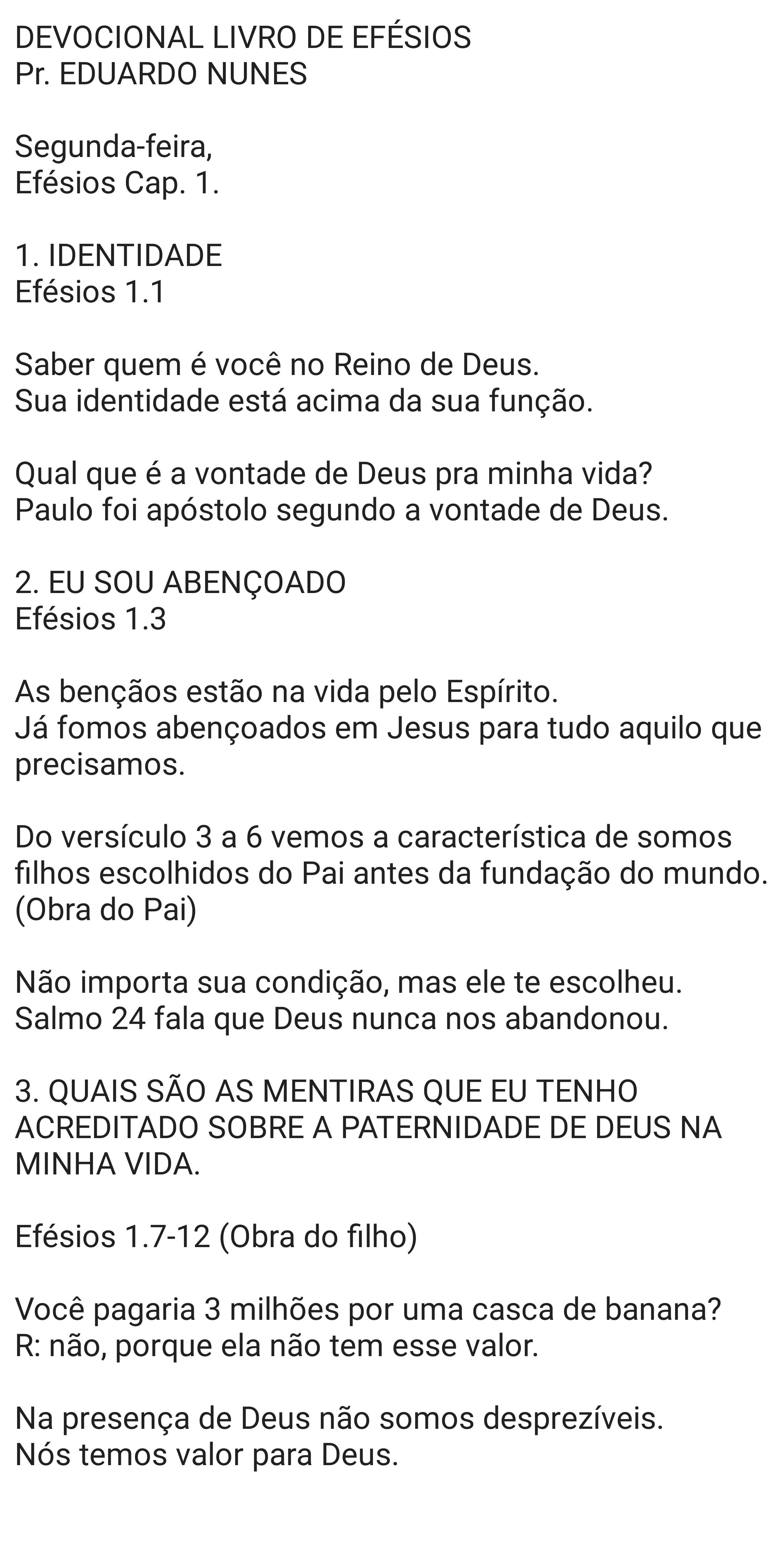 DEVOCIONAL LIVRO DE EFÉSIOS Pr. EDUARDO NUNES Segunda-feira, Efésios Cap. 1. 1. IDENTIDADE Efésios 1.1 Saber quem é você no Reino de Deus. Sua identidade está acima da sua função. Qual que é a vontade de Deus pra minha vida? Paulo foi apóstolo segundo a vontade de Deus. 2. EU SOU ABENÇOADO Efésios 1.3 As bençãos estão na vida pelo Espírito. Já fomos abençoados em Jesus para tudo aquilo que precisamos. Do versículo 3 a 6 vemos a característica de somos filhos escolhidos do Pai antes da fundação do mundo. (Obra do Pai) Não importa sua condição, mas ele te escolheu. Salmo 24 fala que Deus nunca nos abandonou. 3. QUAIS SÃO AS MENTIRAS QUE EU TENHO ACREDITADO SOBRE A PATERNIDADE DE DEUS NA MINHA VIDA. Efésios 1.7-12 (Obra do filho) Você pagaria 3 milhões por uma casca de banana? R: não, porque ela não tem esse valor. Na presença de Deus não somos desprezíveis. Nós temos valor para Deus. 4. Redenção pelo sangue de Jesus. Efésios 1.13 (Obra do Espírito Santo) Efésios 1:15-16 Fé e amor são sinais de que o Espírito Santo está fluindo em você. 5. QUEM IREI AMAR DE MANEIRA EXTRAVAGANTE. 6. SABEDORIA E REVELAÇÃO (Fé e amor) Efésios 1:17-19 Quando não sabe o que fazer, ora e peça sabedoria e Revelação para saber o seu chamado em Cristo. Não seja guiado por oportunidade. Seja guiado pelo Espírito Santo!!! 7. DIVINDA E PODER DE JESUS (JESUS É O CENTRO) Efésios 1: 20-23 Jesus está acima de qualquer problema. Precisamos ter nossos olhos iluminados para contemplar a glória de Deus. Terça-feira Efésios Cap. 2 Paulo nesse cap. Fala sobre 3 pontos especiais: 1. Nosso passado 2. A maneira como fomos comprados 3. Como fomos inseridos na família de Cristo 1. MISERICÓRDIA E AMOR DE DEUS Efésios 2:4 Só existe salvação através de Jesus. Jesus nos alcança com seu misericórdia. Quais são as mentiras do diabo que tenho acreditado na minha vida que tem roubado o amor de Deus de mim. 2. AGRADECER A DEUS Efésios 2:5 Antes estávamos errados Agora estamos sentados com Cristo Recebemos poder de Deus quando aceitamos a sua graça. 3. ASSENTADO COM CRISTO A) Bençãos Espírito Efésios 1:20 Efésios 2:6 Temos a Cristo, as bênçãos e a nós. 4. SOMOS SALVOS PELA GRAÇA Efésios 2:8-9 5. EU ESTOU EM OBRAS (SOMOS FEITURA DE DEUS) Efésios 2:10 Fomos comprados não para continuarmos a fazer a nossa obra mas sim para fazer as obras de Deus. A mesma graça que me salva me transforma!!! Ei igreja me desculpe, eu estou em obras!!! O meu corpo será glorificado. Espírito Santo quais áreas da minha vida você quer transformar na minha vida? 6. SOMOS PARTE DE UMA NOVA FAMÍLIA Efésios 2:16-19 7. TEMOS ACESSO AO PAI Quarta-feira Efésios cap 3. 1. REVELAÇÃO x INFORMAÇÃO Efésios 3:3-5 Informação : Jesus te ama Revelação : Quando essa verdade se torna experiência no seu coração e ilumina a minha mente. Precisar ter a revelação Existe um mistério que precisa ser acessado pela revelação. Viver pelo evangelho de revelação. Precisamos ter a nossa própria revelação, não basta apenas receber a revelação do seu pastor aos domingos. Quente faz a revelação é o Espírito Santo. 2. O PODER DA GRAÇA Efésios 3:6-8 Eu que sou o menor foi me dada a tarefa de pregar sobre as riquezas de Cristo. Não tem haver com você, mas tem haver com a sua fé, sobre Aquele que tem todo poder. A graça vai liberar poder para poder aperfeiçoar na sua fraqueza. Joel 3:10 diga ao fraco que sou forte. 2 coríntios 12:9-10 Quando sou fraco é que sou forte. A graça de Deus é o suficiente. Temos que ter prazer nas dificuldades, para o poder da graça Do Senhor repousar sobre nossas vidas. CHEGA DE DESCULPA!!! A GRAÇA DE DEUS ME BASTA!!!!!!!! 3. A IMPORTÂNCIA DA IGREJA Efésios 3:9-10 Através da igreja principados e potestades iram conhecer a Deus. O papel da igreja nas esferas da sociedade. O papel da igreja e o nosso papel como igreja. A igreja é o corpo, não existe o "EU" na igreja. Esteja conectado as outras partes do corpo. Esteja conectados com Cristo e o mundo vera a nossa luz!!! 4. OUSADIA NA PRESENÇA Efésios 3:12 Temos autonomia. Exemplo do yacut. O que é do Pai é meu!!! Quinta-feira 5. O PODER DA INTERCESSÃO Efésios 3:13-14 A palavra não pode ser retida. Por causa de vós me coloco de joelho. Temos que ter reverência e temos de Deus. Eu oro para que vocês sejam fortalecidos. Gap = Quando oramos e me coloco no lugar dos outros. Deixe de lado a sua necessidade. 6. SER FORTALECIDO NO HOMEM INTERIOR Efésios 3:15-17 Romanos 8:26 Nós não sabemos orar, mas o Espírito intercede por nós. Melhor ferramenta do crente é a Oração!!! 7. TE CONHECER E PROSSEGUIR EM TE CONHECER Efésios 3:18-19 Precisamos viver a plenitude do amor de Cristo. Os anjos cantam que Ele é santo!!! 8. ENTRAR NA PRESENÇA COM EXPECTATIVA Efésios 3:20 Ele é infinito em superar nossas expectativas. Quando for orar, entre com expectativas. Não casse migalha do chão, sente na mesa com o pai. Temos que orar por algo melhor do que estamos vivendo. SEXTA-FEIRA Efésios cap 4. 1. RESPONSABILIDADE Efésios 4:1-3 Não basta ter um chamado, mas precisamos andar de maneira digna. A nos cristãos foi delegado uma responsabilidade. Com grandes poderes vem grandes responsabilidades. Mansidão. Longanimidade. Preciso crescer em humildade. Espírito Santo me de mais Sabedoria. 2. UNIDADE Efésios 4:4-6 Existe algo a mais que nos une. Aprender a celebrar os diferentes aspectos do corpo de Cristo. Não estamos em uma competição dentro da igreja! Precisamos levantar o nome de Jesus!!! 3. O DOM DE CRISTO Efésios 4:7-10 A graça foi dada a cada um. Ele subia para cumprir todas as coisas, entregou todos os dons aos homens. Buscai com zelo os dons. O mundo precisa olhar para igreja e ver poder do Espírito Santo. Palavra e Espírito andam juntos, precisamos amar os dois. 4. 5 MINISTÉRIOS Efésios 4:11-13 Valorize os 5 ministérios. Nem todo mundo é pastor, apóstolo ou profeta. Precisa