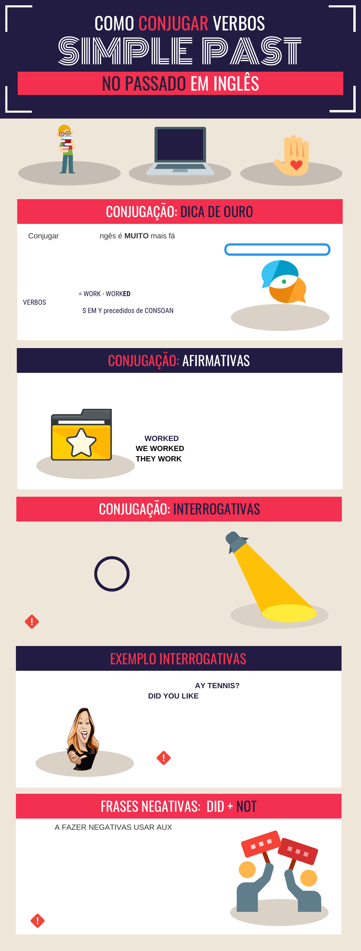 COMO CONJUGAR VERBOS SIMPLE PAST NO PASSADO EM INGLÊS Conjugar verbos em ingês é MUITO mais fácil do que em português. UM verbo igual para todas as pessoas. 2 TIPOS DE VERBOS: REGULARES E IRREGULARES CONJUGAÇÃO: DICA DE OURO I WORKED YOU WORKED HE WORKED SHE WORKED IT WORKED WE WORKED THEY WORKED CONJUGAÇÃO: AFIRMATIVAS Para fazer interrogativas precisamos usar o auxiliar: CONJUGAÇÃO: INTERROGATIVAS DID THEY PLAY TENNIS? DID YOU LIKE COFFEE? DID HE STUDY ENGLISH? DID SHE WORK IN JAPAN? EXEMPLO INTERROGATIVAS PARA FAZER NEGATIVAS USAR AUXILIARES: DID + NOT = DIDN'T FRASES NEGATIVAS: DID + NOT LIVE material exclusivo para @passeidireto REGRA GERAL: +ED = WORK - WORKED VERBOS TERMINADOS EM: E + ED = DANCE - DANCED VERBOS TERMINADOS EM Y precedidos de CONSOANTE: corta Y e +IED STUDY - STUDIED VERBOS TERMINADOS EM C+V+C - Duplica a última consoante (cvc = consoante vogal consoante SPOT - SPOTTED I STUDIED YOU STUDIED HE STUDIED SHE STUDIED IT STUDIED WE STUDIED THEY STUDIED I SPOTTED YOU SPOTTED HE SPOTTED SHE SPOTTED IT SPOTTED WE SPOTTED THEY SPOTTED DID Colocar o auxiliar antes do sujeito e o verbo VOLTA para o presente NUNCA USE DID + verbo no passado/ ou coloque S/IES/ES no verbo I DIDN'T LIKE COFFEE YOU DIDN'T GO TO JAPAN HE DIDN'T PLAY SOCCER SHE DIDN'T SPOT THE MISTAKE NUNCA USE DID + verbo no passado/ ou coloque S/IES/ES no verbo REGULARES VERBOS IRREGULARES PRECISA MEMORIZAR.