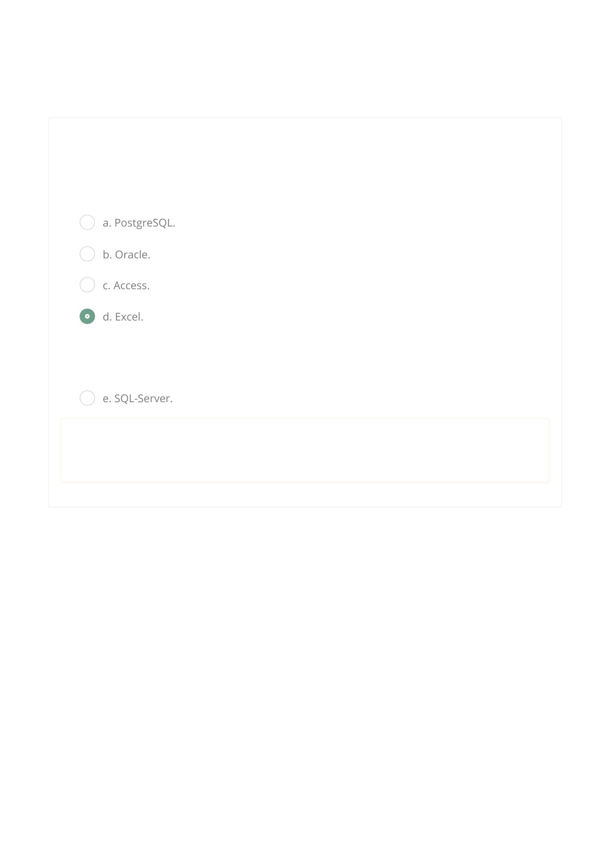 / Questão 1 Correto Apresentamos a seguir uma relação de softwares disponíveis no mercado. Assinale o único que não pode ser considerado um SGBD. Escolha uma: Sua resposta está correta. A resposta correta é: Excel.. a. PostgreSQL. b. Oracle. c. Access. Apesar de apresentar algumas funções de banco de dados, o Excel não oferece recursos su�cientes para ser considerado um sistema gerenciador de banco de dados (SGBD), como a imposição de integridade referencial, por exemplo. d. Excel. e. SQL-Server. https://aula.fael.edu.br/ / Questão 2 Incorreto “Uma das funções mais importantes em uma planilha eletrônica, quando utilizada como banco de dados, é a _________. Sem ela não seria possível trabalhar com recursos como subtotalizações, por exemplo”. Assinale a alternativa que preenche corretamente esta lacuna. Escolha uma: Sua resposta está incorreta. A resposta correta é: Classi�cação.. a. Fórmula. b. Totalização. c. Filtragem. d. Subtotalização. e. Classi�cação. https://aula.fael.edu.br/ / Questão 3 Incorreto Podemos a�rmar que a maior vantagem de se utilizar um formulário para acesso e atualização de uma tabela é: Escolha uma: Sua resposta está incorreta. A resposta correta é: Limitar a ação do usuário às regras de validação, reduzindo o risco de cadastramentos indevidos.. a. Aumentar a performance do banco de dados. b. Reordenar os dados a qualquer momento. c. Proporcionar mais beleza e estética à interface. d. Podermos inserir grá�cos. e. Limitar a ação do usuário às regras de validação, reduzindo o risco de cadastramentos indevidos. https://aula.fael.edu.br/ / Questão 4 Correto “São responsáveis por armazenar diversos dados relativos a registros, podendo ser nomes, e-mails, telefones, entre outros, tais dados estão relacionados entre si”. Estamos falando de: Escolha uma: Sua resposta está correta. A resposta correta é: Bancos de dados.. a. Arquivos de programas. b. Arquivos de dados. Em princípio pode haver dúvidas entre “bancos de dados” e “SGBD”, no entanto o enunciado se refere aos dados, e não ao programa que os processa e gerencia, como é o caso dos SGBDs. c. Bancos de dados. d. Programas compactadores de arquivos. e. SGBD. https://aula.fael.edu.br/ / Questão 5 Correto Em uma tabela, como são chamados os campos de dados (ou colunas) que servem para identi�cação única de um registro (ou linha)? Escolha uma: Sua resposta está correta. A resposta correta é: Chave primária.. a. Acumulador. A chave primária é capaz de identi�car uma única linha em uma tabela, por isso seu conteúdo jamais pode ser repetido. Já a chave estrangeira, que pode ter conteúdo repetido, identi�ca uma linha de outra tabela a qual está associada por integridade referencial. b. Chave primária. c. Chave estrangeira. d. Chave secundária. e. Contador. https://aula.fael.edu.br/ / Questão 6 Correto “As(os) ________ estão para os gerenciadores de bancos de dados (SGBDs) assim como as(os) _______ estão para os gerenciadores de planilhas eletrônicas”. Qual alternativa completa corretamente essas lacunas? Escolha uma: Sua resposta está correta. A resposta correta é: “Registros” | “linhas”.. a. “Linhas” | “registros”. b. “Células” | “colunas”. c. “Pastas” | “tabelas”. Embora o conceito não seja exatamente o mesmo, na maioria das vezes uma linha de planilha eletrônica desempenha o papel de um registro de uma tabela de banco de dados. A diferença é que as linhas de uma planilha podem mudar de formatação ou de tipo de dado a partir de uma determinada região, já os registros de um banco de dados contêm sempre os mesmos campos de dados em toda a extensão da tabela. d. “Registros” | “linhas”. e. “Tabelas” | “pastas”. https://aula.fael.edu.br/ / Questão 7 Correto Assinale a alternativa que apresenta a melhor de�nição para banco de dados. Escolha uma: Sua resposta está correta. A resposta correta é: Banco de dados é um arquivo que possui um conjunto de dados relacionados entre si, facilitando a pesquisa, já que o arquivo consegue encontrar a informação necessária através de referências.. a. Entende-se por banco de dados uma sequência de “frames” distribuídos em uma linha de tempo. b. Banco de dados é um conjunto de tabelas que contém informações, não necessariamente relacionadas entre si. c. Um banco de dados é um conjunto de dados distribuídos em linhas e colunas, de forma que se possa efetuar cálculos e outras expressões associativas entre eles. Por eliminação, embora não seja uma de�nição completa, dizer que banco de dados é um conjunto de dados relacionados entre si traduz relativamente bem o seu conceito, muito embora uma planilha também seja capaz de relacionar seus dados. d. Banco de dados é um arquivo que possui um conjunto de dados relacionados entre si, facilitando a pesquisa, já que o arquivo consegue encontrar a informação necessária através de referências. e. Entende-se por banco de dados um conjunto de instruções que podem ser executadas pelo computador de forma ordenada e previamente determinada. https://aula.fael.edu.br/ / Questão 8 Incorreto Considere duas tabelas, uma contendo informações sobre os tipos de equipamentos de uma indústria, e outra contendo os dados cadastrais de cada equipamento. Como você relacionaria essas duas tabelas em um banco de dados relacional? Escolha uma: Sua resposta está incorreta. A resposta correta é: [Tipos de Equipamentos] 1 : N [Equipamentos].. a. [Tipos de Equipamentos] N : 1 [Equipamentos]. b. [Tipos de Equipamentos] 1 : N [Equipamentos]. c. [Tipos de Equipamentos] N : N [Equipamentos]. d. [Tipos de Equipamentos] 1 : 1 [Equipamentos]. e. Não há como relacionar [Tipos de Equipamentos] e [Equipamentos]. https://aula.fael.edu.br/ / Questão 9 Incorreto Ao mudar o modo de visualização de uma consulta para o modo “Design”, o Access nos encaminha para