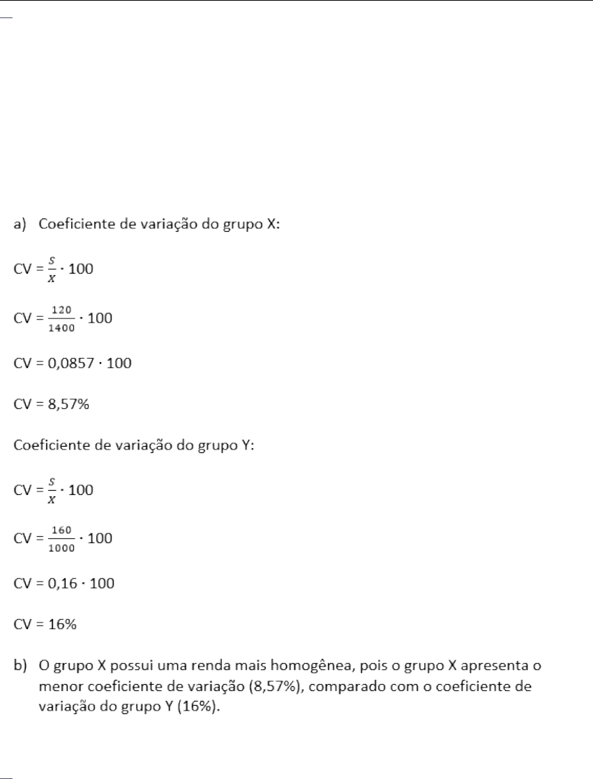 Disciplina: Estatística (MAT99) Avaliação: Avaliação Final (Discursiva) - Individual FLEX ( Cod.:650393) ( peso.:4,00) Prova: 25426758 Nota da Prova: - Parte superior do formulário 1. O coeficiente de variação é uma medida de dispersão cujo objetivo é apresentar a variabilidade da distribuição em termos percentuais. Leia a questão: a renda média mensal do grupo X é de R$ 1400,00 e do grupo Y é de R$ 1000,00. Os desvios padrões são R$ 120,00 e R$ 160,00. a) Calcule o coeficiente de variação do grupo X e o coeficiente de variação do grupo Y b) Responda: Qual grupo possui uma renda mais homogênea? Justifique a sua resposta. Resposta Esperada: Resposta esperada: 2. São cinco as fases do método estatístico: coleta de dados, crítica dos dados, apuração dos dados, apresentação dos dados e por fim, análise dos resultados. Com relação à primeira fase do método estatístico, coleta de dados, ela pode ser caracterizada em coleta indireta ou direta. A coleta direta de dados pode ser classificada em relação ao fator tempo como: contínua, periódica ou ocasional. Com base no exposto, responda: a) Explique o que é uma coleta contínua, uma coleta periódica, e uma coleta ocasional. b) Dê dois exemplos de coleta contínua, dois exemplos de coleta periódica, e dois exemplos de coleta ocasional. Resposta Esperada: a) Contínua: quando a coleta é feita continuamente. Periódica: quando a coleta é realizada em intervalos de tempo constantes. Ocasional: quando a coleta é feita ocasionalmente a fim de atender a uma conjuntura ou a uma emergência. b) Contínua: Possíveis exemplos: nascimentos, óbitos, registro da fiscalização eletrônica de velocidade. Periódica: Possíveis exemplos: censos demográficos, matrículas anuais dos estudantes. Ocasional: Possíveis exemplos: epidemias, pesquisas eleitorais, avaliações. Anexos: Parte inferior do formulário