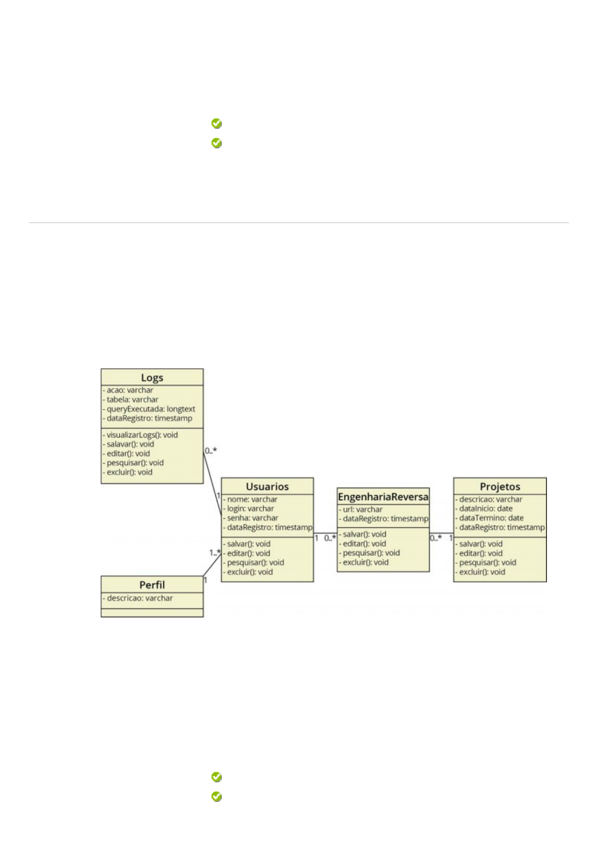 04/12/2020 Blackboard Learn https://anhembi.blackboard.com/webapps/late-Course_Landing_Page_Course_100-BBLEARN/Controller# 1/6 Pergunta 1 Resposta Selecionada: Resposta Correta: Feedback da resposta: O processo de desenvolvimento de software pode envolver diversos profissionais, bem como um conjunto de recursos para documentar um software. Dentre esses recursos, é muito comum realizar a entrevista com o cliente. Ao ter em vista os tipos de entrevista, existe uma em que o entrevistador já tem as perguntas prontas. Considerando o exposto, como se denomina esse tipo de entrevista? Entrevista fechada. Entrevista fechada. Resposta correta. A alternativa está correta, pois, durante o desenvolvimento da entrevista fechada, o analista responsável por fazer a entrevista já tem as perguntas elaboradas previamente. Nessa abordagem, ao contrário da entrevista aberta, há um roteiro a ser conduzido pelo entrevistador. Pergunta 2 Resposta Selecionada: Resposta Correta: O produto de software Smart Web Developer se refere à melhoria de produção de aplicações voltadas para web, com desenvolvimento de um novo recurso que utiliza como conceito a engenharia reversa, cujo foco é gerar relatórios dinâmicos, conversão dos dados em formato PDF. FERREIRA, V. M. da S. et al. Smart Web Developer: Uma proposta de desenvolvimento de aplicações web através de ferramenta CASE, integração e engenharia reversa em PHP. Revista Científica Digital da Faetec , v. 1, n. 1, p. 1-13, 2014. Considerando o exposto, analise o diagrama evidenciado na seguinte figura: Fonte: Ferreira et al. (2014, p. 11). A respeito das possibilidades de desenvolvimento do Smart Web Developer, analise as afirmativas a seguir e assinale V para a(s) Verdadeira(s) e F para a(s) Falsa(s). I. ( ) O Software pode ser desenvolvido em Python. II. ( ) O Software pode ser desenvolvido em PHP. III. ( ) O Software pode ser desenvolvido em JAVA. IV. ( ) O Software pode ser desenvolvido em C#. Assinale a alternativa que apresenta a sequência correta. V, V, V, V. V, V, V, V. 1 em 1 pontos 1 em 1 pontos 04/12/2020 Blackboard Learn https://anhembi.blackboard.com/webapps/late-Course_Landing_Page_Course_100-BBLEARN/Controller# 2/6 Feedback da resposta: Resposta correta. A alternativa está correta, pois o diagrama de classes tem como objetivo projetar um sistema orientado a objetos. Uma vez projetado, esse sistema pode ser implementado em qualquer uma das linguagens mencionadas nas afirmativas, bem como por qualquer outra linguagem orientada a objetos. Pergunta 3 Resposta Selecionada: Resposta Correta: Feedback da resposta: O projeto de desenvolvimento de software é realizado a partir de um conjunto de metodologias, ferramentas, boas práticas, recursos e tarefas. Dentre o processo de desenvolvimento, existe uma tarefa que é responsável por encontrar falhas e validar se o software atende aos requisitos levantados. Nesse sentido, como essa tarefa é denominada? Teste de software. Teste de software. Resposta correta. A alternativa está correta, pois a tarefa de teste de software, geralmente, compõe uma das últimas etapas antes da entrega de um produto, ou parte dele, para um cliente. Essa tarefa pode ser realizada tanto por desenvolvedores quanto por uma equipe de testes, tendo o objetivo de validar o sistema e encontrar erros. Pergunta 4 Resposta Selecionada: Resposta Correta: Feedback da resposta: O teste de software é um processo fundamental no ciclo de desenvolvimento de software. Por meio dele, é possível identificar falhas e problemas que podem comprometer o devido funcionamento da aplicação. A qualidade do software está diretamente relacionada com a boa realização das práticas de teste, tornando essa atividade de fundamental importância para os profissionais de desenvolvimento de software. JORGE, F. de F. et al. A evolução do jogo itest learning para o ensino das atividades de execução de testes de software. XX Conferência Internacional sobre Informática na Educação (TISE 2015)-Nuevas Ideas en Informática Educativa TISE, 2015. Anais (...). Há um documento que oferece suporte aos testes de sistema e tem como objetivo descrever toda a estratégia de testes utilizada. Diante do exposto, qual é o nome desse documento? Plano de Testes. Plano de Testes. Resposta correta. A alternativa está correta, pois, durante a realização do documento denominado Plano de Testes, toda a estratégia da empresa para a realização dos testes é composta. Assim, a estratégia se resume em quais tecnologias utilizar, bem como o número exato da equipe e se será realizado o teste em desenvolvimento. Ademais, o referido plano é composto pelos casos de teste, que serão distribuídos para a equipe de testadores. Pergunta 5 Leia o excerto a seguir. “Um diagrama de classes é um diagrama estrutural ou estático com o qual se modela a estrutura de um sistema de classes e que, sob vários aspectos, assemelha-se a diagramas ER. Os diagramas de classe da UML mostram as classes do sistema, os relacionamentos (inclusive herança, agregação e associação), operações e atributos das classes.” BORBA, S. de F. P; MORALES, A. B. T. Aplicação de banco de dados orientado a objetos na modelagem multidimensional. XXI Simpósio Brasileiro de Banco de Dados, p. 138, 2006. Anais (...). Referente ao exposto, analise a seguinte figura: 1 em 1 pontos 1 em 1 pontos 1 em 1 pontos 04/12/2020 Blackboard Learn https://anhembi.blackboard.com/webapps/late-Course_Landing_Page_Course_100-BBLEARN/Controller# 3/6 Resposta Selecionada: Resposta Correta: Feedback da resposta: Fonte: Borba e Morales (2006, p. 141). Em relação ao diagrama de classes e ao conceito de herança, assinale a alternativa correta. Nesse diagrama, a classe “Gerente” é uma herança da classe “Pessoa”. Nesse diagrama, a classe “Gerente” é uma herança da classe “Pessoa”. Resposta correta. A alternativa está correta, pois, ao observar e fazer uma análise do diagrama ap